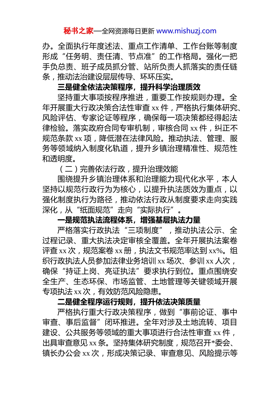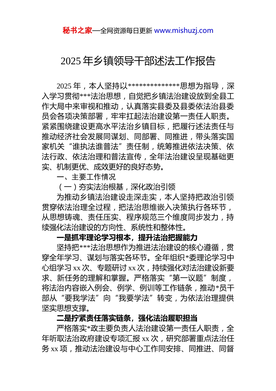 秘书之家—全网资源每日更新 www.mishuzj.com2025 年乡镇领导干部述法工作报告2025 年,本人坚持以**************思想为指导,深入学习贯彻***法治思想,自觉把乡镇法治建设放到全县工作大局中来审视和推动,认真落实县委及县委依法治县委员会各项决策部署,牢牢扛起法治建设第一责任人职责。紧紧围绕建设更高水平法治乡镇目标,把履行述法责任与推动经济社会发展同谋划、同部署、同推进,带头落实国家机关“谁执法谁普法”责任制,统筹推进依法决策、依法行政、依法治理和普法宣传,全年法治建设呈现基础更实、机制更优、成效更好的良好态势。一、主要工作情况(一)夯实法治根基,深化政治引领为推动乡镇法治建设走深走实,本人坚持把政治引领贯穿依法治理全过程,把法治思维嵌入决策执行各环节,从思想铸魂、责任压实、程序规范三个维度同步发力,持续强化法治建设的方向性、系统性和整体性。一是抓牢理论学习根本,提升法治把握能力坚持把***法治思想作为推进法治建设的核心遵循,贯穿全年学习、谋划与落实各环节。全年组织*委理论学习中心组学习 xx 次、专题研讨 xx 次,持续强化对法治建设新要求、新任务的理解和掌握。严格落实“第一议题”制度,将法治内容嵌入例会、例学、例训等工作链条,推动*员干部从“要我学法”向“我要学法”转变,为依法治理提供坚实思想支撑。二是拧紧责任落实链条,强化法治履职担当严格落实*政主要负责人法治建设第一责任人职责,全年听取法治政府建设专项汇报 xx 次,研究部署重点法治任务 xx 项,推动法治建设与中心工作同安排、同推进、同督秘书之家—全网资源每日更新 www.mishuzj.com办。全面执行年度述法、重点工作清单、工作台账等制度形成“任务明、责任清、节点准”的工作格局。强化一把手负总责、班子成员抓分管、站所负责人抓落实的责任链条,推动法治建设层层传导、环环压实。三是健全依法决策程序,提升科学治理质效坚持重大事项按程序推进,重要工作按规则办理。全年开展重大行政决策合法性审查 xx 件,严格执行集体研究、风险评估、专家论证等程序,确保每一项决策都经得起法律检验。落实政府合同专审机制,审核合同 xx 件,纠正不规范条款 xx 项,降低潜在法律风险。推动执法、管理、服务等领域纳入制度化轨道,提升乡镇治理精准性、规范性和透明度。(二)完善依法行政,提升治理效能围绕提升乡镇治理体系和治理能力现代化水平,本人坚持以规范行政行为为核心,以提升执法质效为重点,以强化制度执行为路径,推动依法行政从制度要求走向实践深化,从“纸面规范”走向“实际执行”。一是规范执法流程体系,增强基层执法力量严格落实行政执法“三项制度”,推动执法公示、全过程记录、重大执法决定审核全覆盖。全年开展执法案卷评查 xx 次,规范案卷 xx 册,执法文书规范率达到 xx%。组织行政执法人员参加法律业务培训 xx 场次、参训 xx 人次,确保“持证上岗、亮证执法”要求执行到位。重点围绕安全生产、生态环保、市场监管、土地管理等关键领域开展专项执法 xx 次,有效防范风险隐患。二是健全程序运行规则,提升依法决策质量严格执行重大行政决策程序,做到“事前论证、事中审查、事后监督”闭环推进。全年对涉及土地流转、项目建设、公共服务等领域的重大事项进行合法性审查 xx 件,出具审查意见 xx 条。坚持集体研究制度,规范召开*委会、镇长办公会 xx 次,形成决策记录、审查意见、风险提示等秘书之家—全网资源每日更新 www.mishuzj.com材料 xx 份,确保每一项决策都有法可依、依规可查、责任可溯。三是强化制度落实监督,提升规范管理能力坚持以制度执行推动政府效能提升,全面梳理行政管理制度 xx 项,修订完善 xx 项,废止不适宜执行 xx 项,推动制度体系更趋准确、衔接更趋严密。严格落实政府合同管理制度,全年审核合同 xx 件,修订风险条款 xx 项,有效避免潜在法律风险。加强重点岗位监督,对土地审批、财政资金、村级事务等开展专项督查 xx 次,推动制度执行从“被动遵守”走向“主动落实”。(三)拓宽普法路径,增强群众认同坚持把普法工作融入基层治理实...