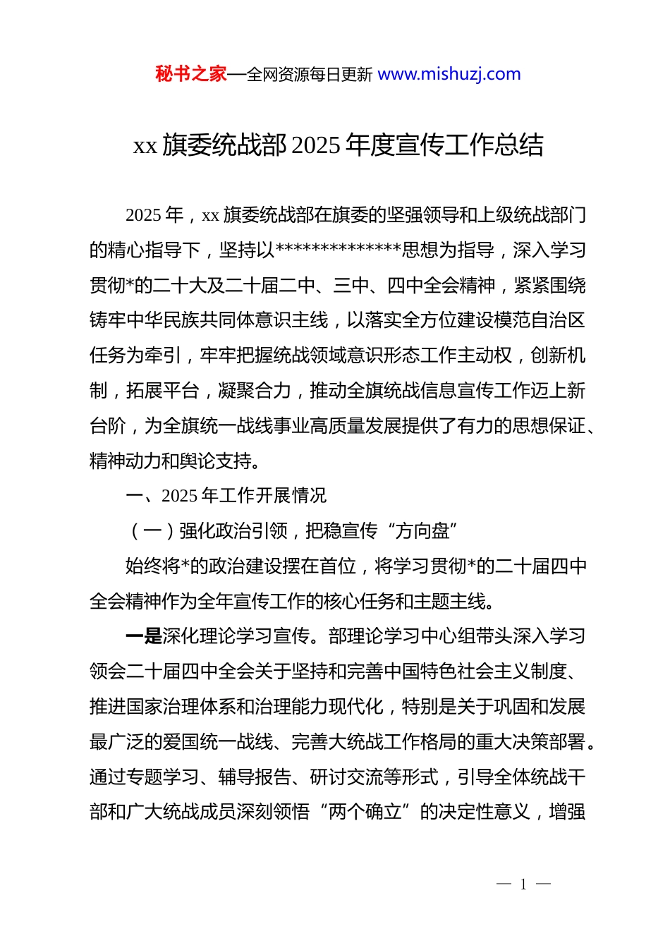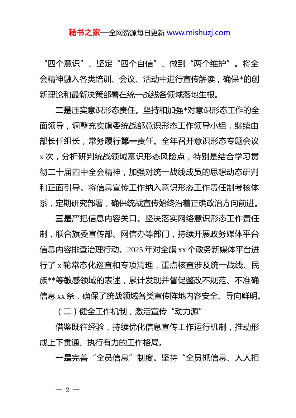 秘书之家—全网资源每日更新 www.mishuzj.comxx 旗委统战部 2025 年度宣传工作总结2025 年,xx 旗委统战部在旗委的坚强领导和上级统战部门的精心指导下,坚持以**************思想为指导,深入学习贯彻*的二十大及二十届二中、三中、四中全会精神,紧紧围绕铸牢中华民族共同体意识主线,以落实全方位建设模范自治区任务为牵引,牢牢把握统战领域意识形态工作主动权,创新机制,拓展平台,凝聚合力,推动全旗统战信息宣传工作迈上新台阶,为全旗统一战线事业高质量发展提供了有力的思想保证、精神动力和舆论支持。一、2025 年工作开展情况(一)强化政治引领,把稳宣传“方向盘”始终将*的政治建设摆在首位,将学习贯彻*的二十届四中全会精神作为全年宣传工作的核心任务和主题主线。一是深化理论学习宣传。部理论学习中心组带头深入学习领会二十届四中全会关于坚持和完善中国特色社会主义制度、推进国家治理体系和治理能力现代化,特别是关于巩固和发展最广泛的爱国统一战线、完善大统战工作格局的重大决策部署。通过专题学习、辅导报告、研讨交流等形式,引导全体统战干部和广大统战成员深刻领悟“两个确立”的决定性意义,增强— 1 —秘书之家—全网资源每日更新 www.mishuzj.com“四个意识”、坚定“四个自信”、做到“两个维护”。将全会精神融入各类培训、会议、活动中进行宣传解读,确保*的创新理论和最新决策部署在统一战线各领域落地生根。二是压实意识形态责任。坚持和加强*对意识形态工作的全面领导,调整充实旗委统战部意识形态工作领导小组,继续由部长任组长,常务履行第一责任。全年召开意识形态专题会议x 次,分析研判统战领域意识形态风险点,特别是结合学习贯彻二十届四中全会精神,加强对统一战线成员的思想动态研判和正面引导。将信息宣传工作纳入意识形态工作责任制考核体系,定期研究部署,确保统战宣传始终沿着正确政治方向前进。三是严把信息内容关口。坚决落实网络意识形态工作责任制,联合旗委宣传部、网信办等部门,持续开展政务媒体平台信息内容排查治理行动。2025 年对全旗 xx 个政务新媒体平台进行了 x 轮常态化巡查和专项清理,重点核查涉及统一战线、民族**等敏感领域的表述,累计发现并督促整改不规范、不准确信息 xx 条,确保了统战领域各类宣传阵地内容安全、导向鲜明。(二)健全工作机制,激活宣传“动力源”借鉴既往经验,持续优化信息宣传工作运行机制,推动形成上下贯通、执行有力的工作格局。一是完善“全员信息”制度。坚持“全员抓信息、人人担— 2 —秘书之家—全网资源每日更新 www.mishuzj.com责任”的工作理念,进一步健全以部机关各股室、各苏木乡镇(街道)统战委员、各部门单位统战工作联络员、各领域统战成员代表为骨干的信息员网络。明确量化任务,苏木乡镇每周至少报送信息 x 条,旗直部门每周至少报送 x 条,重点统战团体每月至少报送 x 条。信息员队伍动态管理,定期培训,业务能力得到提升。二是严格执行审核流程。夯实信息稿件“拟稿人初审、股室负责人二审、分管领导终审”的三级审核责任制,特别对重大政策解读、重要活动报道、典型经验宣传等稿件,增加部主要负责同志审签环节,确保信息发布的政治性、真实性、准确性、规范性和时效性。全年未发生因审核不严导致的宣传事故。三是强化考核激励导向。修订完善《xx 旗统战信息宣传工作考核评价办法》,将信息报送数量、质量、采用层级(旗级、市级、省级、国家级)以及宣传平台影响力等指标,更加科学地纳入各苏木乡镇、旗直各部门年度统战工作考核和“五位一体”综合考评范畴。坚持季度通报、年度总评,2025 年通报表扬信息工作先进单位 xx 个、优秀信息员 xx 名,并予以适当物质奖励,有效激发了各单位和个人的投稿积极性。(三)聚焦主题主线,唱响宣传“主旋律”紧紧围绕*中央决策部署和全旗中心工作,策划系列主题宣— 3 —秘书之家—全网资源每日更新 www.mishuzj.com传,提升统战工作的显示度和影响力。一是突出主线宣传。将铸牢中华民族共同体意识宣传教育工作贯穿全年,作为重中之重。在“民族政策宣传月”“民族团结进步活...