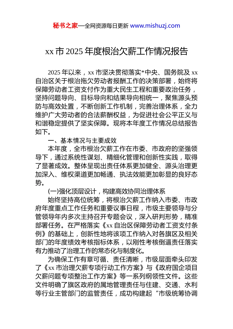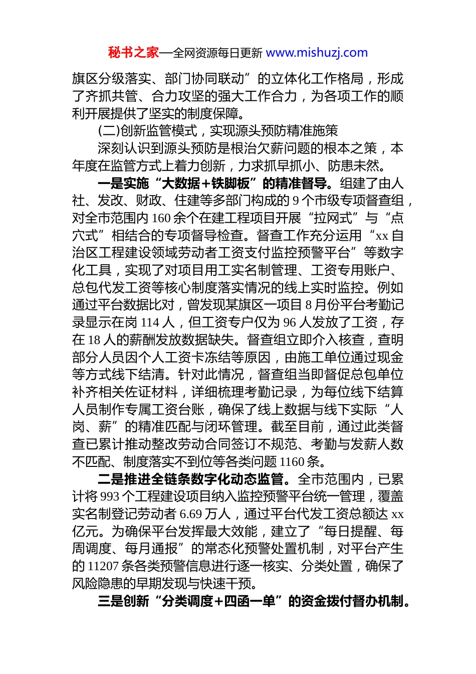 秘书之家—全网资源每日更新 www.mishuzj.comxx 市 2025 年度根治欠薪工作情况报告2025 年以来,xx 市坚决贯彻落实*中央、国务院及 xx自治区关于根治拖欠劳动者报酬工作的决策部署,始终将保障劳动者工资支付作为重大民生工程和重要政治任务,坚持问题导向、目标导向和结果导向相统一,聚焦源头预防与高效处置,不断创新工作机制,完善治理体系,全力维护广大劳动者的合法薪酬权益,为促进社会公平正义与和谐稳定提供了坚实保障。现将本年度工作情况总结报告如下。一、基本情况与主要成效本年度,全市根治欠薪工作在市委、市政府的坚强领导下,通过系统性谋划、精细化管理和创新性实践,取得了显著成效。整体呈现出责任体系更加健全、源头治理更加深入、维权渠道更加畅通、执法效能更加彰显的良好态势。(一)强化顶层设计,构建高效协同治理体系始终坚持高位统筹,将根治欠薪工作纳入市委、市政府年度重点工作任务和重要议事日程,市级主要领导与分管领导年内多次主持召开专题会议,深入研判形势,精准部署任务。在严格落实《xx 自治区保障劳动者工资支付条例》的基础上,创新性地将该项工作纳入对各旗区及相关部门的年度绩效考核指标体系,以刚性考核倒逼责任落实有力推动了治理工作的常态化与制度化。为确保工作有章可循、责任清晰,市级层面牵头印发了《xx 市治理欠薪专项行动工作方案》与《政府国企项目欠薪问题专项整治工作方案》等一系列纲领性文件。这些文件明确了旗区政府的属地管理责任与住建、交通、水利等行业主管部门的监管责任,成功构建起“市级统筹协调秘书之家—全网资源每日更新 www.mishuzj.com旗区分级落实、部门协同联动”的立体化工作格局,形成了齐抓共管、合力攻坚的强大工作合力,为各项工作的顺利开展提供了坚实的制度保障。(二)创新监管模式,实现源头预防精准施策深刻认识到源头预防是根治欠薪问题的根本之策,本年度在监管方式上着力创新,力求抓早抓小、防患未然。一是实施“大数据+铁脚板”的精准督导。组建了由人社、发改、财政、住建等多部门构成的 9 个市级专项督查组,对全市范围内 160 余个在建工程项目开展“拉网式”与“点穴式”相结合的专项督导检查。督查工作充分运用“xx 自治区工程建设领域劳动者工资支付监控预警平台”等数字化工具,实现了对项目用工实名制管理、工资专用账户、总包代发工资等核心制度落实情况的线上实时监控。例如通过平台数据比对,曾发现某旗区一项目 8 月份平台考勤记录显示在岗 114 人,但工资专户仅为 96 人发放了工资,存在 18 人的薪酬发放数据缺失。督查组立即介入核查,查明部分人员因个人工资卡冻结等原因,由施工单位通过现金等方式线下结清。针对此情况,督查组当即督促总包单位补齐相关佐证材料,详细梳理考勤记录,为每位线下结算人员制作专属工资台账,确保了线上数据与线下实际“人岗、薪”的精准匹配与闭环管理。截至目前,通过此类督查已累计推动整改劳动合同签订不规范、考勤与发薪人数不匹配、制度落实不到位等各类问题 1160 条。二是推进全链条数字化动态监管。全市范围内,已累计将 993 个工程建设项目纳入监控预警平台统一管理,覆盖实名制登记劳动者 6.69 万人,通过平台代发工资总额达 xx亿元。为确保平台发挥最大效能,建立了“每日提醒、每周调度、每月通报”的常态化预警处置机制,对平台产生的 11207 条各类预警信息进行逐一核实、分类处置,确保了风险隐患的早期发现与快速干预。三是创新“分类调度+四函一单”的资金拨付督办机制。秘书之家—全网资源每日更新 www.mishuzj.com针对各项目工资发放日期约定不一、人工费用拨付易出现延迟的现实问题,独创了“分类调度、精准督导”工作法按照项目约定的“每月 10 日、15 日、20 日、25 日、30 日前发放工资”等不同时间节点,建立分类管理台账,实施动态跟踪。尤其紧盯政府投资和国有企业投资项目这一关键领域,综合运用提醒函、催办函、督办函、约谈函和工作提示单的“四函一单”工具箱,强力督促建设单位严格按照施工合同约定,按时足额向工资专户拨付人工费用。今年 7 月,在监控中发现某重...