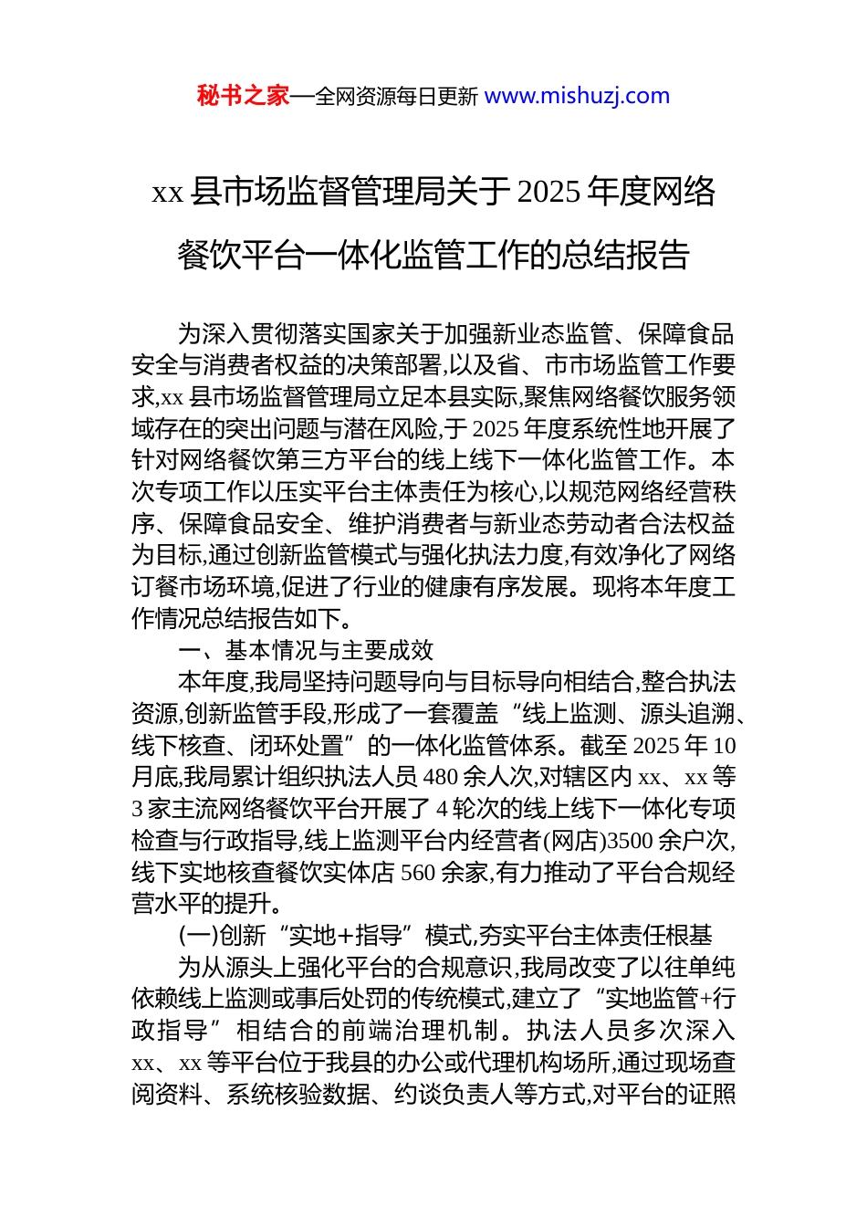 秘书之家—全网资源每日更新 www.mishuzj.comxx 县市场监督管理局关于 2025 年度网络餐饮平台一体化监管工作的总结报告为深入贯彻落实国家关于加强新业态监管、保障食品安全与消费者权益的决策部署,以及省、市市场监管工作要求,xx 县市场监督管理局立足本县实际,聚焦网络餐饮服务领域存在的突出问题与潜在风险,于 2025 年度系统性地开展了针对网络餐饮第三方平台的线上线下一体化监管工作。本次专项工作以压实平台主体责任为核心,以规范网络经营秩序、保障食品安全、维护消费者与新业态劳动者合法权益为目标,通过创新监管模式与强化执法力度,有效净化了网络订餐市场环境,促进了行业的健康有序发展。现将本年度工作情况总结报告如下。一、基本情况与主要成效本年度,我局坚持问题导向与目标导向相结合,整合执法资源,创新监管手段,形成了一套覆盖“线上监测、源头追溯、线下核查、闭环处置”的一体化监管体系。截至 2025 年 10月底,我局累计组织执法人员 480 余人次,对辖区内 xx、xx 等3 家主流网络餐饮平台开展了 4 轮次的线上线下一体化专项检查与行政指导,线上监测平台内经营者(网店)3500 余户次,线下实地核查餐饮实体店 560 余家,有力推动了平台合规经营水平的提升。(一)创新“实地+指导”模式,夯实平台主体责任根基为从源头上强化平台的合规意识,我局改变了以往单纯依赖线上监测或事后处罚的传统模式,建立了“实地监管+行政指导”相结合的前端治理机制。执法人员多次深入xx、xx 等平台位于我县的办公或代理机构场所,通过现场查阅资料、系统核验数据、约谈负责人等方式,对平台的证照秘书之家—全网资源每日更新 www.mishuzj.com信息、内部管理制度建设、商户入驻审核流程、客诉处理机制、配送人员管理等情况进行全面检查。在检查过程中,同步开展普法宣传与行政指导,向平台方详细解读《中华人民共和国食品安全法》《网络交易监督管理办法》等法律法规,明确平台在资质审核、信息公开、消费维权、食品安全保障等方面的法律责任,引导平台从“被动接受监管”向“主动合规经营”转变,从根本上夯实其依法经营的基础。(二)严守经营主体准入关,全面规范网络交易秩序针对网络餐饮行业长期存在的无证经营、超范围经营等乱象,我局将规范主体资格作为监管工作的重中之重。工作中,严格要求平台落实《网络交易监督管理办法》关于“亮照、亮证、亮规则”的规定,督促平台建立并完善入驻商户的电子档案台账,对申请入驻的餐饮服务提供者进行严格的资质审查,确保其具备有效的《营业执照》和《食品经营许可证》。我局通过线上随机抽查与线下靶向核查相结合的方式,对平台内经营者的主体信息、证照公示情况、经营项目与许可范围的一致性进行持续监控。本年度,督促平台清理不合规商户 130 余家,实现了辖区内平台亮证照率、明码标价率接近 100%的目标。同时,要求平台建立通畅的在线投诉和售后维权渠道,保障消费者的知情权与监督权,营造了透明、诚信的网络订餐环境。(三)聚焦全链条食品安全,构筑“舌尖上”的严密防线食品安全是网络餐饮监管的生命线。我局将监管链条从后厨延伸至配送终端,着力构建全过程、全链条的食品安全风险防控体系。一是强化后厨源头管理。督促平台运用技术手段与用户评价反馈机制,对入网餐饮服务提供者的食品加工制作过程进行监督,严禁销售过期变质、来源不明的食品,严禁在网上非法销售野生动物及其制品。二是推广“食安封签”制度。为防止餐品在配送过程中受到二次污染或被人为拆动,我局大力倡导并鼓励入网餐秘书之家—全网资源每日更新 www.mishuzj.com饮单位使用“食安封签”。通过向平台、商户和消费者三方宣传“食安封签”的重要性,引导其成为行业标配,本年度辖区内主要商户的“食安封签”使用率已提升至 85%以上。三是规范配送过程卫生。明确要求平台加强对配送装备的卫生管理,建立配送箱、车辆等设备的常态化清洁消毒制度并留存记录,有效防止病毒细菌滋生,确保配送环节的安全。(四)保障多方合法权益,促进业态和谐健康发展网络餐饮经济涉及平台、商户、消费者和外卖骑手等多方主体,保障各方权益是实现行业可持续发展的前提。在消费者权益保护方面,我...