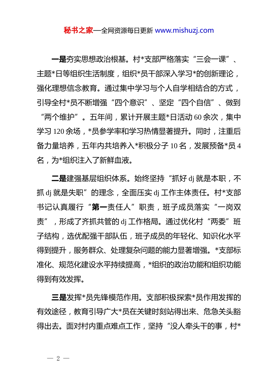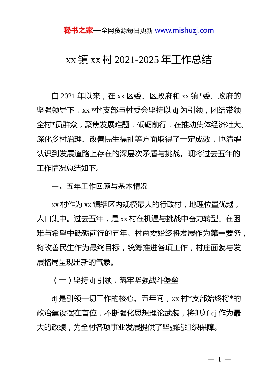 秘书之家—全网资源每日更新 www.mishuzj.comxx 镇 xx 村 2021-2025 年工作总结自 2021 年以来,在 xx 区委、区政府和 xx 镇*委、政府的坚强领导下,xx 村*支部与村委会坚持以 dj 为引领,团结带领全村*员群众,聚焦发展难题,砥砺前行,在推动集体经济壮大、深化乡村治理、改善民生福祉等方面取得了一定成效,也清醒认识到发展道路上存在的深层次矛盾与挑战。现将过去五年的工作情况总结如下。一、五年工作回顾与基本情况xx 村作为 xx 镇辖区内规模最大的行政村,地理位置优越,人口集中。过去五年,是 xx 村在机遇与挑战中奋力转型、在困难与希望中砥砺前行的五年。村两委始终将发展作为第一要务,将改善民生作为最终目标,统筹推进各项工作,村庄面貌与发展格局呈现出新的气象。(一)坚持 dj 引领,筑牢坚强战斗堡垒dj 是引领一切工作的核心。五年间,xx 村*支部始终将*的政治建设摆在首位,不断强化思想理论武装,将抓好 dj 作为最大的政绩,为全村各项事业发展提供了坚强的组织保障。— 1 —秘书之家—全网资源每日更新 www.mishuzj.com一是夯实思想政治根基。村*支部严格落实“三会一课”、主题*日等组织生活制度,组织*员干部深入学习*的创新理论,强化理想信念教育。通过集中学习与个人自学相结合的方式,引导全村*员不断增强“四个意识”、坚定“四个自信”、做到“两个维护”。五年间,累计开展主题*日活动 60 余次,集中学习 120 余场,*员参学率和学习热情显著提升。同时,注重后备力量培养,五年内共培养入*积极分子 10 名,发展预备*员 4名,为*组织注入了新鲜血液。二是建强基层组织体系。始终坚持“抓好 dj 就是本职,不抓 dj 就是失职”的理念,全面压实 dj 工作主体责任。村*支部书记认真履行“第一责任人”职责,班子成员落实“一岗双责”,形成了齐抓共管的 dj 工作格局。通过优化村“两委”班子结构,选优配强干部队伍,班子成员的年轻化、知识化水平得到提升,服务群众、处理复杂问题的能力显著增强。*支部标准化、规范化建设水平持续提高,*组织的政治功能和组织功能得到有效发挥。三是发挥*员先锋模范作用。支部积极探索*员作用发挥的有效途径,教育引导广大*员在关键时刻站得出来、危急关头豁得出去。面对村内重点难点工作,坚持“没人牵头干的事,村*— 2 —秘书之家—全网资源每日更新 www.mishuzj.com支部就带头动员,老百姓不愿意干的事,*员就站出来带头干”的原则。在产业发展、环境整治、疫情防控、服务特殊群体等方面,广大无职*员积极响应号召,组建志愿服务队,主动联系帮扶困难群众,调解邻里纠纷,以实际行动擦亮了*员身份,赢得了群众的广泛赞誉。(二)聚焦产业发展,驱动集体经济壮大发展壮大村级集体经济是实现乡村振兴的必由之路。xx 村立足自身优势,直面曾经作为“空壳村”的历史困境,通过盘活存量资产、创新发展模式,逐步构建起以租赁产业为基石、多元经济形态为补充的集体经济新格局。一是稳固租赁产业“压舱石”。作为村集体经济的主要收入来源,租赁产业在过去五年中发挥了至关重要的作用。村集体利用区位优势,将闲置土地、旧厂房等资产进行整合盘活,通过招商引资建设标准化厂房、商铺、仓储设施对外出租,形成了稳定的“瓦片经济”。这一模式不仅为村集体带来了持续的现金流,也为本地居民创造了大量的就业岗位。尽管后期面临收款难题,但在发展初期,租赁产业的确是推动 xx 村摆脱贫困、实现积累的关键一招。— 3 —秘书之家—全网资源每日更新 www.mishuzj.com二是探索多元经济“新路径”。在巩固租赁产业的同时,村两委积极响应乡村振兴战略,推动一二三产业融合发展。一方面,依托现代农业设施,发展温室大棚种植等高效农业增加了村民的经营性收入。另一方面,深度挖掘乡村价值,大力发展乡村旅游。通过打造民俗文化村,xx 村成功转型为远近闻名的“网红村”,吸引了大量游客前来观光体验。在此基础上,创新性地培育了“地摊经济”“观光经济”“冰雪经济”以及鼓励村民创业的“微创客”等多种经济模式,有效拓宽了集体和村民的增收渠道。三是共享经济发展“红...