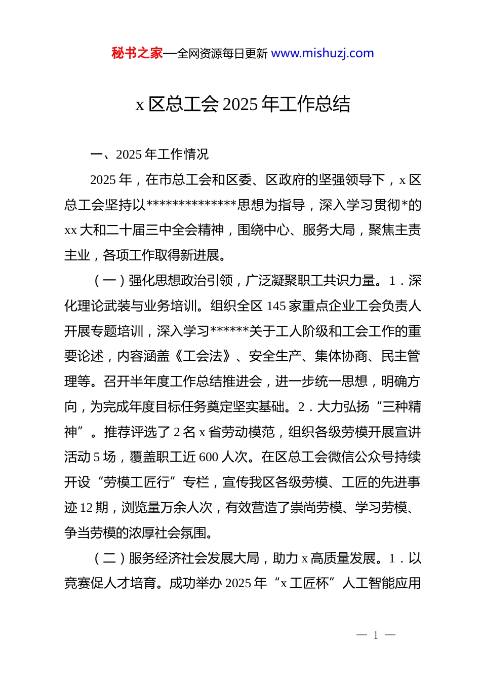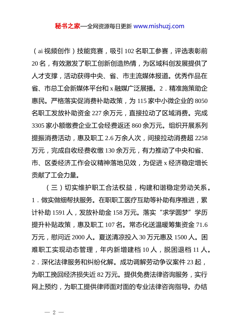秘书之家—全网资源每日更新 www.mishuzj.comx 区总工会 2025 年工作总结一、2025 年工作情况2025 年,在市总工会和区委、区政府的坚强领导下,x 区总工会坚持以**************思想为指导,深入学习贯彻*的xx 大和二十届三中全会精神,围绕中心、服务大局,聚焦主责主业,各项工作取得新进展。(一)强化思想政治引领,广泛凝聚职工共识力量。1.深化理论武装与业务培训。组织全区 145 家重点企业工会负责人开展专题培训,深入学习******关于工人阶级和工会工作的重要论述,内容涵盖《工会法》、安全生产、集体协商、民主管理等。召开半年度工作总结推进会,进一步统一思想,明确方向,为完成年度目标任务奠定坚实基础。2.大力弘扬“三种精神”。推荐评选了 2 名 x 省劳动模范,组织各级劳模开展宣讲活动 5 场,覆盖职工近 600 人次。在区总工会微信公众号持续开设“劳模工匠行”专栏,宣传我区各级劳模、工匠的先进事迹 12 期,浏览量万余人次,有效营造了崇尚劳模、学习劳模、争当劳模的浓厚社会氛围。(二)服务经济社会发展大局,助力 x 高质量发展。1.以竞赛促人才培育。成功举办 2025 年“x 工匠杯”人工智能应用— 1 —秘书之家—全网资源每日更新 www.mishuzj.com(ai 视频创作)技能竞赛,吸引 102 名职工参赛,评选表彰前20 名,有效激发了职工创新创造热情,为区域科创发展提供了人才支撑,活动获得中央、省、市主流媒体报道。优秀作品在省、市总工会新媒体平台和 x 融媒广泛展播。2.精准施策助企惠民。严格落实促消费补助政策,为 115 家中小微企业的 8050名职工发放补助资金 227 余万元,直接拉动了区域消费。完成3305 家小额缴费企业工会经费返还 860 余万元。组织开展系列提振消费活动,惠及职工 2.6 万余人次,间接拉动消费超 2258万元,完成自收经费收缴 130 余万元,有力推动了中央和省、市、区委经济工作会议精神落地见效,为促进 x 经济稳定增长贡献了工会力量。(三)切实维护职工合法权益,构建和谐稳定劳动关系。1.做实做细帮扶服务。在职职工医疗互助等补助有序推进,累计补助 1591 人,发放补助金 158 万元。落实“求学圆梦”学历提升补贴政策,惠及职工 107 名。常态化送温暖筹集资金 71.6万元,慰问近 2000 人。夏送清凉投入 30 万元惠及 1500 人。困难职工实现动态管理,年内新增建档 10 人,脱困退档 11 人。2.深化法律服务和纠纷化解。成功调解劳动争议案件 23 起,为职工挽回经济损失近 82 万元。提供免费法律咨询服务,实行网上预约,为职工提供律师面对面的专业法律咨询指导。办结— 2 —秘书之家—全网资源每日更新 www.mishuzj.com12351 热线及网络舆情案件 37 件。组织工会干部在 x 工匠学院x 分院举办了一期劳动争议多元化解的专题培训班。深入企业等基层一线,组织开展“劳动用工法治体检”、普法宣传等活动 14 场,覆盖职工超 3500 人。微信公众号开设“尊法守法·携手筑梦”普法专栏,宣传 23 期。“工会+人社”联动调解机制高效运行,成功通过“调裁直通”机制快速处理纠纷。推动1091 家企业建立工会劳动法律监督组织,覆盖率达 90%。相关创新案例获得省、市认可。3.推动集体协商提质增效。全区共签订工资集体协议 130 份,覆盖企业 812 家,覆盖职工 26850人,积极指导企业签订能级协商专项协议和科技创新专项协议,申报省级能级协商企业 1 家(中建二局一公司华中分公司),市级能级协商企业 1 家(x 普菲克生物科技有限公司)。(四)提升职工生活品质,增强职工幸福感获得感。1.拓展就业服务渠道。组织参加“春风行动”招聘会,达成就业意向近 300 人。充分利用全国工会就业服务平台发布岗位信息。创新开展“工会主席直播带岗”活动,提供岗位 88 个,吸引超万人次观看。实施“一户一产业工人”培养工程,开展育婴员、家政服务、人工智能训练师等职业技能培训,切实帮助职工就业和提升职业技能。2.优化服务阵地建设。新建工会驿站 6 个,提质升级 2 个,全区驿站达 36 家。依托驿站开展节日慰问、义— 3 ...