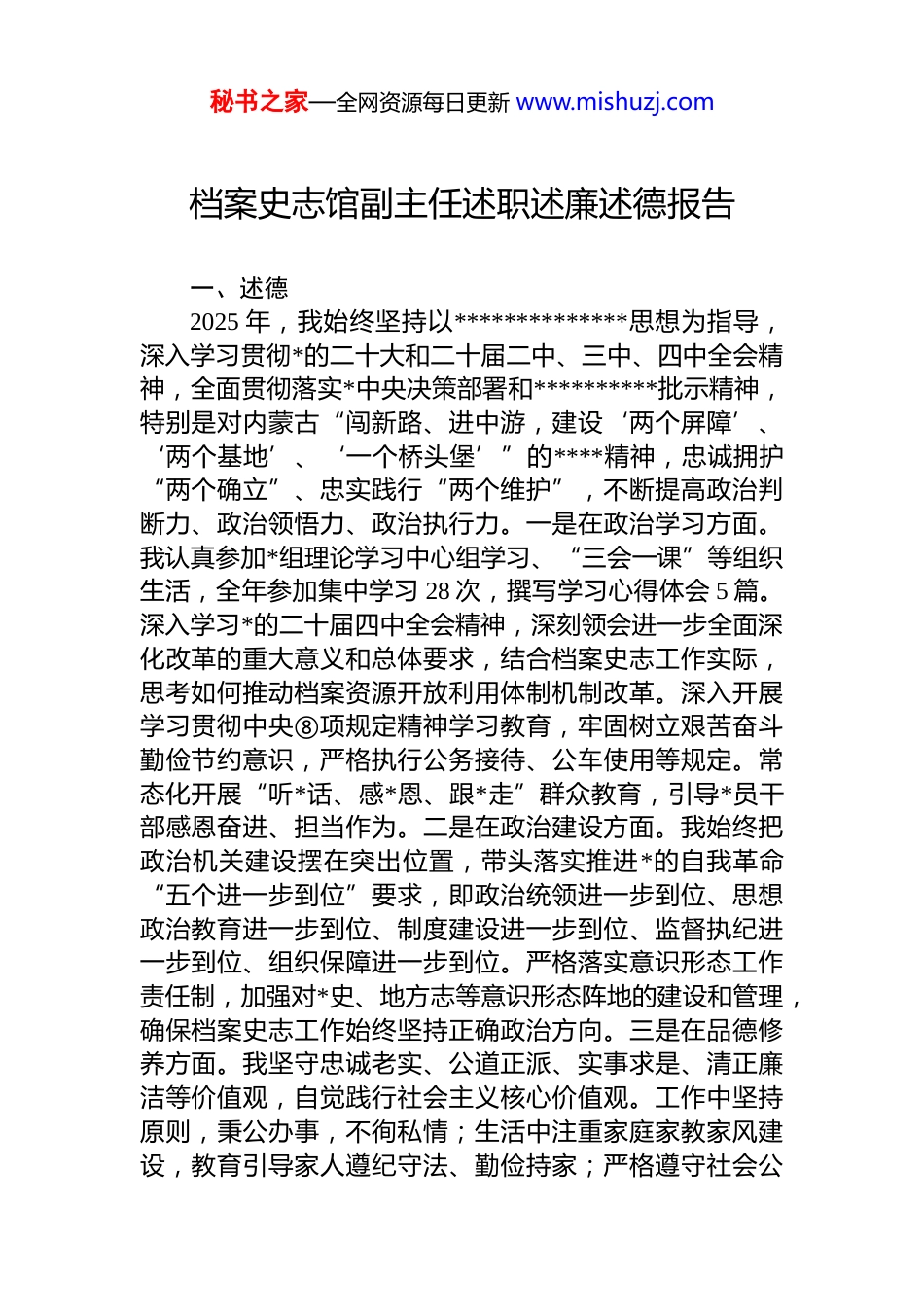 秘书之家—全网资源每日更新 www.mishuzj.com档案史志馆副主任述职述廉述德报告一、述德2025 年,我始终坚持以**************思想为指导,深入学习贯彻*的二十大和二十届二中、三中、四中全会精神,全面贯彻落实*中央决策部署和**********批示精神,特别是对内蒙古“闯新路、进中游,建设‘两个屏障’、‘两个基地’、‘一个桥头堡’”的****精神,忠诚拥护“两个确立”、忠实践行“两个维护”,不断提高政治判断力、政治领悟力、政治执行力。一是在政治学习方面。我认真参加*组理论学习中心组学习、“三会一课”等组织生活,全年参加集中学习 28 次,撰写学习心得体会 5 篇。深入学习*的二十届四中全会精神,深刻领会进一步全面深化改革的重大意义和总体要求,结合档案史志工作实际,思考如何推动档案资源开放利用体制机制改革。深入开展学习贯彻中央⑧项规定精神学习教育,牢固树立艰苦奋斗勤俭节约意识,严格执行公务接待、公车使用等规定。常态化开展“听*话、感*恩、跟*走”群众教育,引导*员干部感恩奋进、担当作为。二是在政治建设方面。我始终把政治机关建设摆在突出位置,带头落实推进*的自我革命“五个进一步到位”要求,即政治统领进一步到位、思想政治教育进一步到位、制度建设进一步到位、监督执纪进一步到位、组织保障进一步到位。严格落实意识形态工作责任制,加强对*史、地方志等意识形态阵地的建设和管理,确保档案史志工作始终坚持正确政治方向。三是在品德修养方面。我坚守忠诚老实、公道正派、实事求是、清正廉洁等价值观,自觉践行社会主义核心价值观。工作中坚持原则,秉公办事,不徇私情;生活中注重家庭家教家风建设,教育引导家人遵纪守法、勤俭持家;严格遵守社会公秘书之家—全网资源每日更新 www.mishuzj.com德、职业道德、家庭美德、个人品德,树立档案史志干部良好形象。四是在民族团结方面。我坚持以铸牢中华民族共同体意识为主线,认真学习贯彻******关于加强和改进民族工作的重要思想,在档案征集、史志编纂、对外交流等工作中,注重挖掘民族团结进步的历史资源,讲好民族团结故事,为巩固和发展民族团结大局贡献力量。二、述职2025 年,我认真履行分管 dj、*史、地方志、文稿和财务工作职责,坚定不移走以生态优先、绿色发展为导向的高质量发展新路子,努力为完成******交给内蒙古的“五大任务”和全盟“六个工程”贡献档案史志力量。(一)年度重点任务完成情况。一是 dj 工作扎实推进,政治引领作用充分发挥。认真履行 dj 工作责任,全年组织召开*组会议 24 次、支部委员会 12 次、*员大会 4 次,确保*的领导贯穿档案史志工作全过程。深入开展学习贯彻*的二十届四中全会精神,组织专题学习研讨 8 次,撰写理论文章 3 篇。严格落实“三会一课”制度,开展主题*日活动 12次,组织*员参观红色教育基地 3 次,观看警示教育片 4 场。扎实推进*支部标准化规范化建设,完善 dj 工作制度 12 项,*支部被评为盟直机关“先进基层*组织”。加强*员队伍建设,发展预备*员 2 名,转正*员 1 名,培养入*积极分子 5名。深入开展“我为群众办实事”实践活动,为群众提供档案查询服务 1200 余人次,解决历史遗留问题 6 件,群众满意度达 98%以上。二是*史地方志工作高质量完成,资政育人成效显著。全面完成《中国共产***盟历史》第三卷编纂工作,全书 120 万字,客观准确反映了改革开放和社会主义现代化建设新时期全盟*的历史。组织编纂《**盟年鉴》,全书 80 万字,全面记录了全盟经济社会发展成就,为领导决策提供了重要参考。推进《**盟志》修编工作,完成志书框架设计和资料征集,累计征集资料 500 余万字。开展*史学习教育,举办专题讲座 6 场,受众 800 余人次;制作*秘书之家—全网资源每日更新 www.mishuzj.com史宣传展板 20 块,在机关、学校、社区巡展,覆盖群众5000 余人次。加强*史研究,完成*史课题研究 3 项,发表*史研究文章 8 篇。做好重大*史事件和重要*史人物纪念活动,组织开展新中国成立 75 周年、改革开放 46 周年等主题纪念活动 5 场,营造了浓厚的爱*爱国氛围。三是...