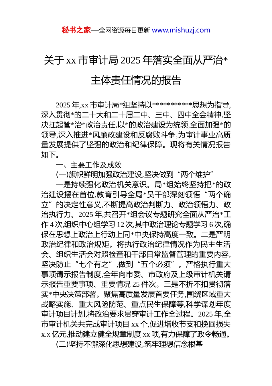 秘书之家—全网资源每日更新 www.mishuzj.com关于 xx 市审计局 2025 年落实全面从严治*主体责任情况的报告2025 年,xx 市审计局*组坚持以***********思想为指导,深入贯彻*的二十大和二十届二中、三中、四中全会精神,坚决扛起管*治*政治责任,以*的政治建设为统领,全面加强*的领导,深入推进*风廉政建设和反腐败斗争,为审计事业高质量发展提供了坚强的政治和纪律保障。现将有关情况报告如下。一、主要工作及成效(一)旗帜鲜明加强政治建设,坚决做到“两个维护”一是持续强化政治机关意识。局*组始终坚持把*的政治建设摆在首位,教育引导全局*员干部深刻领悟“两个确立”的决定性意义,不断提高政治判断力、政治领悟力、政治执行力。2025 年,共召开*组会议专题研究全面从严治*工作 4 次,组织中心组学习 12 次,其中政治理论专题学习 6 次,确保在思想上政治上行动上同*中央保持高度一致。二是严明政治纪律和政治规矩。将执行政治纪律情况作为民主生活会、组织生活会对照检查和干部日常监督管理的重要内容,坚决防止“七个有之”,做到“五个必须”。严格执行重大事项请示报告制度,全年向市委、市政府及上级审计机关请示报告重要事项、重要情况 25 件次。三是不折不扣贯彻落实*中央决策部署。聚焦高质量发展首要任务,围绕区域重大战略实施、重大风险防范、重点民生保障等,科学谋划年度审计项目计划,将政治要求贯穿审计工作全过程。2025 年,全市审计机关共完成审计项目 xx 个,促进增收节支和挽回损失x.x 亿元,推动建立健全规章制度 xx 项,有力保障了政令畅通。(二)坚持不懈深化思想建设,筑牢理想信念根基秘书之家—全网资源每日更新 www.mishuzj.com一是强化理论武装。坚持将学习***********思想作为首要政治任务,制定年度学习计划,用好“学习强国”等平台,采取领导领学、专题研讨、辅导报告、个人自学等多种形式,推动*的创新理论入脑入心。组织开展“读原著、学原文、悟原理”系列读书活动,*员干部撰写心得体会 xx 余篇。二是抓实意识形态工作。严格落实意识形态工作责任制,局*组每半年专题研究 1 次意识形态工作,分析研判意识形态领域风险。加强对局门户网站、内部刊物、工作微信群等阵地的管理,旗帜鲜明反对和抵制各种错误思潮。2025 年,开展意识形态风险排查 2 次,未发生重大负面舆情。三是巩固拓展zt 教育成果。建立健全常态化长效化学习机制,将 zt 教育中形成的好经验好做法固化为制度规范,引导*员干部在审计一线践行初心使命,切实把学习成果转化为依法忠实履职的实际行动。(三)多措并举夯实组织基础,锻造过硬审计铁军一是严格执行*的组织制度。认真落实民主集中制,修订完善局*组工作规则和“三重一大”决策制度实施办法,全年召开*组会研究重大决策、重要人事任免、重大项目安排、大额资金使用等事项 xx 项。严格落实“三会一课”、组织生活会、民主评议*员、主题*日等制度,局领导班子成员均以普通*员身份参加所在支部活动。二是加强干部队伍建设。坚持*管干部原则和好干部标准 ,突出政治标准选人用人,2025 年稳妥有序完成 xx 名科级干部选拔任用、xx 名干部职级晋升工作。实施审计专业能力提升工程,举办各类培训班 xx 期,培训 xx 人次,选派 xx 名年轻干部到重大项目、重大审计任务中锻炼。三是推进支部标准化规范化建设。深化“dj+审计”模式,在重大审计项目、援派审计任务中设立临时*支部,将战斗堡垒建在审计一线。开展“一支部一品牌”创建活动,xx 支部获评市级“五星级*支部”。(四)锲而不舍狠抓作风建设,大力弘扬清风正气一是力戒形式主义、官僚主义。严格落实中央八项规秘书之家—全网资源每日更新 www.mishuzj.com定及其实施细则精神,制定为基层减负具体措施 x 项,压减会议、文件数量,2025 年发文数量同比下降 x%。改进审计调查研究方式,班子成员带头深入基层审计机关和被审计单位开展调研 xx 次,解决实际问题 xx 个。二是密切联系服务群众。结合审计职能,重点关注就业、教育、医疗、养老、住房等民生领域政策落实和资金使用绩效,推动解决群众急难愁盼问题。在 xx 专项资金审计中,推动相关部门及时拨付拖欠资金 xx 万...