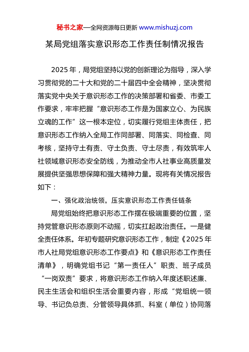 秘书之家—全网资源每日更新 www.mishuzj.com某局党组落实意识形态工作责任制情况报告 2025 年,局党组坚持以党的创新理论为指导,深入学习贯彻党的二十大和党的二十届四中全会精神,坚决贯彻落实党中央关于意识形态工作的决策部署和省委、市委工作要求,牢牢把握“意识形态工作是为国家立心、为民族立魂的工作”这一根本定位,切实履行党组主体责任,把意识形态工作纳入全局工作同部署、同落实、同检查、同考核,坚持守土有责、守土负责、守土尽责,有效筑牢人社领域意识形态安全防线,为推动全市人社事业高质量发展提供坚强思想保障和强大精神力量。现将有关情况报告如下:一、强化政治统领,压实意识形态工作责任链条局党组始终把意识形态工作摆在极端重要的位置,坚持党管意识形态原则不动摇,切实扛起政治责任。一是健全责任体系。年初专题研究意识形态工作,制定《2025 年市人社局党组意识形态工作要点》和《意识形态工作责任清单》,明确党组书记“第一责任人”职责、班子成员“一岗双责”要求,将意识形态工作纳入年度述职述廉、民主生活会和组织生活会重要内容,形成“党组统一领导、书记负总责、分管领导具体抓、科室(单位)协同落秘书之家—全网资源每日更新 www.mishuzj.com实”的工作格局。全年召开党组会议专题研究意识形态工作 4 次,分析研判风险隐患*次,确保方向不偏、阵地不丢。二是强化制度执行。严格落实《党委(党组)意识形态工作责任制实施办法》及省、市实施细则,修订完善舆情应对、信息发布、网络评论员管理等制度*项,建立“月调度、季研判、年考核”机制,将意识形态工作纳入绩效考核体系,权重占比*%,做到可量化、可检查、可追责。三是深化理论武装。坚持把学习党的创新理论作为首要政治任务,严格落实“第一议题”制度,组织党组理论学习中心组学习*次,专题学习习近平总书记关于意识形态工作的重要论述、关于宣传思想文化工作的重要指示精神等内容,引导党员干部深刻把握意识形态领域新形势新任务,不断增强政治判断力、政治领悟力、政治执行力。二、聚焦主责主业,推动意识形态与业务深度融合坚持把意识形态工作融入人社业务全过程各方面,以思想引领保障政策落地、服务民生。一是筑牢政策宣传主阵地。围绕就业创业、社会保障、人才人事、劳动关系等重点工作,构建“线上+线下”立体化宣传矩阵。依托“*市人社”微信公众号、官网等平台发布政策解读、办事指南、典型案例等信息*余条,阅读量超*万人次;组织开展“政策进园区、进社区、进高校”宣讲活动*场,发放宣传秘书之家—全网资源每日更新 www.mishuzj.com资料*万余份,确保惠民政策“飞入寻常百姓家”。特别是在高校毕业生就业服务季、城乡居民养老保险集中缴费期等关键节点,提前策划主题宣传,有效引导社会预期,营造积极向上舆论氛围。二是守好服务窗口意识形态前沿。全市*个人社服务窗口全部设立“党员先锋岗”“政策宣传角”,将意识形态要求融入窗口服务规范,要求工作人员在解答政策、办理业务时,既要讲清“怎么办”,也要讲透“为什么”,自觉传递党和政府的关怀与温度。加强对窗口人员意识形态培训*次,覆盖*人次,确保服务过程成为宣传党的主张、凝聚群众共识的生动课堂。三是强化舆情风险防控。建立“监测—研判—处置—反馈”闭环机制,对涉及就业歧视、社保待遇、欠薪维权等敏感话题实行 24 小时网络舆情监测,全年妥善处置苗头性、倾向性舆情*起,做到早发现、早报告、早处置。在处理某平台企业新就业形态劳动者权益争议事件中,及时发布权威信息、组织专家解读,有效引导舆论走向,防止负面炒作发酵。三、建强宣传矩阵,牢牢掌握网络意识形态主导权面对意识形态斗争主战场加速向网络转移的新趋势,局党组主动出击、积极作为,不断提升网络意识形态工作能力。一是壮大主流舆论声势。精心策划“人社风采”“惠民实事”“人才故事”等系列主题宣传,推出《十年秘书之家—全网资源每日更新 www.mishuzj.com社保路惠及千万家》《零工驿站里的温暖》等融媒体报道*篇,其中*篇被省级以上主流媒体转载,展现人社工作成效和为民情怀。二是规范网络信息发布。严格执行“...