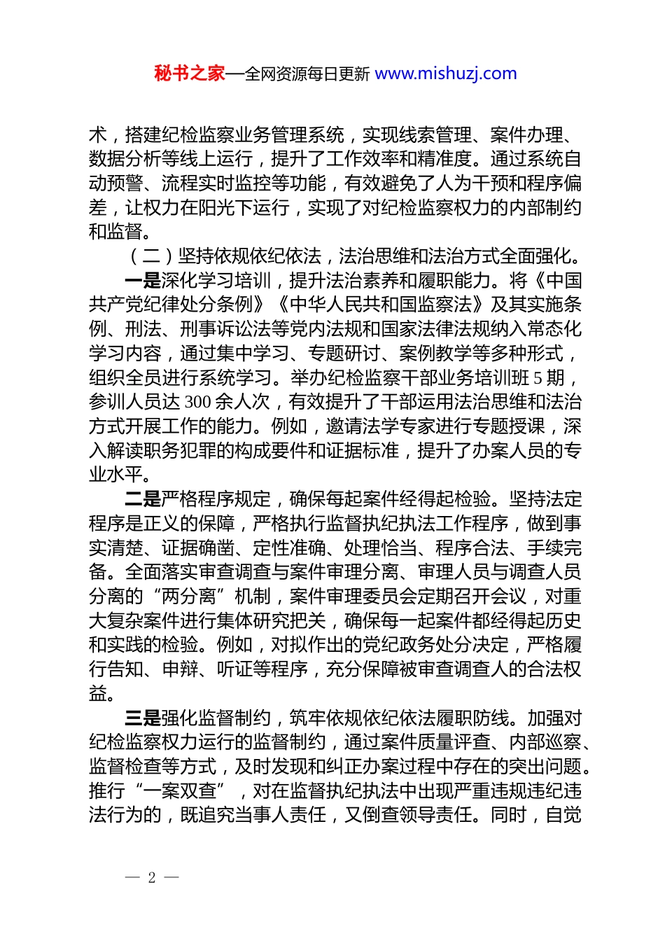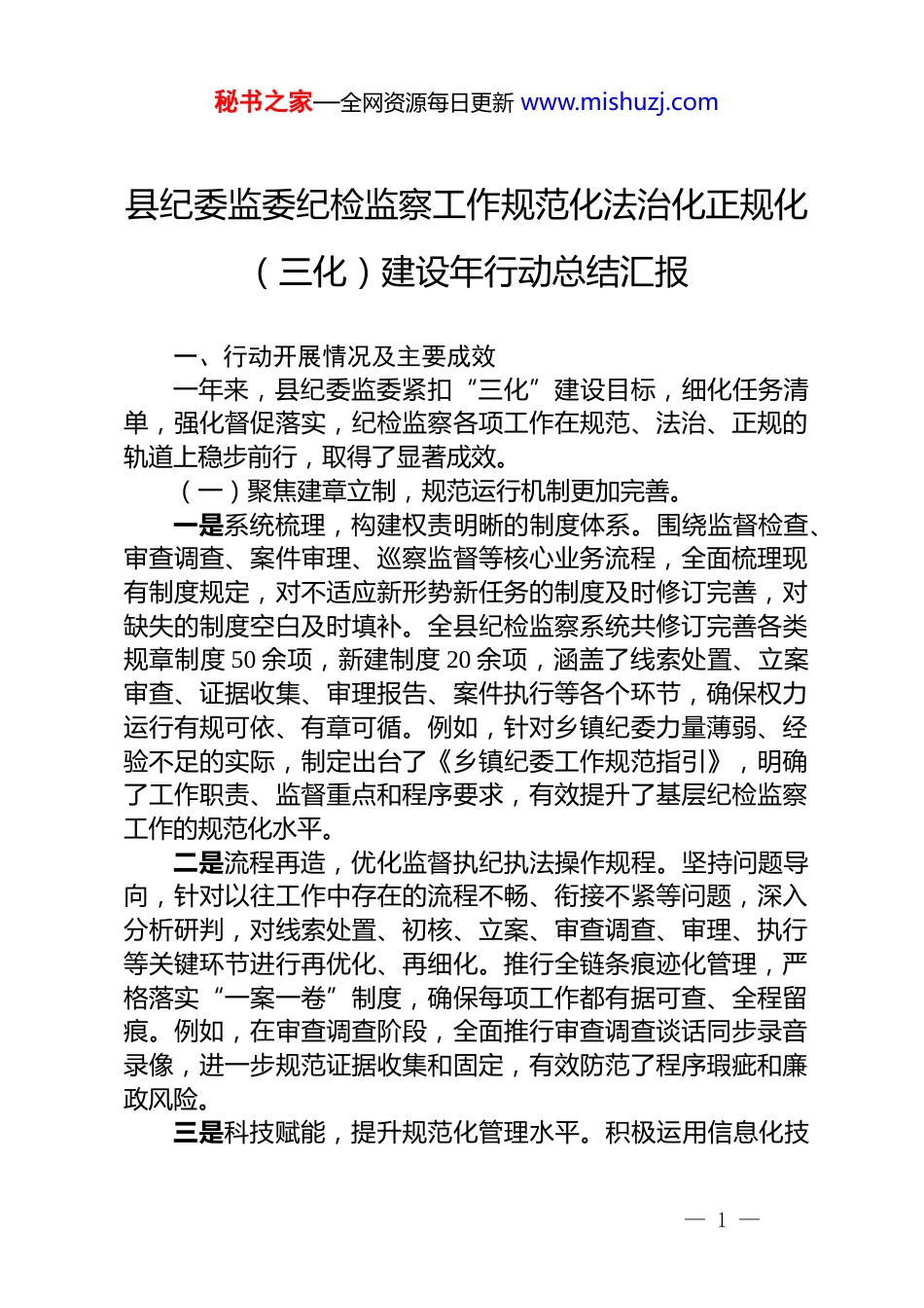 秘书之家—全网资源每日更新 www.mishuzj.com县纪委监委纪检监察工作规范化法治化正规化(三化)建设年行动总结汇报一、行动开展情况及主要成效一年来,县纪委监委紧扣“三化”建设目标,细化任务清单,强化督促落实,纪检监察各项工作在规范、法治、正规的轨道上稳步前行,取得了显著成效。(一)聚焦建章立制,规范运行机制更加完善。一是系统梳理,构建权责明晰的制度体系。围绕监督检查、审查调查、案件审理、巡察监督等核心业务流程,全面梳理现有制度规定,对不适应新形势新任务的制度及时修订完善,对缺失的制度空白及时填补。全县纪检监察系统共修订完善各类规章制度 50 余项,新建制度 20 余项,涵盖了线索处置、立案审查、证据收集、审理报告、案件执行等各个环节,确保权力运行有规可依、有章可循。例如,针对乡镇纪委力量薄弱、经验不足的实际,制定出台了《乡镇纪委工作规范指引》,明确了工作职责、监督重点和程序要求,有效提升了基层纪检监察工作的规范化水平。二是流程再造,优化监督执纪执法操作规程。坚持问题导向,针对以往工作中存在的流程不畅、衔接不紧等问题,深入分析研判,对线索处置、初核、立案、审查调查、审理、执行等关键环节进行再优化、再细化。推行全链条痕迹化管理,严格落实“一案一卷”制度,确保每项工作都有据可查、全程留痕。例如,在审查调查阶段,全面推行审查调查谈话同步录音录像,进一步规范证据收集和固定,有效防范了程序瑕疵和廉政风险。三是科技赋能,提升规范化管理水平。积极运用信息化技— 1 —秘书之家—全网资源每日更新 www.mishuzj.com术,搭建纪检监察业务管理系统,实现线索管理、案件办理、数据分析等线上运行,提升了工作效率和精准度。通过系统自动预警、流程实时监控等功能,有效避免了人为干预和程序偏差,让权力在阳光下运行,实现了对纪检监察权力的内部制约和监督。(二)坚持依规依纪依法,法治思维和法治方式全面强化。一是深化学习培训,提升法治素养和履职能力。将《中国共产党纪律处分条例》《中华人民共和国监察法》及其实施条例、刑法、刑事诉讼法等党内法规和国家法律法规纳入常态化学习内容,通过集中学习、专题研讨、案例教学等多种形式,组织全员进行系统学习。举办纪检监察干部业务培训班 5 期,参训人员达 300 余人次,有效提升了干部运用法治思维和法治方式开展工作的能力。例如,邀请法学专家进行专题授课,深入解读职务犯罪的构成要件和证据标准,提升了办案人员的专业水平。二是严格程序规定,确保每起案件经得起检验。坚持法定程序是正义的保障,严格执行监督执纪执法工作程序,做到事实清楚、证据确凿、定性准确、处理恰当、程序合法、手续完备。全面落实审查调查与案件审理分离、审理人员与调查人员分离的“两分离”机制,案件审理委员会定期召开会议,对重大复杂案件进行集体研究把关,确保每一起案件都经得起历史和实践的检验。例如,对拟作出的党纪政务处分决定,严格履行告知、申辩、听证等程序,充分保障被审查调查人的合法权益。三是强化监督制约,筑牢依规依纪依法履职防线。加强对纪检监察权力运行的监督制约,通过案件质量评查、内部巡察、监督检查等方式,及时发现和纠正办案过程中存在的突出问题。推行“一案双查”,对在监督执纪执法中出现严重违规违纪违法行为的,既追究当事人责任,又倒查领导责任。同时,自觉— 2 —秘书之家—全网资源每日更新 www.mishuzj.com接受人大监督、政协民主监督和社会各界监督,主动公开纪检监察工作信息,以透明促规范,以公开促公正。据统计,一年来共开展案件质量评查 20 余件,发现并纠正程序性问题 10 余个,通过自我纠偏,有效提升了案件办理质量。(三)注重专业培养,正规化队伍建设持续深化。一是强化政治建设,锻造忠诚干净担当的纪检铁军。坚持把政治建设摆在首位,引导全体纪检监察干部深刻领悟“两个确立”的决定性意义,增强“四个意识”、坚定“四个自信”、做到“两个维护”。组织开展政治理论学习和党性教育,常态化开展警示教育,用身边事教育身边人,引导干部严守纪律规矩。例如,组织观看警示教育片,...