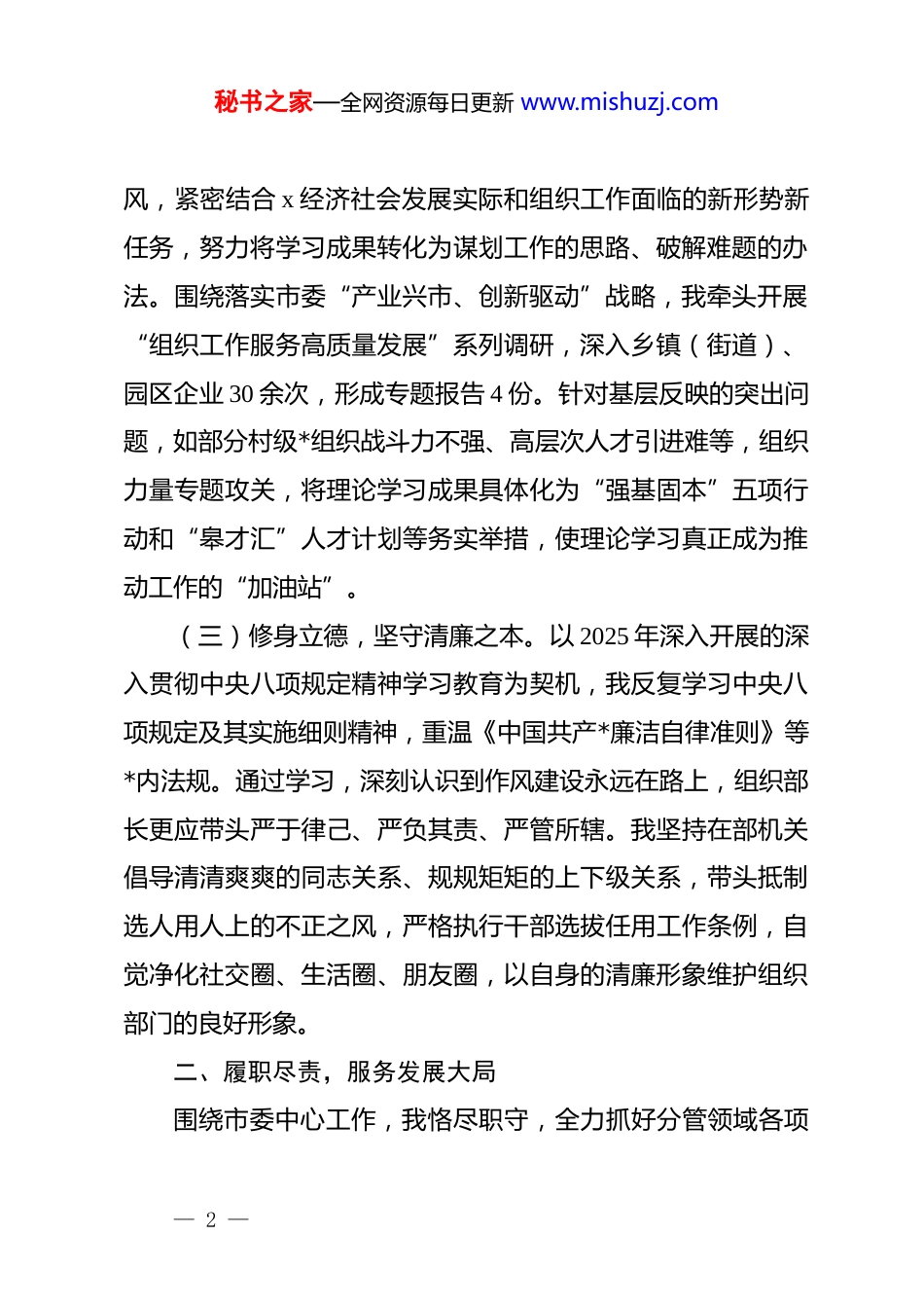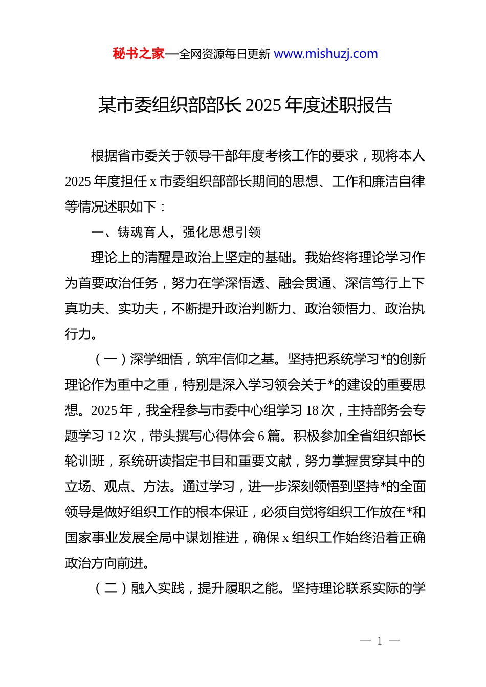 秘书之家—全网资源每日更新 www.mishuzj.com某市委组织部部长 2025 年度述职报告根据省市委关于领导干部年度考核工作的要求,现将本人2025 年度担任 x 市委组织部部长期间的思想、工作和廉洁自律等情况述职如下:一、铸魂育人,强化思想引领理论上的清醒是政治上坚定的基础。我始终将理论学习作为首要政治任务,努力在学深悟透、融会贯通、深信笃行上下真功夫、实功夫,不断提升政治判断力、政治领悟力、政治执行力。(一)深学细悟,筑牢信仰之基。坚持把系统学习*的创新理论作为重中之重,特别是深入学习领会关于*的建设的重要思想。2025 年,我全程参与市委中心组学习 18 次,主持部务会专题学习 12 次,带头撰写心得体会 6 篇。积极参加全省组织部长轮训班,系统研读指定书目和重要文献,努力掌握贯穿其中的立场、观点、方法。通过学习,进一步深刻领悟到坚持*的全面领导是做好组织工作的根本保证,必须自觉将组织工作放在*和国家事业发展全局中谋划推进,确保 x 组织工作始终沿着正确政治方向前进。(二)融入实践,提升履职之能。坚持理论联系实际的学— 1 —秘书之家—全网资源每日更新 www.mishuzj.com风,紧密结合 x 经济社会发展实际和组织工作面临的新形势新任务,努力将学习成果转化为谋划工作的思路、破解难题的办法。围绕落实市委“产业兴市、创新驱动”战略,我牵头开展“组织工作服务高质量发展”系列调研,深入乡镇(街道)、园区企业 30 余次,形成专题报告 4 份。针对基层反映的突出问题,如部分村级*组织战斗力不强、高层次人才引进难等,组织力量专题攻关,将理论学习成果具体化为“强基固本”五项行动和“皋才汇”人才计划等务实举措,使理论学习真正成为推动工作的“加油站”。(三)修身立德,坚守清廉之本。以 2025 年深入开展的深入贯彻中央八项规定精神学习教育为契机,我反复学习中央八项规定及其实施细则精神,重温《中国共产*廉洁自律准则》等*内法规。通过学习,深刻认识到作风建设永远在路上,组织部长更应带头严于律己、严负其责、严管所辖。我坚持在部机关倡导清清爽爽的同志关系、规规矩矩的上下级关系,带头抵制选人用人上的不正之风,严格执行干部选拔任用工作条例,自觉净化社交圈、生活圈、朋友圈,以自身的清廉形象维护组织部门的良好形象。二、履职尽责,服务发展大局围绕市委中心工作,我恪尽职守,全力抓好分管领域各项— 2 —秘书之家—全网资源每日更新 www.mishuzj.com任务落实,努力为 x 高质量发展提供坚强组织保证。(一)固本强基,建强战斗堡垒。树立大抓基层的鲜明导向,着力增强基层*组织政治功能和组织功能。一是实施“头雁”培育工程。圆满完成 185 个村(社区)“两委”换届“回头看”,调整不胜任、不尽职*组织书记 12 名,遴选 45 名优秀退伍军人、返乡大学生进入后备干部库。二是破解新兴领域 dj难题。牵头成立市快递物流行业*委,新建*组织 28 个,有效覆盖重点企业 85 家。三是提升*员教育管理质效。推广“线上+线下”融合教育模式,利用“xedj”平台开展常态化学习,全市*员年度参学率达 98.5%。牵头整治 3 个软弱涣散基层*组织,已全部转化升级。(二)选贤任能,激励担当作为。坚持*管干部原则,落实新时代好干部标准,着力锻造忠诚干净担当的高素质专业化干部队伍。一是突出政治标准。在干部选拔任用中,严格执行“凡提四必”,对政治不合格的“一票否决”,全年对 15 名拟提拔人选暂缓或不予任用。二是优化队伍结构。加大优秀年轻干部培养选拔力度,全年提拔重用“80 后”科级干部 56 名,其中“85 后”22 名,干部队伍梯队建设更趋合理。选派 32 名年轻干部到项目建设、信访维稳等一线岗位历练。三是强化严管厚爱。完善干部平时考核机制,开展市管干部常态化谈心谈话— 3 —秘书之家—全网资源每日更新 www.mishuzj.com380 余人次。稳妥推进公务员职务与职级并行工作,按政策完成 520 名公务员职级晋升,有效激发各年龄段干部积极性。(三)聚才引智,构筑创新高地。坚持人才引领发展的战略地位,全方位培养、引进、用好人才。一是精准引才。围...