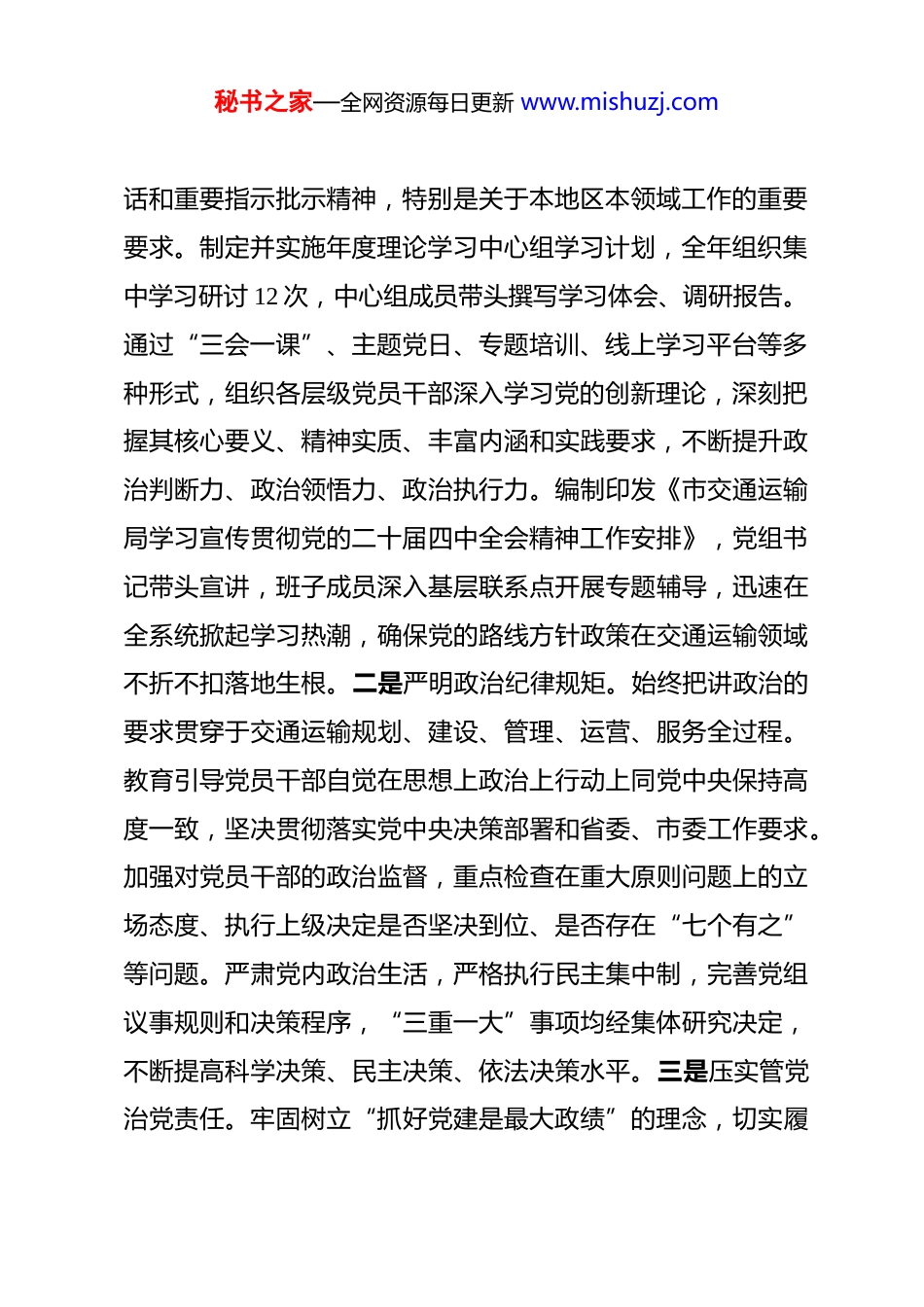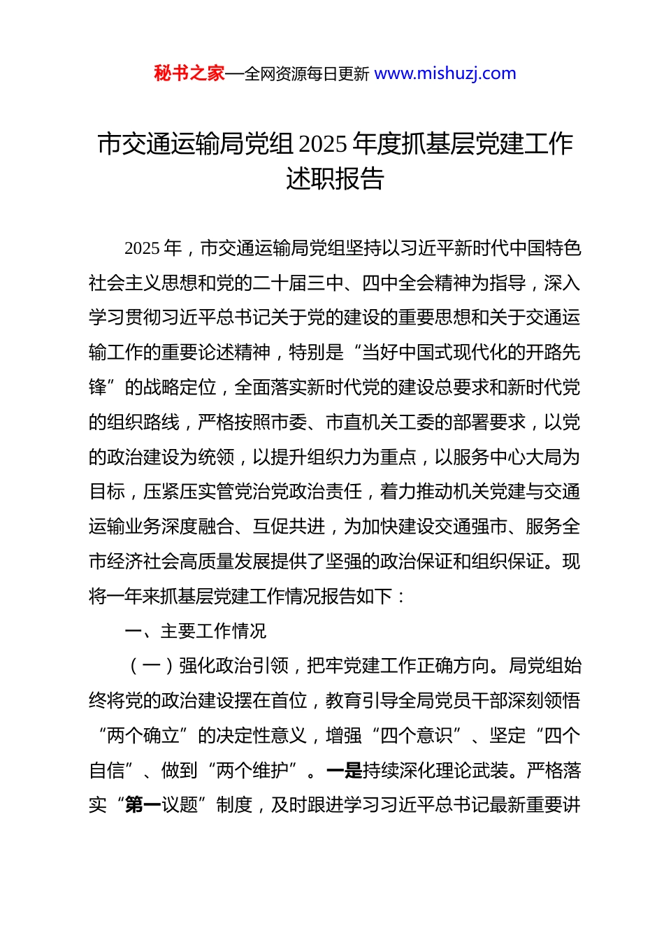 秘书之家—全网资源每日更新 www.mishuzj.com市交通运输局党组 2025 年度抓基层党建工作述职报告 2025 年,市交通运输局党组坚持以习近平新时代中国特色社会主义思想和党的二十届三中、四中全会精神为指导,深入学习贯彻习近平总书记关于党的建设的重要思想和关于交通运输工作的重要论述精神,特别是“当好中国式现代化的开路先锋”的战略定位,全面落实新时代党的建设总要求和新时代党的组织路线,严格按照市委、市直机关工委的部署要求,以党的政治建设为统领,以提升组织力为重点,以服务中心大局为目标,压紧压实管党治党政治责任,着力推动机关党建与交通运输业务深度融合、互促共进,为加快建设交通强市、服务全市经济社会高质量发展提供了坚强的政治保证和组织保证。现将一年来抓基层党建工作情况报告如下:一、主要工作情况(一)强化政治引领,把牢党建工作正确方向。局党组始终将党的政治建设摆在首位,教育引导全局党员干部深刻领悟“两个确立”的决定性意义,增强“四个意识”、坚定“四个自信”、做到“两个维护”。一是持续深化理论武装。严格落实“第一议题”制度,及时跟进学习习近平总书记最新重要讲秘书之家—全网资源每日更新 www.mishuzj.com话和重要指示批示精神,特别是关于本地区本领域工作的重要要求。制定并实施年度理论学习中心组学习计划,全年组织集中学习研讨 12 次,中心组成员带头撰写学习体会、调研报告。通过“三会一课”、主题党日、专题培训、线上学习平台等多种形式,组织各层级党员干部深入学习党的创新理论,深刻把握其核心要义、精神实质、丰富内涵和实践要求,不断提升政治判断力、政治领悟力、政治执行力。编制印发《市交通运输局学习宣传贯彻党的二十届四中全会精神工作安排》,党组书记带头宣讲,班子成员深入基层联系点开展专题辅导,迅速在全系统掀起学习热潮,确保党的路线方针政策在交通运输领域不折不扣落地生根。二是严明政治纪律规矩。始终把讲政治的要求贯穿于交通运输规划、建设、管理、运营、服务全过程。教育引导党员干部自觉在思想上政治上行动上同党中央保持高度一致,坚决贯彻落实党中央决策部署和省委、市委工作要求。加强对党员干部的政治监督,重点检查在重大原则问题上的立场态度、执行上级决定是否坚决到位、是否存在“七个有之”等问题。严肃党内政治生活,严格执行民主集中制,完善党组议事规则和决策程序,“三重一大”事项均经集体研究决定,不断提高科学决策、民主决策、依法决策水平。三是压实管党治党责任。牢固树立“抓好党建是最大政绩”的理念,切实履秘书之家—全网资源每日更新 www.mishuzj.com行党组主体责任、党组书记第一责任人职责和班子成员“一岗双责”。年初研究制定《市交通运输局 2025 年党的建设工作要点》《全面从严治党主体责任清单和任务安排》,将党建工作与业务工作同谋划、同部署、同推进、同考核。定期召开党建工作领导小组会议,专题研究部署党建工作,听取基层党组织书记述职,开展党建督查调研。党组成员均建立基层党建工作联系点,带头参加所在支部组织生活,每年至少深入联系点调研指导 2 次、讲党课 1 次,帮助解决实际困难,推动形成“书记抓、抓书记”,一级抓一级、层层抓落实的党建工作格局。(二)夯实组织基础,锻造坚强有力战斗堡垒。局党组坚持大抓基层的鲜明导向,着力增强基层党组织政治功能和组织功能,把基层党组织建设成为有效实现党的领导的坚强战斗堡垒。一是推进组织体系有效覆盖。优化机关及局属单位党组织设置,选优配强支部书记和委员。针对交通运输行业新业态、新就业群体特点,积极探索党建工作新模式。通过“行业党委+龙头企业党组织+流动党员党支部”等多种形式,加强对货车司机、网约车司机等群体的政治引领和组织覆盖。全年新建道路运输行业党组织 15 个,调整优化党组织设置 8 个,向重点企业、项目派驻党建指导员 26 名,切实将党的工作做到车轮上、覆盖到第一线。二是打造特色党建品牌矩阵。结合各单位职能秘书之家—全网资源每日更新 www.mishuzj.com特点和党员队伍实际,深入开展“一支部一品牌”创建活动。局机关党支部...