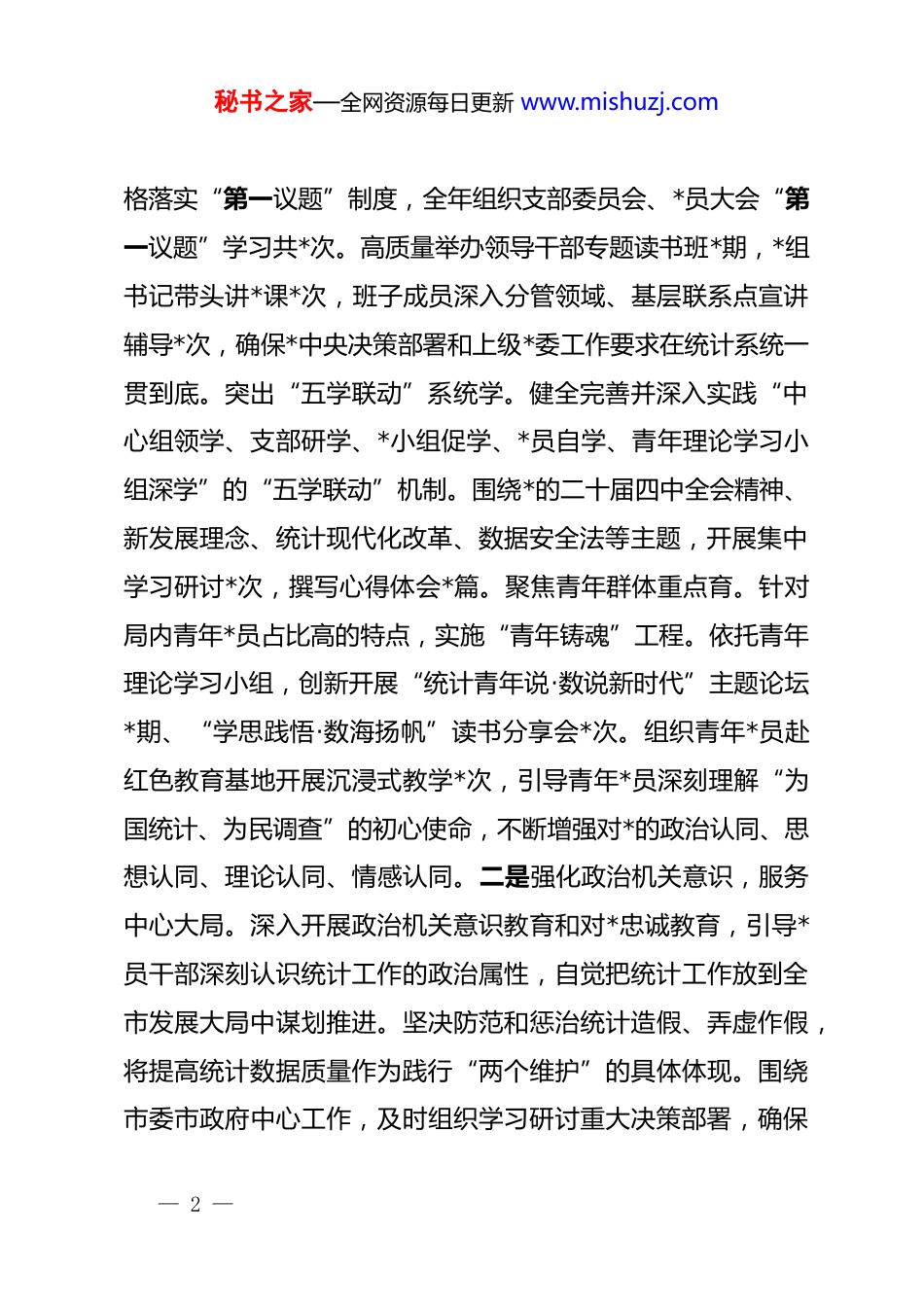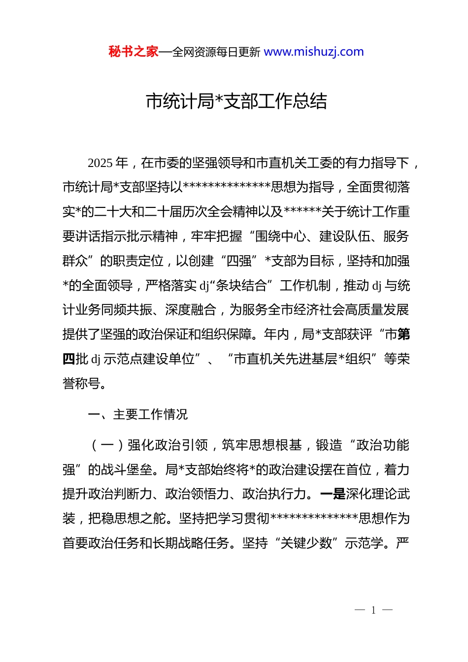 秘书之家—全网资源每日更新 www.mishuzj.com市统计局*支部工作总结2025 年,在市委的坚强领导和市直机关工委的有力指导下,市统计局*支部坚持以**************思想为指导,全面贯彻落实*的二十大和二十届历次全会精神以及******关于统计工作重要讲话指示批示精神,牢牢把握“围绕中心、建设队伍、服务群众”的职责定位,以创建“四强”*支部为目标,坚持和加强*的全面领导,严格落实 dj“条块结合”工作机制,推动 dj 与统计业务同频共振、深度融合,为服务全市经济社会高质量发展提供了坚强的政治保证和组织保障。年内,局*支部获评“市第四批 dj 示范点建设单位”、“市直机关先进基层*组织”等荣誉称号。一、主要工作情况(一)强化政治引领,筑牢思想根基,锻造“政治功能强”的战斗堡垒。局*支部始终将*的政治建设摆在首位,着力提升政治判断力、政治领悟力、政治执行力。一是深化理论武装,把稳思想之舵。坚持把学习贯彻**************思想作为首要政治任务和长期战略任务。坚持“关键少数”示范学。严— 1 —秘书之家—全网资源每日更新 www.mishuzj.com格落实“第一议题”制度,全年组织支部委员会、*员大会“第一议题”学习共*次。高质量举办领导干部专题读书班*期,*组书记带头讲*课*次,班子成员深入分管领域、基层联系点宣讲辅导*次,确保*中央决策部署和上级*委工作要求在统计系统一贯到底。突出“五学联动”系统学。健全完善并深入实践“中心组领学、支部研学、*小组促学、*员自学、青年理论学习小组深学”的“五学联动”机制。围绕*的二十届四中全会精神、新发展理念、统计现代化改革、数据安全法等主题,开展集中学习研讨*次,撰写心得体会*篇。聚焦青年群体重点育。针对局内青年*员占比高的特点,实施“青年铸魂”工程。依托青年理论学习小组,创新开展“统计青年说·数说新时代”主题论坛*期、“学思践悟·数海扬帆”读书分享会*次。组织青年*员赴红色教育基地开展沉浸式教学*次,引导青年*员深刻理解“为国统计、为民调查”的初心使命,不断增强对*的政治认同、思想认同、理论认同、情感认同。二是强化政治机关意识,服务中心大局。深入开展政治机关意识教育和对*忠诚教育,引导*员干部深刻认识统计工作的政治属性,自觉把统计工作放到全市发展大局中谋划推进。坚决防范和惩治统计造假、弄虚作假,将提高统计数据质量作为践行“两个维护”的具体体现。围绕市委市政府中心工作,及时组织学习研讨重大决策部署,确保— 2 —秘书之家—全网资源每日更新 www.mishuzj.com统计工作始终沿着正确政治方向前进。三是构建*群一体格局,凝聚奋进力量。充分发挥*支部领导核心作用,加强对工青妇等群团组织的政治引领。指导工会开展“岗位建功”技能竞赛、妇联组织“巾帼统计人”风采展示、共青团深化“青年文明号”创建等活动。联合举办“x”主题*日暨群团共建活动*次,形成*群组织同心同向、同频共振抓思想、促业务的生动局面。(二)建强组织体系,提升履职效能,锻造“支部班子强”的领导核心。局*支部着力打造政治坚定、团结协作、担当作为、作风过硬的坚强领导集体。一是优化班子结构,夯实组织基础。严格规范完成支部换届选举工作,选优配强支部班子。除由*组书记、局长*同志担任*支部书记外,配备一名政治素质高、业务能力强、熟悉*务工作的正科级领导干部担任专职副书记。支委委员和*小组长均从各业务科室的优秀年轻骨干中选拔产生,平均年龄*岁,全部具有本科以上学历和中级以上统计职称,确保班子成员既懂*务又精业务,为深化*业融合奠定坚实组织基础。二是健全制度机制,规范权力运行。严格落实民主集中制,完善支部委员会议事规则和决策程序。班子成员职责清晰、分工明确,建立 ab 角互补机制。严肃*内政治生活,高质量开好年度组织生活会和民主评议*员工作,认真开展批评与— 3 —秘书之家—全网资源每日更新 www.mishuzj.com自我批评。严格执行“三会一课”制度,全年召开支部*员大会*次、支部委员会*次、*小组会*次,支部书记及班子成员讲*课*次。修订完善《市统计局*员评星定级管理实施细则》,将理论学习、业务实绩、遵规守纪、作用发...