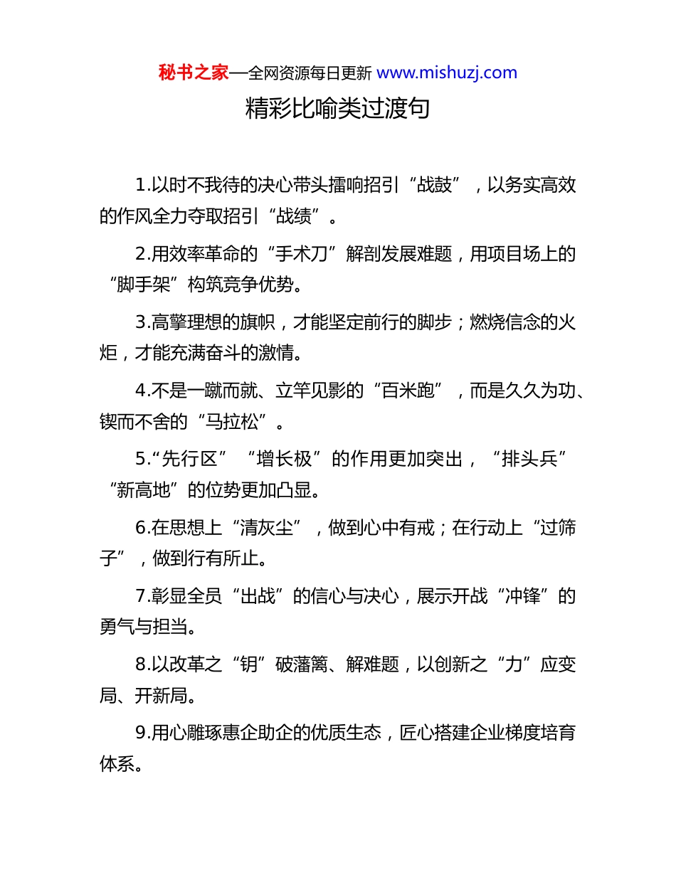 秘书之家—全网资源每日更新 www.mishuzj.com精彩比喻类过渡句1.以时不我待的决心带头擂响招引“战鼓”,以务实高效的作风全力夺取招引“战绩”。2.用效率革命的“手术刀”解剖发展难题,用项目场上的“脚手架”构筑竞争优势。3.高擎理想的旗帜,才能坚定前行的脚步;燃烧信念的火炬,才能充满奋斗的激情。4.不是一蹴而就、立竿见影的“百米跑”,而是久久为功、锲而不舍的“马拉松”。5.“先行区”“增长极”的作用更加突出,“排头兵”“新高地”的位势更加凸显。6.在思想上“清灰尘”,做到心中有戒;在行动上“过筛子”,做到行有所止。7.彰显全员“出战”的信心与决心,展示开战“冲锋”的勇气与担当。8.以改革之“钥”破藩篱、解难题,以创新之“力”应变局、开新局。9.用心雕琢惠企助企的优质生态,匠心搭建企业梯度培育体系。秘书之家—全网资源每日更新 www.mishuzj.com10.产业是城市发展的“硬脊梁”,项目是经济增长的“压舱石”。11.发出了起步冲刺的“动员令”,吹响了项目建设的“冲锋号”。12.擘画了定向谋篇的“路线图”,吹响了凝心鼓劲的“冲锋号”。13.略一松劲,产生的就是代差;稍一偷懒,输掉的就是未来。14.既要有“深扎土里”的定力,更要有“抖抖枝叶”的勇气。15.让每一个创新构想落地生根,让每一份创业激情绽放光芒。16.服下担当尽责的“定心丸”,增强干事创业的“安全感”。17.打通基层组织“毛细血管”,激活基层治理“神经末梢”。18.用好深度调研的“金钥匙”,增加议案建议的“含金量”。19.奏响“干事创业”最强音,唱响“奋勇争先”主旋律。20.在大风大浪面前立场坚定,在利益诱惑面前坚守底线。秘书之家—全网资源每日更新 www.mishuzj.com21.“织”密要素保障配套网,“链”就产业集聚生态圈。22.聚焦改革发展“大主题”,瞄准群众关切“小话题”。23.发现问题的“火眼金睛”,解决问题的“铁肩妙笔”。24.让思想的种子拥抱沃土,让真理的光芒照亮前路。25.比拼的大擂台各展所长,奋进的主赛道各显其能。26.呼唤只争朝夕的行动者,需要脚踏实地的实干家。27.把每一锤都敲在点子上,每一钉都钉在管用处。28.改革发展的“白名单”,创新探索的“安全区”。29.抓铁有痕的“执行力”,舍我其谁的“精气神”。30.努力消除“知识恐慌”,加快填补“本领赤字”。31.蹚别人没有走过的路,踏前人没有垦过的荒。32.保持“跟跑”的韧劲,增强“突围”的能量。33.增强“抓落实”魄力,提升“画句号”能力。34.“立身为旗”的信念,“横刀立马”的胆魄。35.各唱各的“拿手戏”,各打各的“优势牌”。36.麻痹与麻烦“同姓”,侥幸与不幸“同名”。37.把准思想“方向盘”,开动实干“发动机”。38.跨过改革的“险滩”,抵达发展的“彼岸”。秘书之家—全网资源每日更新 www.mishuzj.com39.创新创业“磁力场”,引育留用“全链条”。40.聚焦产业“主赛道”,扩容人才“蓄水池”。。41.快一步就是“蝶变”,慢一拍就会“掉队”。42.答好发展“必答题”,破解攻坚“附加题”。43.保持冲刺“一鼓劲”、同下决战“一盘棋”。44.冲破利益固化藩篱,朝着顽瘴痼疾开刀。45.在同一擂台上较量,在同一答卷上竞赛。46.竞相发展大潮浩荡,区域竞争百舸争流。47.行动“快人一步”,效果“胜人一筹”。48.拼搏到毫无保留,努力到不留遗憾。49.筑牢思想“底座”,校准发展“航向”。50.擂响“冲刺鼓”,打胜“收官仗”。