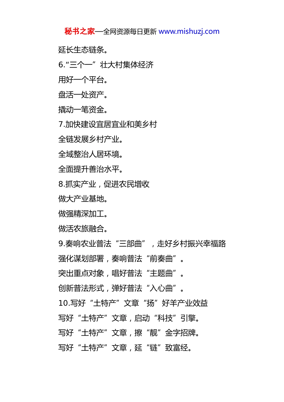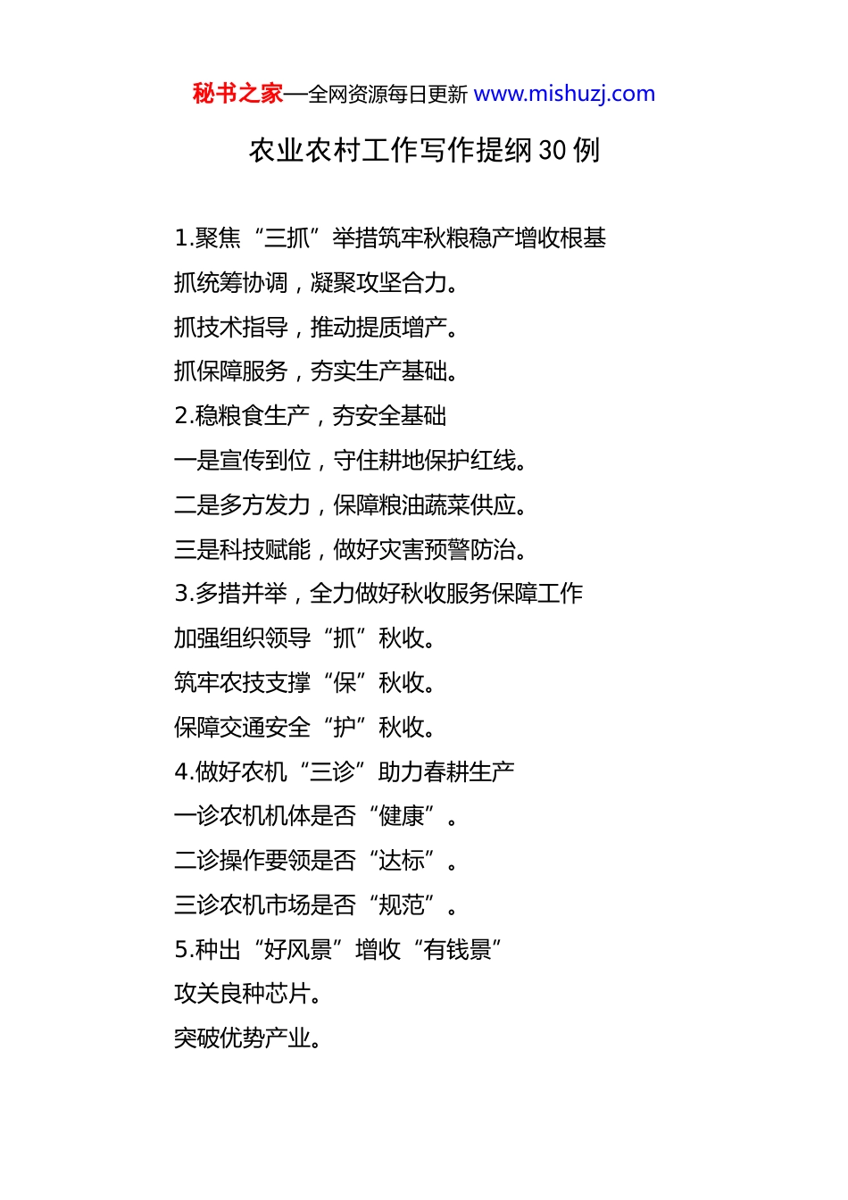 秘书之家—全网资源每日更新 www.mishuzj.com农业农村工作写作提纲 30 例 1.聚焦“三抓”举措筑牢秋粮稳产增收根基抓统筹协调,凝聚攻坚合力。抓技术指导,推动提质增产。抓保障服务,夯实生产基础。2.稳粮食生产,夯安全基础一是宣传到位,守住耕地保护红线。二是多方发力,保障粮油蔬菜供应。三是科技赋能,做好灾害预警防治。3.多措并举,全力做好秋收服务保障工作加强组织领导“抓”秋收。筑牢农技支撑“保”秋收。保障交通安全“护”秋收。4.做好农机“三诊”助力春耕生产一诊农机机体是否“健康”。二诊操作要领是否“达标”。三诊农机市场是否“规范”。5.种出“好风景”增收“有钱景”攻关良种芯片。突破优势产业。秘书之家—全网资源每日更新 www.mishuzj.com延长生态链条。6.“三个一”壮大村集体经济用好一个平台。盘活一处资产。撬动一笔资金。7.加快建设宜居宜业和美乡村全链发展乡村产业。全域整治人居环境。全面提升善治水平。8.抓实产业,促进农民增收做大产业基地。做强精深加工。做活农旅融合。9.奏响农业普法“三部曲”,走好乡村振兴幸福路强化谋划部署,奏响普法“前奏曲”。突出重点对象,唱好普法“主题曲”。创新普法形式,弹好普法“入心曲”。10.写好“土特产”文章“扬”好羊产业效益写好“土特产”文章,启动“科技”引擎。写好“土特产”文章,擦“靓”金字招牌。写好“土特产”文章,延“链”致富经。秘书之家—全网资源每日更新 www.mishuzj.com11.“小厕污”治出“大民生”采取项目拼盘,资金打捆推进“共治”。突出规划引领,优化工艺推进“共治”。统一建设标准,规范技术推进“共治”。强化部门联动,全面保障推进“共治”。坚持建管并重,运维管护推进“共治”。12.聚焦“三度”,纵深推进农村“厕所革命”整村推进有“广度”。厕污共治有“维度”。建管服务有“温度”。13.突出“三位一体”全力推动“三区同建”突出产村一体,建设宜业产业园区。突出景村一体,建设宜游田园景区。突出园村一体,建设宜居新型社区。14.突破发展“肉制品”产业强化扩繁增量。强化科技支撑。强化要素保障。15.探索服务新模式发展壮大村集体经济组织引领,筑牢服务根基。创新方式,深化服务保障。秘书之家—全网资源每日更新 www.mishuzj.com多方参与,共享服务成果。16.全力拼抢一季度农业经济指标“开门红”提早谋划分解。狠抓对接争取。加快项目建设。17.四举措抓实“平安农机”示范县创建党政重视“抓创建”。部门协作“严执法”。多措并举“强培训”。系统治理“保安全”。18.小蜜蜂酿造“甜蜜”大产业,铺就富民增收路强化科学布局建基地。强化政策支持壮产业。强化技术服务提质量。强化品牌营销促增收。19.以“三区同建”推进美丽**建设突出产村一体“建园区”。突出景村一体“兴景区”。突出园村一体“强社区”。20.“三举措”抓实农机安全保障“三秋”生产有序开展秘书之家—全网资源每日更新 www.mishuzj.com建好农机安全信息台账。强化联动执法监督检查。持续加大安全宣传力度。21.用活“牛点子”,做强“牛产业”谋布局、定规划,牵牢“牛鼻子”。抓招引、扩规模,突破“牛瓶颈”。添政策、增投入,实现“牛牪犇”。强保障、优服务,护好“牛蹄角”。22.四举措切实做好秋收秋种工作统筹协调服务,保秋粮颗粒归仓。及早谋划晚秋,促粮油种满种尽。强化政策宣传,使政策落地见效。严格执法监管,为晚秋保驾护航。23.做实“三大”服务,高效推进春耕生产做实农资保障服务。做好农业托管服务。做优技术指导服务。24.“三聚力”助力产业高质量发展聚力规模倍增。聚力全链同推。聚力三产融合。秘书之家—全网资源每日更新 www.mishuzj.com25.“三向发力”助推农村集体资产监管服务平台高效运行发挥“组织力”,上下联动夯基础。发挥“制度力”,逐级落实促规范。发挥“驱动力”,多管齐下提质效。26.细化“五项”举措让执法力度与温度并存加强组织领导,精心安排部署。强化宣传引导,营造浓厚氛围。加大专项整治,维护行业秩序。狠抓案件查办,提高办案质效。健全执法制度,规范执法行为。27.念好人才“三字诀”打造土特产经济“强磁场”念好“引...