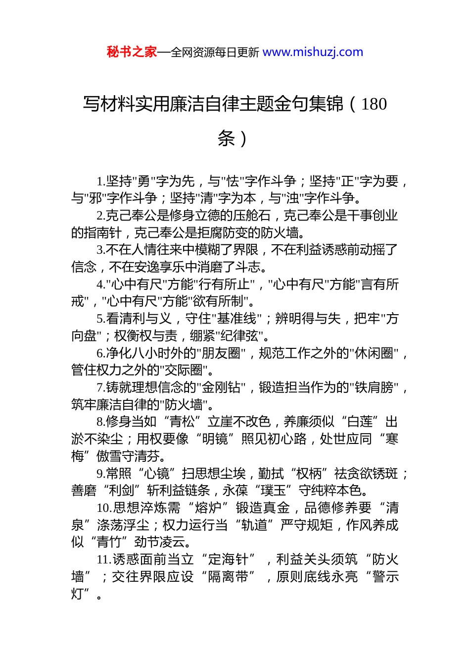 秘书之家—全网资源每日更新 www.mishuzj.com写材料实用廉洁自律主题金句集锦(180条)1.坚持"勇"字为先,与"怯"字作斗争;坚持"正"字为要,与"邪"字作斗争;坚持"清"字为本,与"浊"字作斗争。2.克己奉公是修身立德的压舱石,克己奉公是干事创业的指南针,克己奉公是拒腐防变的防火墙。3.不在人情往来中模糊了界限,不在利益诱惑前动摇了信念,不在安逸享乐中消磨了斗志。4."心中有尺"方能"行有所止","心中有尺"方能"言有所戒","心中有尺"方能"欲有所制"。5.看清利与义,守住"基准线";辨明得与失,把牢"方向盘";权衡权与责,绷紧"纪律弦"。6.净化八小时外的"朋友圈",规范工作之外的"休闲圈",管住权力之外的"交际圈"。7.铸就理想信念的"金刚钻",锻造担当作为的"铁肩膀",筑牢廉洁自律的"防火墙"。8.修身当如“青松”立崖不改色,养廉须似“白莲”出淤不染尘;用权要像“明镜”照见初心路,处世应同“寒梅”傲雪守清芬。9.常照“心镜”扫思想尘埃,勤拭“权柄”祛贪欲锈斑;善磨“利剑”斩利益链条,永葆“璞玉”守纯粹本色。10.思想淬炼需“熔炉”锻造真金,品德修养要“清泉”涤荡浮尘;权力运行当“轨道”严守规矩,作风养成似“青竹”劲节凌云。11.诱惑面前当立“定海针”,利益关头须筑“防火墙”;交往界限应设“隔离带”,原则底线永亮“警示灯”。秘书之家—全网资源每日更新 www.mishuzj.com12.用权要像“水平仪”守公正,处事须如“指南针”辨方向;修身当效“磨刀石”砺品格,养廉应同“保险箱”锁贪念。13.常备“三盆水”:洗头保持清醒,洗手远离贪腐,洗脚贴近地气;勤修“五车德”:明理以正心,慎独以养廉,笃行以践诺。14.思想防线要筑“铜墙铁壁”,欲望闸门须安“指纹密码”;权力运行当装“行车记录”,作风养成应设“生物识别”。15.修身当如“钟”鸣警世清音,用权须似“秤”衡民心轻重;处世应同“莲”守净直品格,克己要效“竹”持劲节虚怀。16.监督要带“显微镜”查细微,自律须用“手术刀”切病灶;反腐敢挥“开山斧”破顽疾,倡廉能点“燎原火”树新风。17.常念“紧箍咒”防思想越界,勤打“预防针”拒病毒侵蚀;善架“高压线”阻权力出笼,永亮“探照灯”照死角盲区。18.廉洁修身当如“青石”经浪不转移,克己奉公须似“精钢”百炼不成锈;拒腐防变要像“防火墙”密不透风慎独慎微应同“保险柜”固若金汤。19.思想除尘常备“鸡毛掸”,灵魂去垢勤用“明矾水”;言行校准多照“先贤镜”,境界提升勇攀“道德峰”。20.用权要像“圆规”守规矩画圆,处事须如“直尺”量公正长短;修身当效“墨线”定曲直标准,养廉应同“量杯”知分寸几何。21.诱惑当前当设“减速带”,利益关口须亮“红灯区”;交往边界应划“警戒线”,原则问题永筑“防洪堤”。22.制度要成“高压线”带电长震慑,监督须做“探照秘书之家—全网资源每日更新 www.mishuzj.com灯”无处藏阴影;教育应似“春风化雨”润心田,惩处当如“雷霆万钧”显锋芒。23.修身当铸“不锈钢”拒腐蚀,用权须安“定位器”防偏移;处事应架“避雷针”导诱惑,养廉要装“过滤器”净往来。24.常照“dj 镜”正衣冠,勤读“案例书”明底线;善算“人生账”知轻重,永守“初心锁”护清廉。25.思想防线要织“天罗地网”,权力运行须装“行车记录”;作风养成当效“劲草迎风”,廉洁自律应同“白璧无瑕”。26.监督要带“ct 机”查隐疾,自律须用“显微镜”找病灶;反腐敢当“清道夫”除顽渍,倡廉能做“播种机”育清风。27.修身当如“青松”立崖守节,用权须似“明镜”照见初心;处世应同“寒梅”傲雪挺立,克己要效“利剑”斩断私欲。28.常备“三盆水”:洗眼明辨是非,洗耳善纳诤言,洗手不取不义;勤修“五车德”:慎独以养正气,戒贪以守底线,笃行以践忠诚。29.制度要成“带电铁丝网”,监督须做“全天候雷达”;教育应似“春雨润心田”,惩处当如“利剑悬头顶”。30.修身当效“劲竹”虚怀有节,用权须似“天平”公正无私;处世应同“莲花”出淤不染,克己要像“利斧”斩断贪藤。31.诱惑面前当设“减速带”,利益关口须装“报警器”;交往边界应划“隔离区”,原则问题永筑“防火墙”。32.思想除尘...