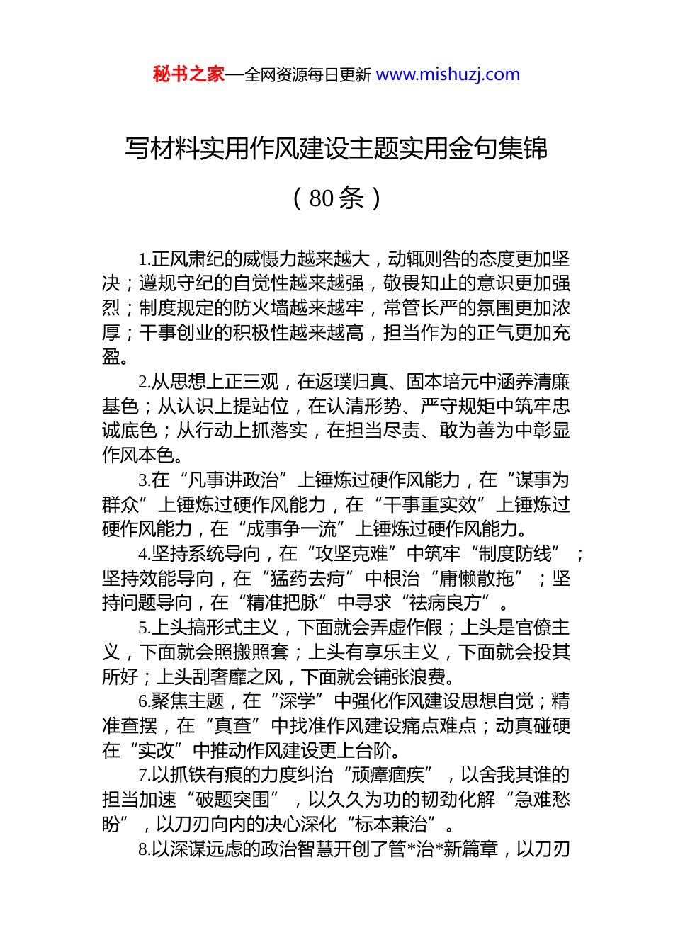 秘书之家—全网资源每日更新 www.mishuzj.com写材料实用作风建设主题实用金句集锦(80 条)1.正风肃纪的威慑力越来越大,动辄则咎的态度更加坚决;遵规守纪的自觉性越来越强,敬畏知止的意识更加强烈;制度规定的防火墙越来越牢,常管长严的氛围更加浓厚;干事创业的积极性越来越高,担当作为的正气更加充盈。2.从思想上正三观,在返璞归真、固本培元中涵养清廉基色;从认识上提站位,在认清形势、严守规矩中筑牢忠诚底色;从行动上抓落实,在担当尽责、敢为善为中彰显作风本色。3.在“凡事讲政治”上锤炼过硬作风能力,在“谋事为群众”上锤炼过硬作风能力,在“干事重实效”上锤炼过硬作风能力,在“成事争一流”上锤炼过硬作风能力。4.坚持系统导向,在“攻坚克难”中筑牢“制度防线”;坚持效能导向,在“猛药去疴”中根治“庸懒散拖”;坚持问题导向,在“精准把脉”中寻求“祛病良方”。5.上头搞形式主义,下面就会弄虚作假;上头是官僚主义,下面就会照搬照套;上头有享乐主义,下面就会投其所好;上头刮奢靡之风,下面就会铺张浪费。6.聚焦主题,在“深学”中强化作风建设思想自觉;精准查摆,在“真查”中找准作风建设痛点难点;动真碰硬在“实改”中推动作风建设更上台阶。7.以抓铁有痕的力度纠治“顽瘴痼疾”,以舍我其谁的担当加速“破题突围”,以久久为功的韧劲化解“急难愁盼”,以刀刃向内的决心深化“标本兼治”。8.以深谋远虑的政治智慧开创了管*治*新篇章,以刀刃秘书之家—全网资源每日更新 www.mishuzj.com向内的政治魄力重塑了作风建设新气象,以躬身力行的实干精神锻造了干部队伍新风貌。9.破除因循守旧,立敢闯敢试之志;破除推诿卸责,立担当作为之心;破除浮夸空谈,立求真求实之风;破除懒散享乐,立苦干实干之功。10.把锤炼*性作为推进作风建设的终身课题,把践行为民宗旨作为加强作风建设的内在要求,把实干担当作为检验作风建设的重要标尺。11.最核心的是坚定理想信念,清除思想杂草;最重要的是严格依法办事、规范权力运行;最关键的是高悬廉洁戒尺、坚守从政底线。12.以时不我待的精神状态加强作风建设,以刀刃向内的坚定决心直面作风问题,以旗帜鲜明的务实导向转变工作作风,以坚强有力的组织保障推动作风提升。13.以“事不避难”的担当破除惯性藩篱,以“向新而行”的锐气突破服务边界,让“马上就办”的作风穿透发展堵点,使“办就办好”的标准浸润民心期盼。14.把理论武装作为首要任务,把以上率下作为重要方法,把人民至上作为价值追求,把动真碰硬作为有力举措把落实责任制作为关键环节。15.克服不思进取、得过且过的懒惰心态,摒弃消极应付、推卸责任的做法,养成积极向上、认真负责的习惯,保持身心勤奋、事无积滞的状态。16.有的明哲保身、得过且过、畏难逃责不作为,有的庸政怠政、推诿扯皮、敷衍塞责慢作为,有的弄虚作假、欺上瞒下、编造政绩假作为。17.自欺欺人、装聋作哑的侥幸心理,法不责众、蒙混过关的错误心态,点到为止、见好就收的错误论调,松懈手软、好人主义的思想迷雾。18.作风问题涣散*的团结统一、损害中央权威;作风问题严重脱离人民群众、动摇执政根基;作风问题滋长腐败秘书之家—全网资源每日更新 www.mishuzj.com问题发生、破坏政治生态。19.这是*要管*、从严治*的应有之义,这是对标找差、对表落实的必须之为,这是推动发展、勇立排头的保障之基。20.过硬的作风是不断走向胜利的重要法宝,优良的作风是干事创业的内在要求,端正的作风是个人成长进步的立身之本。21.树立紧抓快办、一抓到底的作风,树立比学赶超、争先创优的作风,树立心系群众、勤政务实的作风。22.作风是基础工程,务必久久为功、常抓不懈;问题是改进方向,务必全面反思、深刻检视;实干是根本途径务必在干中改、在事上练;领导是最好榜样,务必以上率下、以身作则。23.把握根本遵循、坚定作风建设的正确方向,把握实践经验、保持作风建设的战略定力,把握形势任务、找准作风建设的发力方向。24.提高政治站位,做到主题不散;突出问题导向,做到整改不虚;坚持实干为要,做到方向不偏;统筹当前工作,做到载体不空。25.没有“舍我其谁”的...