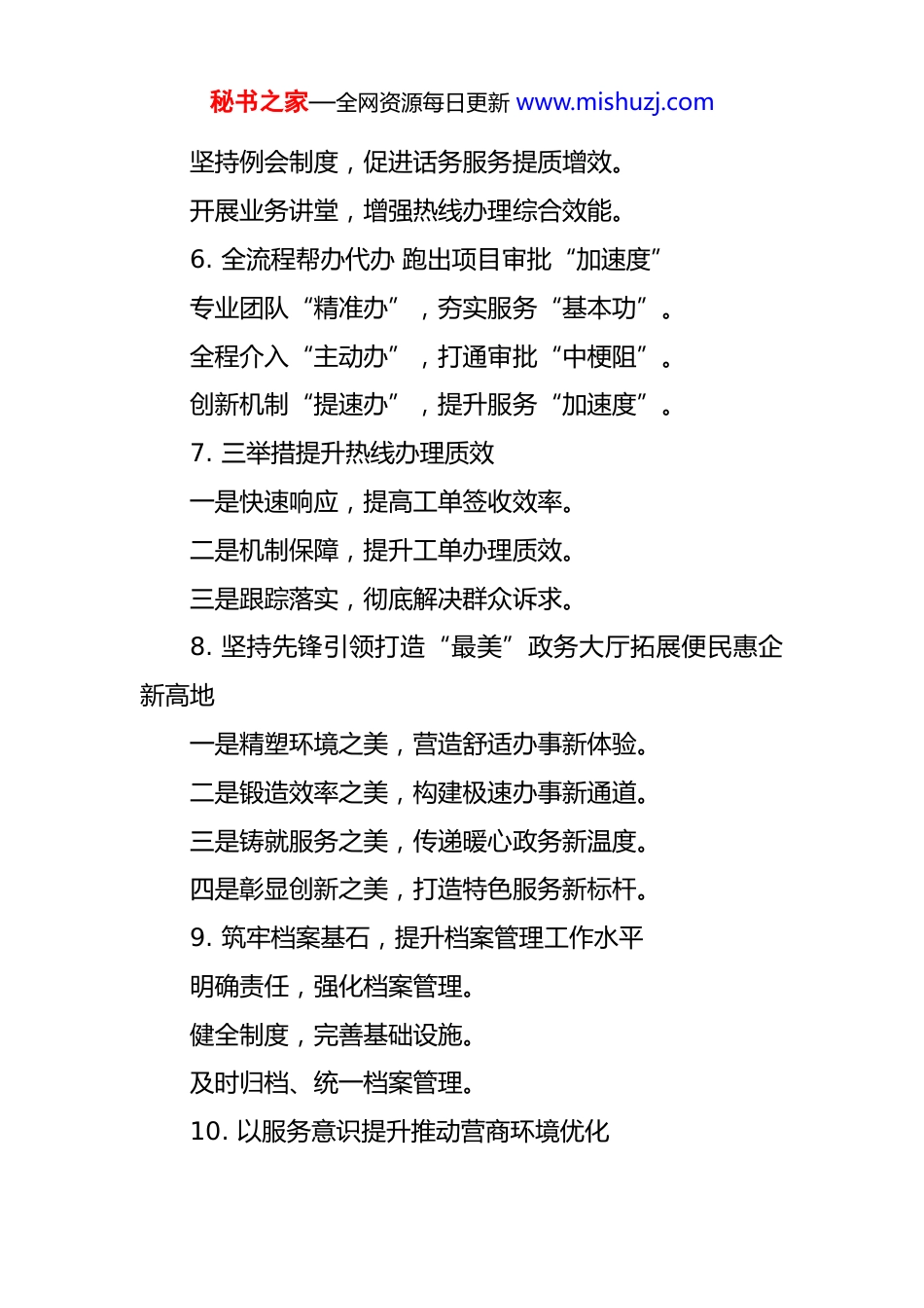 秘书之家—全网资源每日更新 www.mishuzj.com政务服务工作写作提纲 30 例 1. 扎实做好政务服务持续擦亮民生底色简化优化服务流程。健全完善救助体系。做细做实两险缴费。2. 巧用“加减乘除”提升服务质效做足“加法”,强化宣传促扩面。做好“减法”,服务群众零距离。做亮“乘法”,优质服务树形象。做实“除”法,风险防控显成效。3. 便民服务“小窗口”优化营商“大环境”完善基础设施,优化政务服务环境。线上线下联动,提升政务服务效能。强化服务意识,打造优质营商环境。4. “三化”助推营商环境质效双升“一体化”落实极简办。“集成化”保障一次办。“贴心化”推进帮代办。5. 业务培训强本领 充电赋能促提升强化专题培训,提升承办单位履职能力。秘书之家—全网资源每日更新 www.mishuzj.com坚持例会制度,促进话务服务提质增效。开展业务讲堂,增强热线办理综合效能。6. 全流程帮办代办 跑出项目审批“加速度”专业团队“精准办”,夯实服务“基本功”。全程介入“主动办”,打通审批“中梗阻”。创新机制“提速办”,提升服务“加速度”。7. 三举措提升热线办理质效一是快速响应,提高工单签收效率。二是机制保障,提升工单办理质效。三是跟踪落实,彻底解决群众诉求。8. 坚持先锋引领打造“最美”政务大厅拓展便民惠企新高地一是精塑环境之美,营造舒适办事新体验。二是锻造效率之美,构建极速办事新通道。三是铸就服务之美,传递暖心政务新温度。四是彰显创新之美,打造特色服务新标杆。9. 筑牢档案基石,提升档案管理工作水平明确责任,强化档案管理。健全制度,完善基础设施。及时归档、统一档案管理。10. 以服务意识提升推动营商环境优化秘书之家—全网资源每日更新 www.mishuzj.com秉持需求导向原则,精心优化服务流程。依托先进技术手段,全面提升服务效能。筑牢优良作风根基,着力锤炼服务队伍11. “多点发力”优化交易营商环境强内功,狠抓业务提升。优服务,力求主体满意。“数字+”,深化智慧交易。12. 激活信用“软实力”引擎筑牢公共资源交易“硬支撑”底座流程做“减法”,信用做“加法”,效能全面提升。减负出“实招”,信用增“底气”,企业轻装前行。监管融“信用”,生态更“清朗”,市场公平有序。13. 办好“小窗口”服务“大民生”聚焦服务质量,打造精准“综合窗口”。聚焦高效便捷,打造便民“集成窗口”。聚焦群众满意,打造温情“暖心窗口”。14. 业务办理提效率便民服务有温度规范化服务,彰显执行力度。便利化服务,提高办理速度。人性化服务,增添便民温度。15. “四化”推进政务服务改革“一窗通办”秘书之家—全网资源每日更新 www.mishuzj.com窗口设置规范化服务事项标准化服务流程人性化监督管理制度化16. 三措并举助力打造政务服务“新标杆”服务提效,便民利企有温度。流程优化,提升效率有速度。创新服务,激发活力有力度。17. 持续深化改革助推政务服务升级推动政务事项应进必进。优化一窗受理工作机制。畅通线上政务服务平台。18. 跑出政务服务“加速度”按下创新服务“启动键”。按下优化服务“加速键”。按下贴心服务“暖心键”。19. 以改革赋能促服务升级一、改革落地,服务效能稳步提升。二、对标找差,服务短板加速补齐。三、体验优化,服务流程持续完善。20. 提升政务服务效能助力优化营商环境秘书之家—全网资源每日更新 www.mishuzj.com聚焦“**服务”,推动服务提质增效。创新“**场景”,方便企业群众办事。强化“**监督”,构建亲清政商关系。21. “三举措”绘就政务服务“新画卷”数字赋能。服务升级。流程再造。22. 深化企业迁移登记“一件事”助推政务服务提质增效线上线下“融合办”。优化流程“便捷办”。部门联动“高效办”。23. 持续提升政务服务水平优化营商环境加快项目审批。优化服务理念。拓展服务渠道。24. 推进“三化” 建设解锁办事幸福密码推动政务服务标准化。推动政务服务规范化。推动政务服务便利化。25. 多措并举提升政务服务满意度秘书之家—全网资源每日更新 www.mishuzj.com窗口“一站式”布局。人员“一体化”管理。镇村“一盘棋”联动。26. 优化政务服...