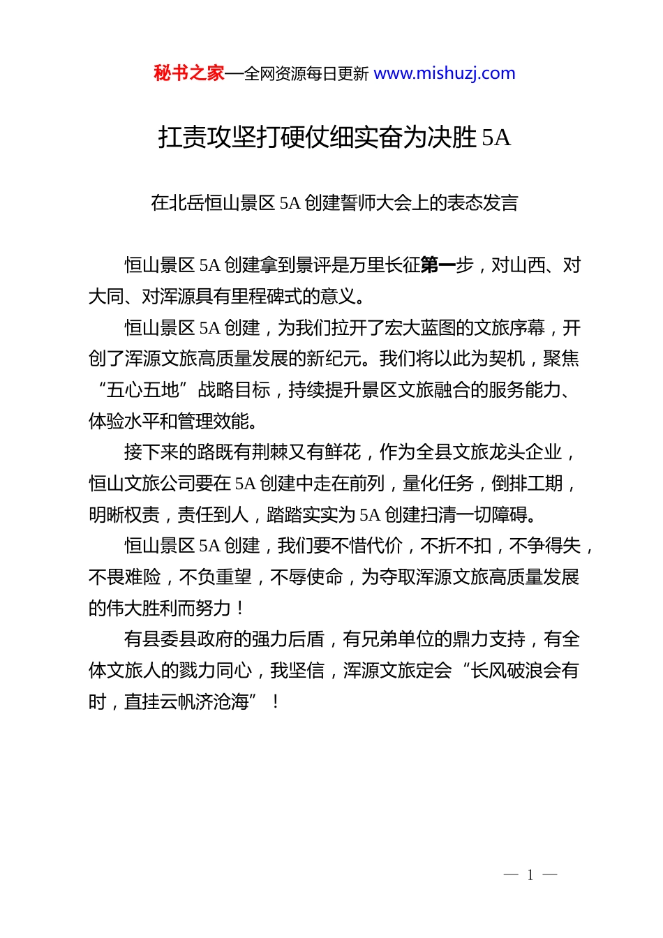 秘书之家—全网资源每日更新 www.mishuzj.com扛责攻坚打硬仗细实奋为决胜 5A在北岳恒山景区 5A 创建誓师大会上的表态发言恒山景区 5A 创建拿到景评是万里长征第一步,对山西、对大同、对浑源具有里程碑式的意义。恒山景区 5A 创建,为我们拉开了宏大蓝图的文旅序幕,开创了浑源文旅高质量发展的新纪元。我们将以此为契机,聚焦“五心五地”战略目标,持续提升景区文旅融合的服务能力、体验水平和管理效能。接下来的路既有荆棘又有鲜花,作为全县文旅龙头企业,恒山文旅公司要在 5A 创建中走在前列,量化任务,倒排工期,明晰权责,责任到人,踏踏实实为 5A 创建扫清一切障碍。恒山景区 5A 创建,我们要不惜代价,不折不扣,不争得失,不畏难险,不负重望,不辱使命,为夺取浑源文旅高质量发展的伟大胜利而努力!有县委县政府的强力后盾,有兄弟单位的鼎力支持,有全体文旅人的戮力同心,我坚信,浑源文旅定会“长风破浪会有时,直挂云帆济沧海”!— 1 —