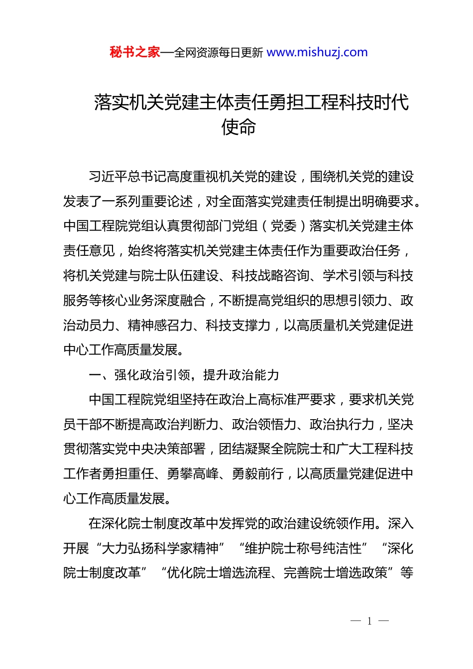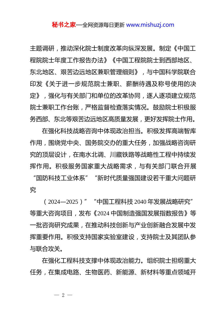 秘书之家—全网资源每日更新 www.mishuzj.com落实机关党建主体责任勇担工程科技时代使命习近平总书记高度重视机关党的建设,围绕机关党的建设发表了一系列重要论述,对全面落实党建责任制提出明确要求。中国工程院党组认真贯彻部门党组(党委)落实机关党建主体责任意见,始终将落实机关党建主体责任作为重要政治任务,将机关党建与院士队伍建设、科技战略咨询、学术引领与科技服务等核心业务深度融合,不断提高党组织的思想引领力、政治动员力、精神感召力、科技支撑力,以高质量机关党建促进中心工作高质量发展。一、强化政治引领,提升政治能力中国工程院党组坚持在政治上高标准严要求,要求机关党员干部不断提高政治判断力、政治领悟力、政治执行力,坚决贯彻落实党中央决策部署,团结凝聚全院院士和广大工程科技工作者勇担重任、勇攀高峰、勇毅前行,以高质量党建促进中心工作高质量发展。在深化院士制度改革中发挥党的政治建设统领作用。深入开展“大力弘扬科学家精神”“维护院士称号纯洁性”“深化院士制度改革”“优化院士增选流程、完善院士增选政策”等— 1 —秘书之家—全网资源每日更新 www.mishuzj.com主题调研,推动深化院士制度改革向纵深发展。制定《中国工程院院士年度工作报告办法》《中国工程院院士到西部地区、东北地区、艰苦边远地区兼职管理细则》,与中国科学院联合印发《关于进一步规范院士兼职、薪酬待遇及称号使用的决定》,强化与有关部门和单位的改革协同,逐人逐项建立规范院士兼职工作台账,严格监督检查落实情况。鼓励院士积极服务西部、东北等艰苦边远地区高质量发展,更好发挥院士作用。在强化科技战略咨询中体现政治担当。积极发挥高端智库作用,围绕党中央、国务院交办的重大任务,加强战略咨询研究的顶层设计,在南水北调、川藏铁路等战略性工程中持续发挥作用。积极服务国家重大战略需求,与有关部门联合开展“国防科技工业体系”“新时代质量强国建设若干重大问题研究(2024—2025)”“中国工程科技 2040 年发展战略研究”等重大咨询项目,发布《2024 中国制造强国发展指数报告》等一批咨询研究成果,在推动科技创新与产业创新融合发展中发挥重要作用。积极支持国家实验室建设,支持院士及其团队参与联合攻关。在强化工程科技支撑中体现政治能力。组织院士担纲重大任务,在集成电路、生物医药、新能源、新材料等重点领域开— 2 —秘书之家—全网资源每日更新 www.mishuzj.com展原创性、引领性科技攻关。根据西部、东北等地区重点产业领域创新需求,组织院士行、院士恳谈会等活动。强化定点帮扶政治责任,2024 年组织院士 30 余人次对帮扶地区进行指导,探索出以优质农业资源为基础,以招商引资为手段,以引进行业龙头企业为载体,一二三产业融合的产业化发展新路径。建立长效服务机制,以柑橘产业为抓手,助力赣州、吉安等革命老区高质量发展。二、强化理论武装,夯实思想根基中国工程院党组始终把带头做到“两个维护”作为加强机关党建的首要任务,确保工程科技事业始终在党的领导下健康发展。扎实开展学习教育,持续做好学习成果转化。院党组把强化党的创新理论武装作为落实机关党建主体责任的重要内容,高质量开展学习教育,保持机关党员干部队伍的先进性和纯洁性,增强机关党组织的凝聚力和战斗力。深入学习宣传贯彻党的二十大和二十届二中、三中全会精神,深入学习贯彻习近平总书记在全国科技大会上的重要讲话精神和致中国工程院建院30 周年贺信精神,教育引导广大院士和党员干部坚定拥护“两个确立”、坚决做到“两个维护”,把学习教育成果转化为推进新时代工程科技事业高质量发展的智慧和力量。— 3 —秘书之家—全网资源每日更新 www.mishuzj.com强化院士队伍学习教育,筑牢政治忠诚。完善机关对院士队伍学习教育的服务管理职能,组织新当选院士开展集中学习教育,党组书记作“维护院士称号纯洁性”专题报告,为新当选院士讲好“入院第一课”。建立和坚持学部常委会“第一议题”制度,把党的创新理论学习成果转化为推动工程科技创新的强大动力。组织院士开展学习贯彻习近平新时代中国特色社会主义思想专题培训...