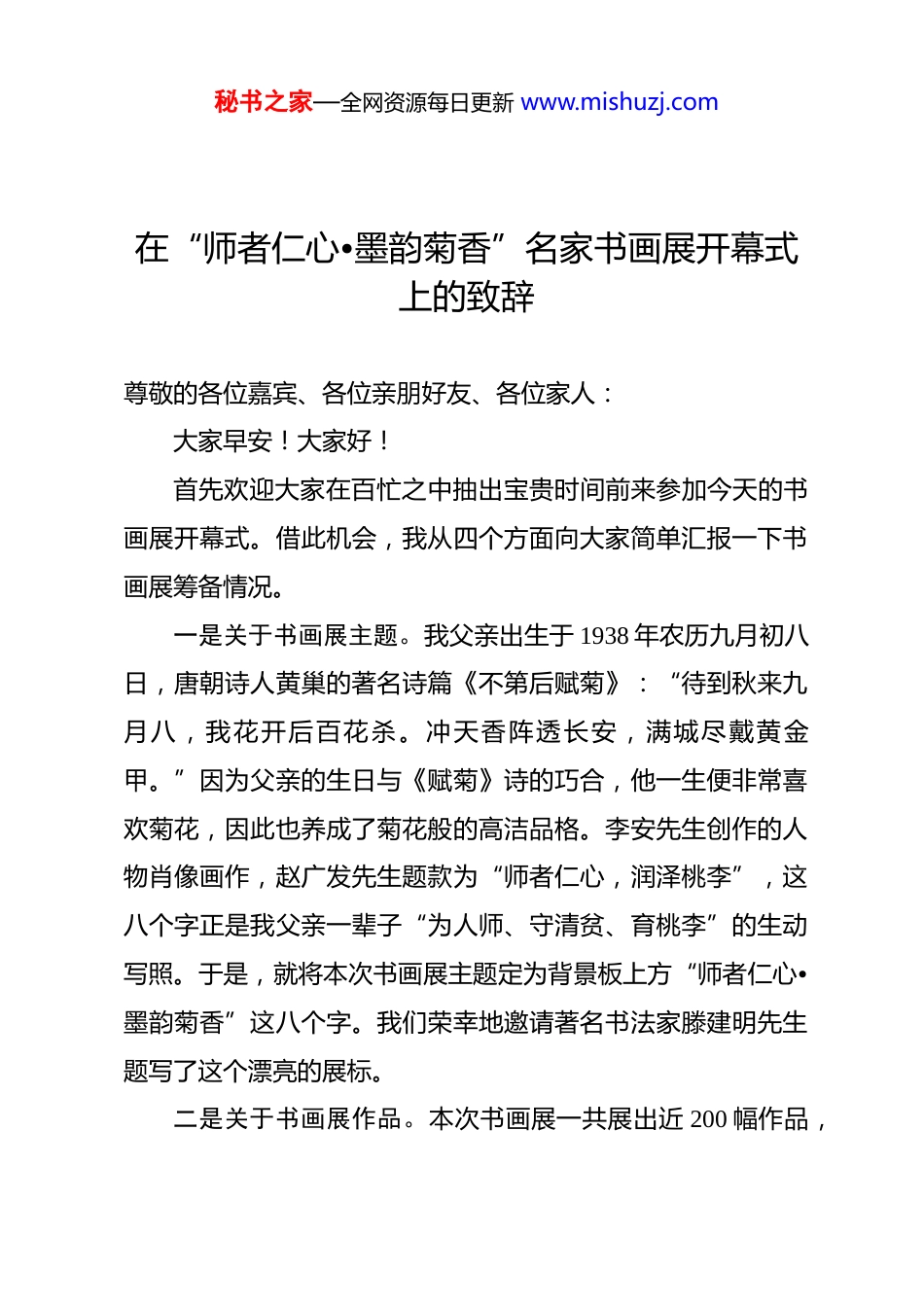 秘书之家—全网资源每日更新 www.mishuzj.com在“师者仁心•墨韵菊香”名家书画展开幕式上的致辞尊敬的各位嘉宾、各位亲朋好友、各位家人:大家早安!大家好!首先欢迎大家在百忙之中抽出宝贵时间前来参加今天的书画展开幕式。借此机会,我从四个方面向大家简单汇报一下书画展筹备情况。一是关于书画展主题。我父亲出生于 1938 年农历九月初八日,唐朝诗人黄巢的著名诗篇《不第后赋菊》:“待到秋来九月八,我花开后百花杀。冲天香阵透长安,满城尽戴黄金甲。”因为父亲的生日与《赋菊》诗的巧合,他一生便非常喜欢菊花,因此也养成了菊花般的高洁品格。李安先生创作的人物肖像画作,赵广发先生题款为“师者仁心,润泽桃李”,这八个字正是我父亲一辈子“为人师、守清贫、育桃李”的生动写照。于是,就将本次书画展主题定为背景板上方“师者仁心•墨韵菊香”这八个字。我们荣幸地邀请著名书法家滕建明先生题写了这个漂亮的展标。二是关于书画展作品。本次书画展一共展出近 200 幅作品,秘书之家—全网资源每日更新 www.mishuzj.com多数来自全国各地、五湖四海,也有侨居海外加拿大和澳大利亚等国家的华人华侨的祝寿作品。主要来自四个方面:一是面向全国征集的作品,包括杨利民、连辑等 6 位省部级领导的书画作品;二是面向靖远邀约的作品,包括关振邦、贺东、张克勤等本土书法家的作品;三是面向家族内邀约的作品,有我伯父刘正华、我姑父王兆民、老家长刘正旭,也有刘霖、刘占丽等年轻书画家的作品;四是旗杆院收藏的与历次祝寿活动相关的藏品,包括范振绪、尹建鼎等老一辈书法家的作品。200 幅作品中,中书协会员、中美协会员的作品占到一半以上,作品质量是实实在在、货真价实的,作品整体水平比较高,因此,本次书画展称之为“名家书画展”是实至名归的。三是关于书画展意义。刘氏百年旗杆院是有祝寿传统的。就我了解的情况,旗杆院百年历史上有过三次大的祝寿活动,都留下了很多珍贵墨宝。1935 年我曾祖母武太夫人(革命先烈武兆友的姑奶)85 岁寿诞,为其举办了九秩寿庆,留下了范振绪的“壸德可风”寿匾,本次会展出;1989 年我祖父祖母 80 寿庆,留下了大量墨宝,这次会展出部分藏品;2011 年我伯父正华公 80 大寿,刘氏家族和平凉文化界举办了大型寿庆活动,留下上百幅书画作品。今年 2025 年是父亲 88 米寿之年,套用范老夫子范振绪的话:“八五往过,就是九秩”,我们为辛劳一秘书之家—全网资源每日更新 www.mishuzj.com生、劳苦功高的老父亲筹备一场祝寿书画展,以文化的方式为老父亲祝寿祈福,既是尽孝,也是传承。中国祝寿传统文化绵延几千年,自有它存在的道理,不能在我们这一代丢掉。这就是举办本次书画展的意义。四是致敬与感恩。我父亲是靖远一中的校友,他在《百年旗杆院》三卷中都写到了靖远一中上世纪 50 年代的故事。为了致敬母校,感恩母校,在今天这个庄重的场合,88 岁的校友要为 83 岁的母校捐赠《百年旗杆院》三卷本两套。为了致敬家乡,感恩家乡,支持文化靖远建设,我们向靖远文化馆捐赠中国书法家协会会员马辉志先生创作的书法作品《靖远赋》10 条屏,为靖远文化建设尽绵薄之力,将家族文化与靖远文化紧紧连接起来。最后,感谢所有为本次书画展创作书画作品的每一位书法家、美术家、艺术家!感谢靖远文化馆为本次书画展付出的巨大辛劳!我深切感受到靖远文化馆的优秀团队是一支特别能吃苦、特别能奉献、特别能创新的团队!感谢中靖环境公司为本次书画展提供场馆支持!感谢方方面面领导的关心和支持!最后希望大家在随后的书画巡展中多交流、开眼界,长见识、有收获。谢谢大家!