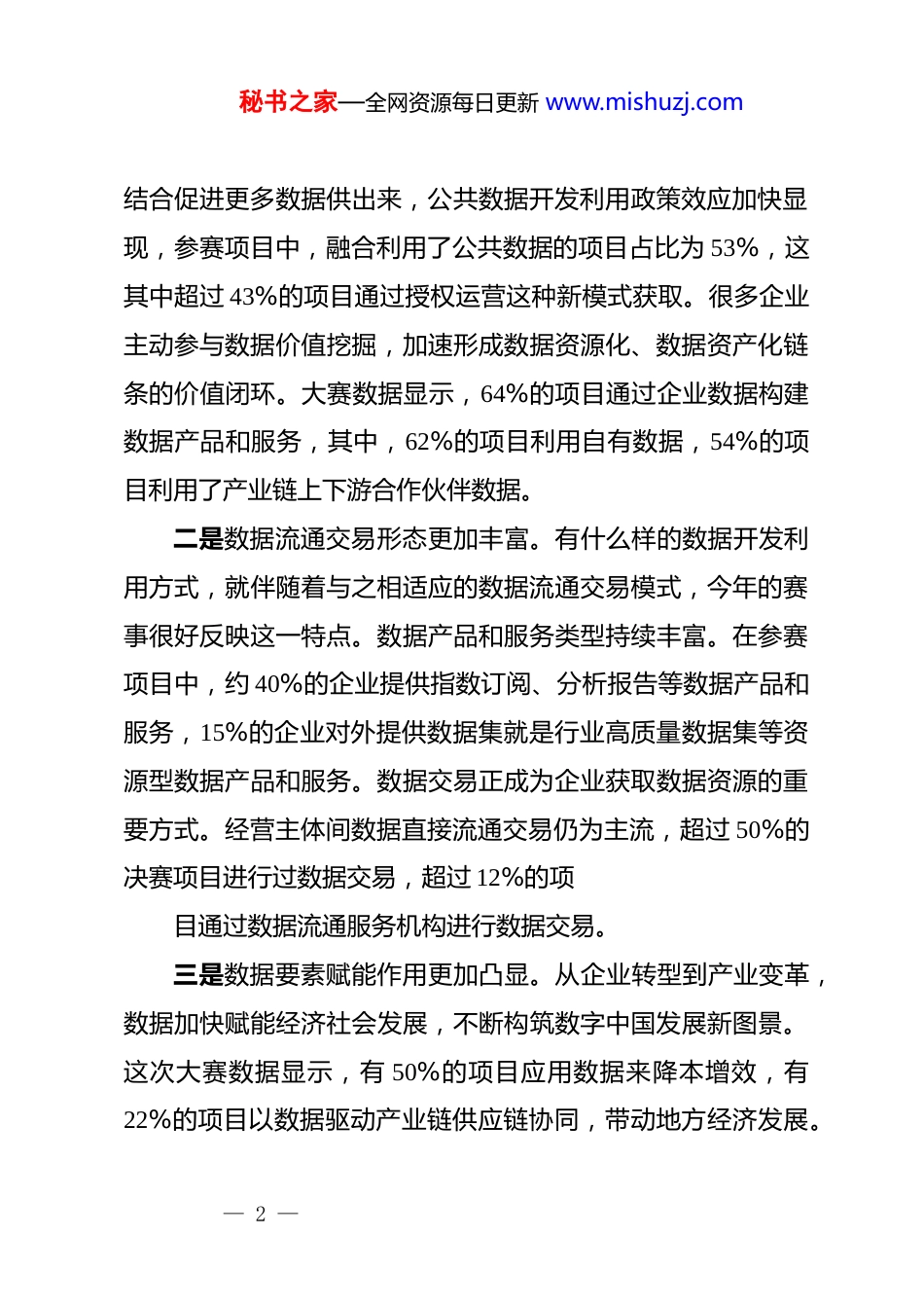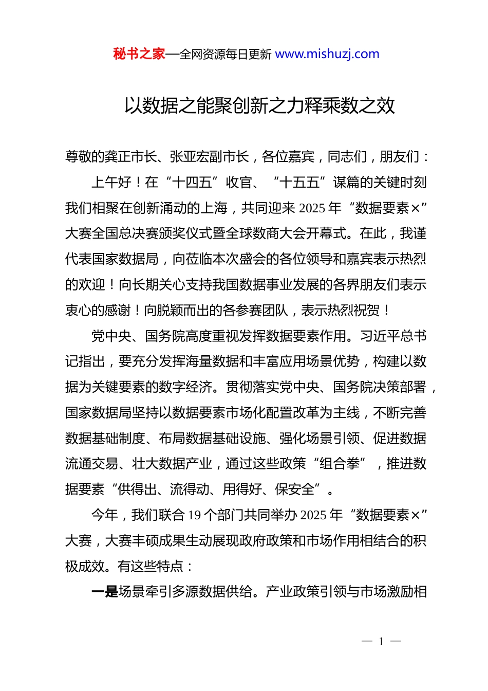 秘书之家—全网资源每日更新 www.mishuzj.com以数据之能聚创新之力释乘数之效尊敬的龚正市长、张亚宏副市长,各位嘉宾,同志们,朋友们:上午好!在“十四五”收官、“十五五”谋篇的关键时刻我们相聚在创新涌动的上海,共同迎来 2025 年“数据要素×”大赛全国总决赛颁奖仪式暨全球数商大会开幕式。在此,我谨代表国家数据局,向莅临本次盛会的各位领导和嘉宾表示热烈的欢迎!向长期关心支持我国数据事业发展的各界朋友们表示衷心的感谢!向脱颖而出的各参赛团队,表示热烈祝贺!党中央、国务院高度重视发挥数据要素作用。习近平总书记指出,要充分发挥海量数据和丰富应用场景优势,构建以数据为关键要素的数字经济。贯彻落实党中央、国务院决策部署,国家数据局坚持以数据要素市场化配置改革为主线,不断完善数据基础制度、布局数据基础设施、强化场景引领、促进数据流通交易、壮大数据产业,通过这些政策“组合拳”,推进数据要素“供得出、流得动、用得好、保安全”。今年,我们联合 19 个部门共同举办 2025 年“数据要素×”大赛,大赛丰硕成果生动展现政府政策和市场作用相结合的积极成效。有这些特点:一是场景牵引多源数据供给。产业政策引领与市场激励相— 1 —秘书之家—全网资源每日更新 www.mishuzj.com结合促进更多数据供出来,公共数据开发利用政策效应加快显现,参赛项目中,融合利用了公共数据的项目占比为 53%,这其中超过 43%的项目通过授权运营这种新模式获取。很多企业主动参与数据价值挖掘,加速形成数据资源化、数据资产化链条的价值闭环。大赛数据显示,64%的项目通过企业数据构建数据产品和服务,其中,62%的项目利用自有数据,54%的项目利用了产业链上下游合作伙伴数据。二是数据流通交易形态更加丰富。有什么样的数据开发利用方式,就伴随着与之相适应的数据流通交易模式,今年的赛事很好反映这一特点。数据产品和服务类型持续丰富。在参赛项目中,约 40%的企业提供指数订阅、分析报告等数据产品和服务,15%的企业对外提供数据集就是行业高质量数据集等资源型数据产品和服务。数据交易正成为企业获取数据资源的重要方式。经营主体间数据直接流通交易仍为主流,超过 50%的决赛项目进行过数据交易,超过 12%的项目通过数据流通服务机构进行数据交易。三是数据要素赋能作用更加凸显。从企业转型到产业变革,数据加快赋能经济社会发展,不断构筑数字中国发展新图景。这次大赛数据显示,有 50%的项目应用数据来降本增效,有22%的项目以数据驱动产业链供应链协同,带动地方经济发展。— 2 —秘书之家—全网资源每日更新 www.mishuzj.com同时,有 32%和 19%的项目实现带动就业和绿色低碳发展等社会效益。此外,西部地区斩获颇丰,勇夺城市治理、科技创新、金融服务等赛道总决赛一等奖,展现出数据助力区域协同发展的巨大潜力。四是数据基础设施支撑更加有力。我们知道,数据的可复制、易传输、规模报酬递增等特点,加上数据可能承载的个人信息、商业秘密等,决定了数据在具有很强正外部性的同时,也具有负外部性,其开发利用离不开各方互信、安全可控的基础设施支撑。数据基础设施正成为打破数据安全合规高效流通“不可能三角”,促进数据安全合规高效流通的重要基础设施保障。本次大赛中,超过 15%的项目以可信数据空间为依托,深度集成隐私保护计算、区块链等技术,构建贯穿数据流通利用全流程的信任链条,使得数据流通利用过程“可管、可控、可计量”,推动医疗、工业、深空探测等领域高价值数据的深度开发利用。五是以赛促用促产效应加快发挥。各地深挖办赛潜能,将赛事举办同时作为数据政策的宣讲会、数据资源的对接会,制度改革的试验场,大赛不仅成为优秀项目的发现地,更成为各方着力解决“从哪找数、如何用数、用数效益”等现实问题的实践地。充分发挥大赛的作用,多地通过“奖补政策+生态搭— 3 —秘书之家—全网资源每日更新 www.mishuzj.com建+案例示范+资源对接”等方式,让参赛企业获得实实在在的支持。此次全球数商大会期间,上海还为获奖项目提供了路演展示、行业交流、产融对接和“园区行”等多场活动,切实增强了参...