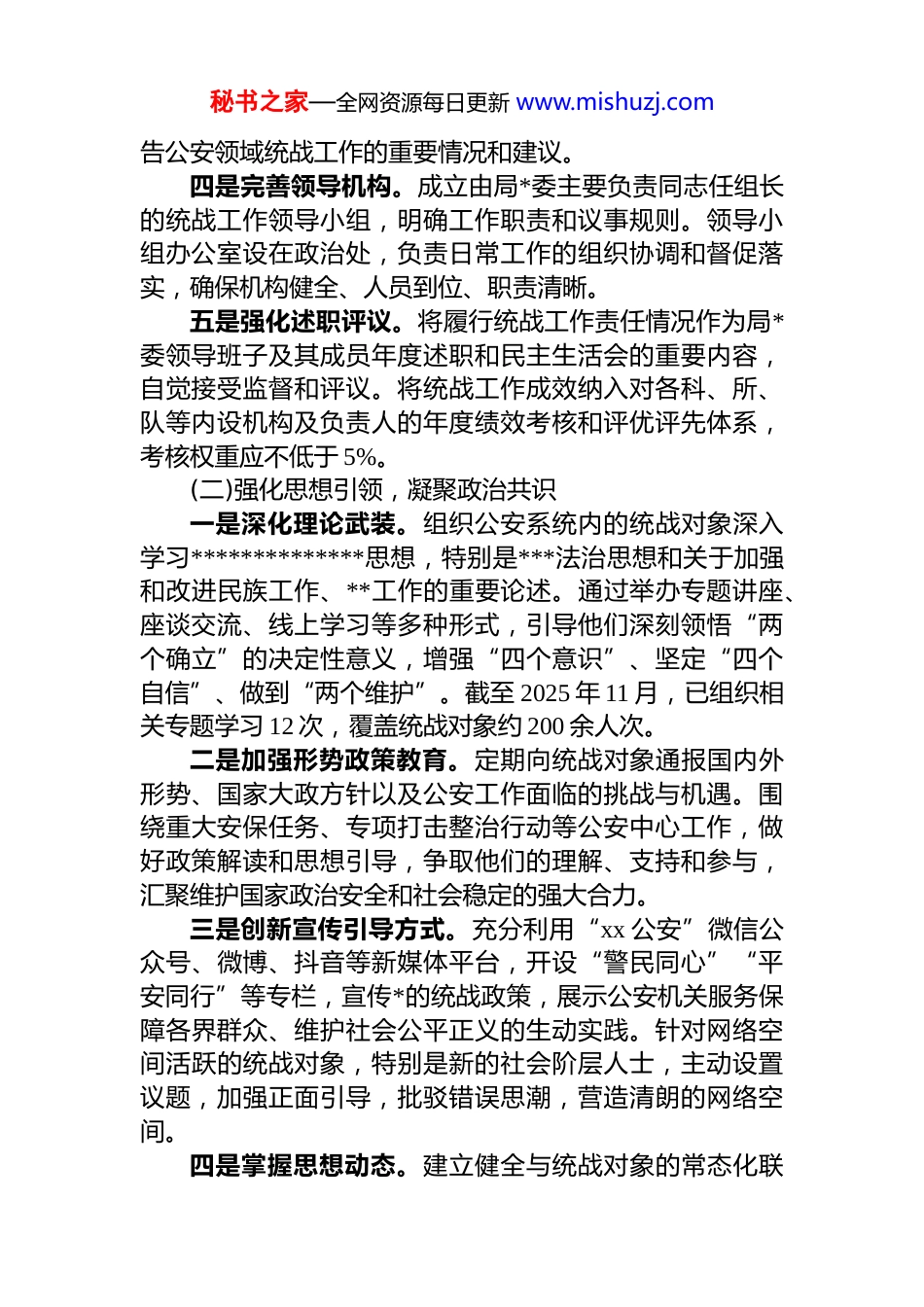 秘书之家—全网资源每日更新 www.mishuzj.comxx 县公安局委员会统战工作责任清单和领导班子成员统战工作职责清单为深入学习贯彻******关于做好新时代*的统一战线工作的重要思想,全面落实中共中央《中国共产*统一战线工作条例》《*委(*组)落实统战工作责任制规定》等*内法规文件精神,以及江西省委统战部的相关工作要求,进一步压实中共 xx 县公安局委员会统战工作主体责任和领导班子成员“一岗双责”,确保*中央关于统战工作的决策部署在公安机关得到不折不扣的贯彻执行,结合我县公安工作实际,特制定本责任清单和职责清单。一、中共 xx 县公安局委员会统战工作责任清单局*委是 xx 县公安机关统战工作的责任主体,对全县公安系统统战工作负全面领导责任。(一)落实主体责任,加强组织领导一是坚决贯彻执行。深入学习、宣传和贯彻落实******关于做好新时代*的统一战线工作的重要思想以及*中央、上级*委关于统一战线的各项决策部署、法律法规和政策文件。确保*的统战理论和方针政策在公安工作中得到全面体现和有效执行,始终坚持*对公安统战工作的集中统一领导。二是纳入总体工作布局。将统战工作纳入局*委年度工作要点、重要议事日程和整体工作规划,与公安中心工作同谋划、同部署、同推进、同考核。确保统战工作有计划有步骤、有目标地稳步开展。三是健全议事协调机制。局*委每年至少召开两次专题会议,研究部署统战工作,分析研判形势,解决重大问题定期听取统战工作情况汇报,及时向县委和市公安局*委报秘书之家—全网资源每日更新 www.mishuzj.com告公安领域统战工作的重要情况和建议。四是完善领导机构。成立由局*委主要负责同志任组长的统战工作领导小组,明确工作职责和议事规则。领导小组办公室设在政治处,负责日常工作的组织协调和督促落实,确保机构健全、人员到位、职责清晰。五是强化述职评议。将履行统战工作责任情况作为局*委领导班子及其成员年度述职和民主生活会的重要内容,自觉接受监督和评议。将统战工作成效纳入对各科、所、队等内设机构及负责人的年度绩效考核和评优评先体系,考核权重应不低于 5%。(二)强化思想引领,凝聚政治共识一是深化理论武装。组织公安系统内的统战对象深入学习**************思想,特别是***法治思想和关于加强和改进民族工作、**工作的重要论述。通过举办专题讲座、座谈交流、线上学习等多种形式,引导他们深刻领悟“两个确立”的决定性意义,增强“四个意识”、坚定“四个自信”、做到“两个维护”。截至 2025 年 11 月,已组织相关专题学习 12 次,覆盖统战对象约 200 余人次。二是加强形势政策教育。定期向统战对象通报国内外形势、国家大政方针以及公安工作面临的挑战与机遇。围绕重大安保任务、专项打击整治行动等公安中心工作,做好政策解读和思想引导,争取他们的理解、支持和参与,汇聚维护国家政治安全和社会稳定的强大合力。三是创新宣传引导方式。充分利用“xx 公安”微信公众号、微博、抖音等新媒体平台,开设“警民同心”“平安同行”等专栏,宣传*的统战政策,展示公安机关服务保障各界群众、维护社会公平正义的生动实践。针对网络空间活跃的统战对象,特别是新的社会阶层人士,主动设置议题,加强正面引导,批驳错误思潮,营造清朗的网络空间。四是掌握思想动态。建立健全与统战对象的常态化联秘书之家—全网资源每日更新 www.mishuzj.com系沟通机制,通过走访、座谈、问卷调查等方式,及时掌握他们的思想动态、利益诉求和实际困难。建立公安系统统战领域舆情监测和分析研判机制,特别是针对民族、**等敏感领域,做到早发现、早报告、早处置,牢牢掌握意识形态工作主动权。(三)聚焦重点领域,服务中心大局一是扎实做好民族工作。全面贯彻*的民族政策,依法保障少数民族群众的合法权益。在窗口服务、案件办理、社区警务等工作中,尊重少数民族风俗习惯。加强对辖区内少数民族流动人口的服务管理,帮助他们融入本地社会严密防范和坚决依法打击境内外敌对势力利用民族问题进行的渗透、分裂、破坏活动,维护民族团结和边疆稳定。2025 年以来,成功调处涉民族因素矛盾纠纷 23 起,化解率达到 98...