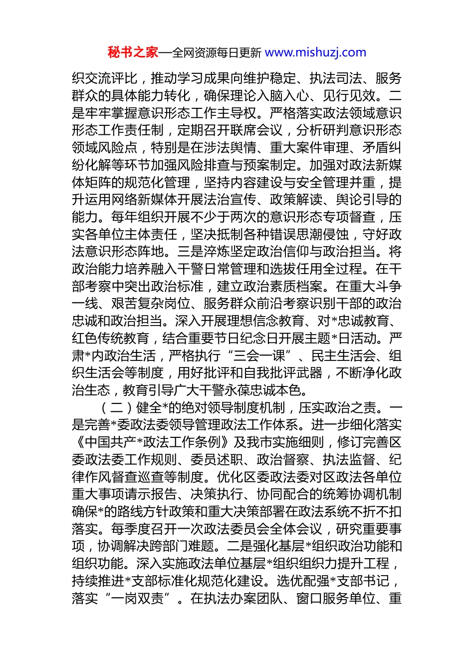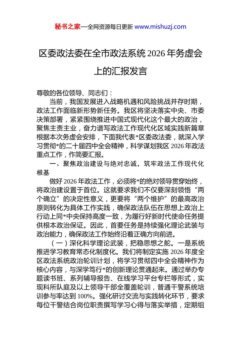 秘书之家—全网资源每日更新 www.mishuzj.com区委政法委在全市政法系统 2026 年务虚会上的汇报发言尊敬的各位领导、同志们:当前,我国发展进入战略机遇和风险挑战并存时期,政法工作面临新形势新任务。我区将坚决落实中央、市委决策部署,紧紧围绕推进中国式现代化这个最大的政治,聚焦主责主业,奋力谱写政法工作现代化区域实践新篇章根据本次务虚会安排,下面我代表*区委政法委,就深入学习贯彻*的二十届四中全会精神,科学谋划我区 2026 年政法重点工作,作简要汇报。一、聚焦政治建设与绝对忠诚,筑牢政法工作现代化根基做好 2026 年政法工作,必须将*的绝对领导贯穿始终,将政治建设置于首位。这就要求我们不仅要深刻领悟“两个确立”的决定性意义,更要将“两个维护”的最高政治原则转化为具体工作实践,确保政法队伍在思想上政治上行动上同*中央保持高度一致,为履行好新时代使命任务提供根本政治保证。因此,首要任务是持续强化理论武装与政治能力,确保政法工作始终沿着正确方向前进。(一)深化科学理论武装,把稳思想之舵。一是系统推进学习教育常态化制度化。我们将制定实施 2026 年度全区政法系统政治轮训计划,将学习贯彻四中全会精神作为核心内容,与深学笃行*的创新理论贯通起来。通过举办专题读书班、系列辅导报告、在线学习平台专栏等形式,实现科所队庭及以上领导干部全覆盖轮训,普通干警系统培训参与率达到 100%。强化研讨交流与实践转化环节,要求每位干警结合岗位职责撰写学习心得与落实举措,定期组秘书之家—全网资源每日更新 www.mishuzj.com织交流评比,推动学习成果向维护稳定、执法司法、服务群众的具体能力转化,确保理论入脑入心、见行见效。二是牢牢掌握意识形态工作主导权。严格落实政法领域意识形态工作责任制,定期召开联席会议,分析研判意识形态领域风险点,特别是在涉法舆情、重大案件审理、矛盾纠纷化解等环节加强风险排查与预案制定。加强对政法新媒体矩阵的规范化管理,坚持内容建设与安全管理并重,提升运用网络新媒体开展法治宣传、政策解读、舆论引导的能力。每年组织开展不少于两次的意识形态专项督查,压实各单位主体责任,坚决抵制各种错误思潮侵蚀,守好政法意识形态阵地。三是淬炼坚定政治信仰与政治担当。将政治能力培养融入干警日常管理和选拔任用全过程。在干部考察中突出政治标准,建立政治素质档案。在重大斗争一线、艰苦复杂岗位、服务群众前沿考察识别干部的政治忠诚和政治担当。深入开展理想信念教育、对*忠诚教育、红色传统教育,结合重要节日纪念日开展主题*日活动。严肃*内政治生活,严格执行“三会一课”、民主生活会、组织生活会等制度,用好批评和自我批评武器,不断净化政治生态,教育引导广大干警永葆忠诚本色。(二)健全*的绝对领导制度机制,压实政治之责。一是完善*委政法委领导管理政法工作体系。进一步细化落实《中国共产*政法工作条例》及我市实施细则,修订完善区委政法委工作规则、委员述职、政治督察、执法监督、纪律作风督查巡查等制度。优化区委政法委对区政法各单位重大事项请示报告、决策执行、协同配合的统筹协调机制确保*的路线方针政策和重大决策部署在政法系统不折不扣落实。每季度召开一次政法委员会全体会议,研究重要事项,协调解决跨部门难题。二是强化基层*组织政治功能和组织功能。深入实施政法单位基层*组织组织力提升工程,持续推进*支部标准化规范化建设。选优配强*支部书记,落实“一岗双责”。在执法办案团队、窗口服务单位、重秘书之家—全网资源每日更新 www.mishuzj.com大项目工作组等设立*员先锋岗、责任区,推动 dj 与业务深度融合。每年对基层*支部建设情况进行全覆盖检查评估,评选表彰一批“政法先锋*支部”,整顿软弱涣散基层*组织,把基层*组织建设成为坚强战斗堡垒。三是严格执行政治纪律和政治规矩。将政治纪律和政治规矩教育作为干警入职、晋升、培训的必修课。加强对贯彻执行中央八项规定及其实施细则精神、防止干预司法“三个规定”等铁规禁令情况的监督检查。运用监督执纪“四种形态”,特别是第一种形态,对苗头性、倾向性问题及时提醒、批评、纠...