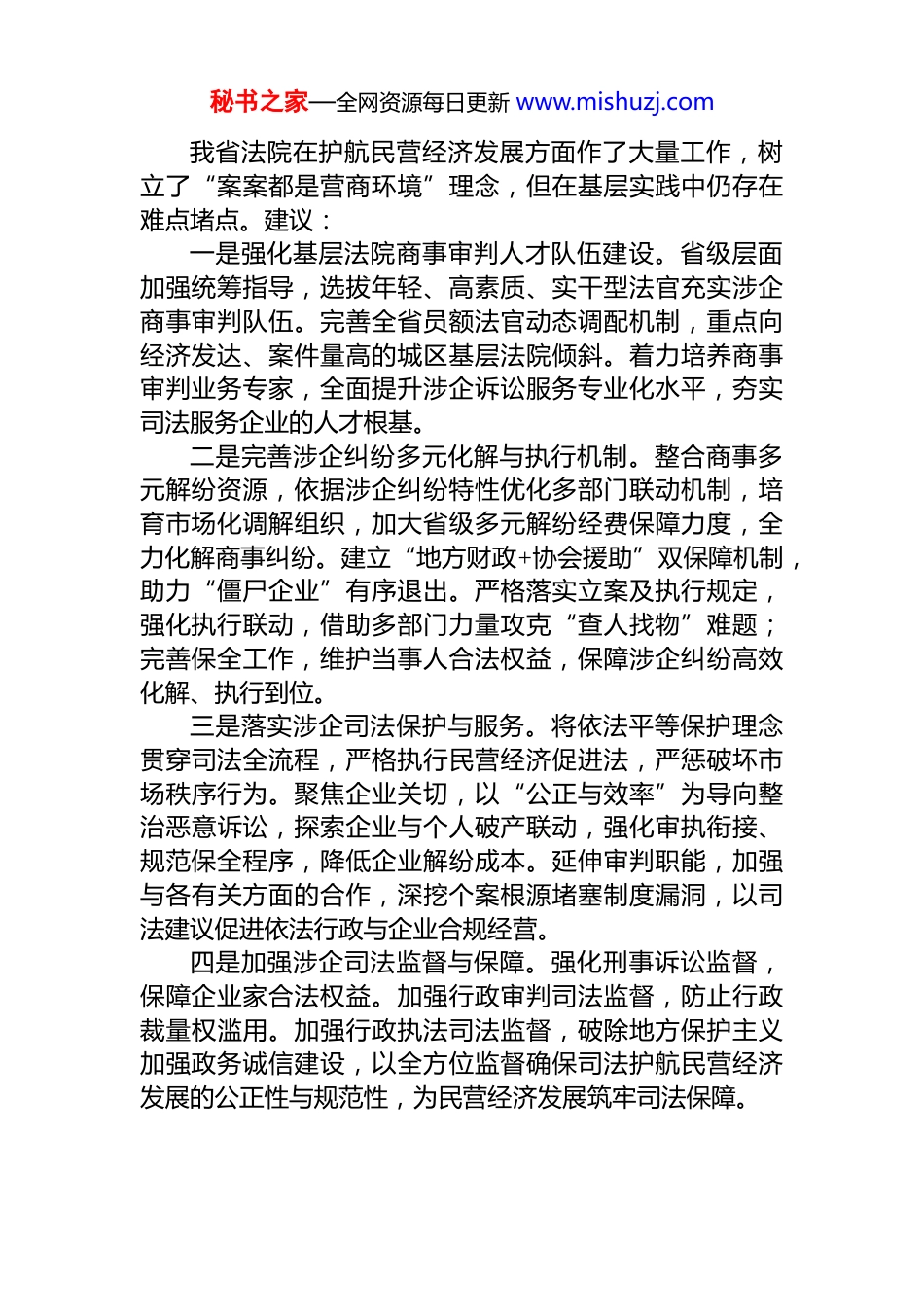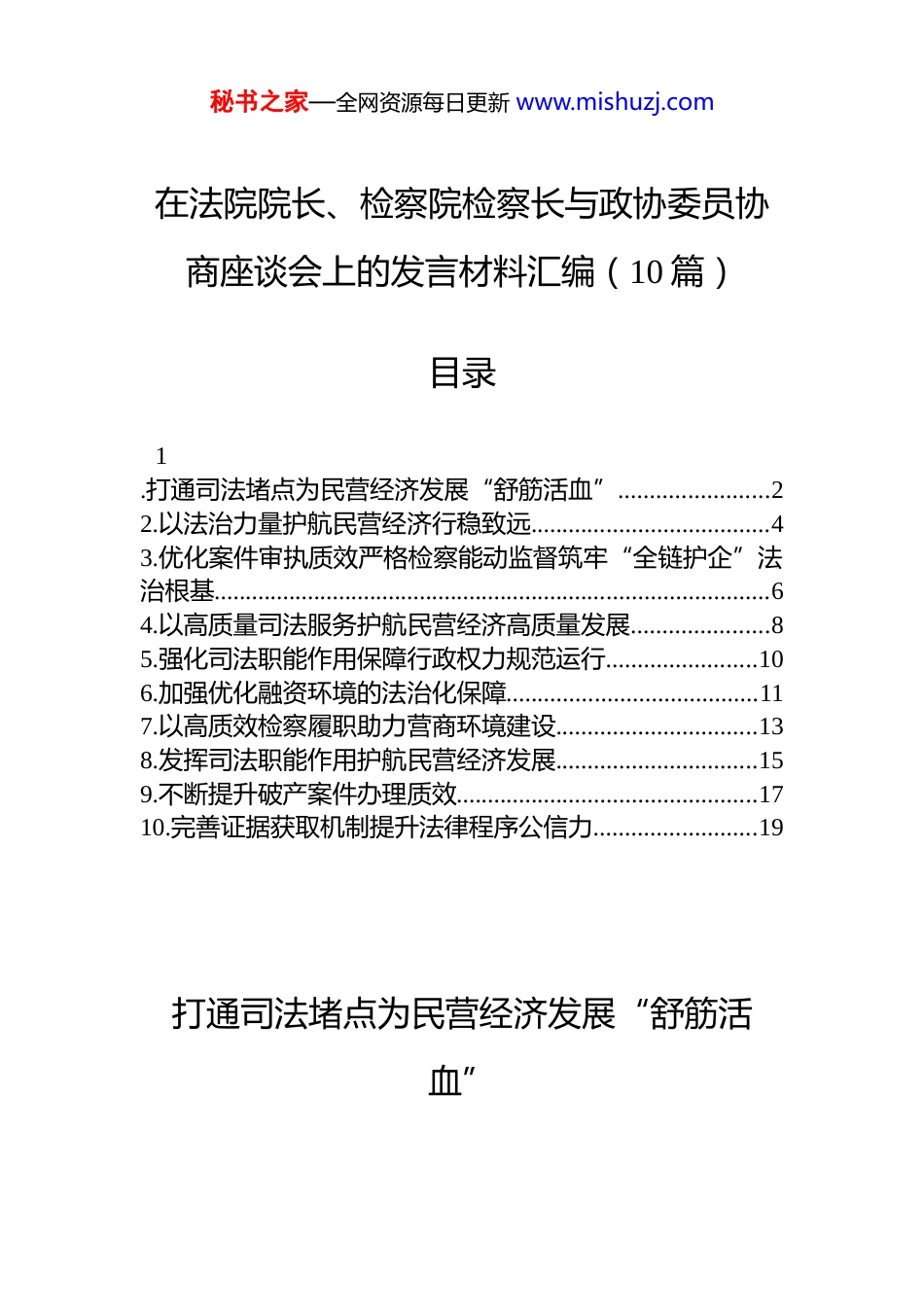 秘书之家—全网资源每日更新 www.mishuzj.com在法院院长、检察院检察长与政协委员协商座谈会上的发言材料汇编(10 篇)目录1.打通司法堵点为民营经济发展“舒筋活血”........................22.以法治力量护航民营经济行稳致远......................................43.优化案件审执质效严格检察能动监督筑牢“全链护企”法治根基.........................................................................................64.以高质量司法服务护航民营经济高质量发展......................85.强化司法职能作用保障行政权力规范运行........................106.加强优化融资环境的法治化保障........................................117.以高质效检察履职助力营商环境建设................................138.发挥司法职能作用护航民营经济发展................................159.不断提升破产案件办理质效................................................1710.完善证据获取机制提升法律程序公信力..........................19打通司法堵点为民营经济发展“舒筋活血”秘书之家—全网资源每日更新 www.mishuzj.com我省法院在护航民营经济发展方面作了大量工作,树立了“案案都是营商环境”理念,但在基层实践中仍存在难点堵点。建议:一是强化基层法院商事审判人才队伍建设。省级层面加强统筹指导,选拔年轻、高素质、实干型法官充实涉企商事审判队伍。完善全省员额法官动态调配机制,重点向经济发达、案件量高的城区基层法院倾斜。着力培养商事审判业务专家,全面提升涉企诉讼服务专业化水平,夯实司法服务企业的人才根基。二是完善涉企纠纷多元化解与执行机制。整合商事多元解纷资源,依据涉企纠纷特性优化多部门联动机制,培育市场化调解组织,加大省级多元解纷经费保障力度,全力化解商事纠纷。建立“地方财政+协会援助”双保障机制,助力“僵尸企业”有序退出。严格落实立案及执行规定,强化执行联动,借助多部门力量攻克“查人找物”难题;完善保全工作,维护当事人合法权益,保障涉企纠纷高效化解、执行到位。三是落实涉企司法保护与服务。将依法平等保护理念贯穿司法全流程,严格执行民营经济促进法,严惩破坏市场秩序行为。聚焦企业关切,以“公正与效率”为导向整治恶意诉讼,探索企业与个人破产联动,强化审执衔接、规范保全程序,降低企业解纷成本。延伸审判职能,加强与各有关方面的合作,深挖个案根源堵塞制度漏洞,以司法建议促进依法行政与企业合规经营。四是加强涉企司法监督与保障。强化刑事诉讼监督,保障企业家合法权益。加强行政审判司法监督,防止行政裁量权滥用。加强行政执法司法监督,破除地方保护主义加强政务诚信建设,以全方位监督确保司法护航民营经济发展的公正性与规范性,为民营经济发展筑牢司法保障。秘书之家—全网资源每日更新 www.mishuzj.com以法治力量护航民营经济行稳致远我省司法护航民营经济发展成效显著,但在司法质效、企业权益保障、风险防范及服务机制等方面亟待突破瓶颈拓宽司法护企工作的深度与广度。建议:一是系统提升审执质效与保障能力。全面推行民商事案件“简案速裁、普案快办、繁案精审”梯度化审理模式推动智慧法院赋能审执工作,利用在线立案、在线调解、在线庭审、电子送达、智能辅助办案等方式提升司法效率降低当事人诉讼成本。二是增强涉企法律监督刚性。深化查扣冻专项监督,重点审查涉企财物强制措施的必要性。对暂时经营困难的企业实行“活封活扣”措施,对生产设备、原材料、资金账户等允许企业在监管下继续使用。完善产权保护特别程序,对创新型企业的知识产权、数据资产建立免查封清单制度。三是积极回应民营经济发展中的新型法治需求。构建涉外法治服务体系,设立涉外检察服务中心,为企业应对长臂管辖、制裁打压提供法律支持。探索“域外法查明+专家辅助人”制度,降低跨境维权成本。围绕国际贸易、知识产权、劳工保护等领域,编制企业海外经营法律风险防范指南。四是强化社会力量协同赋能。发挥工商联、行业协会桥梁作用,深化“检联协作”机制。在知识产权保护领域鼓励行业协会参与行业合...