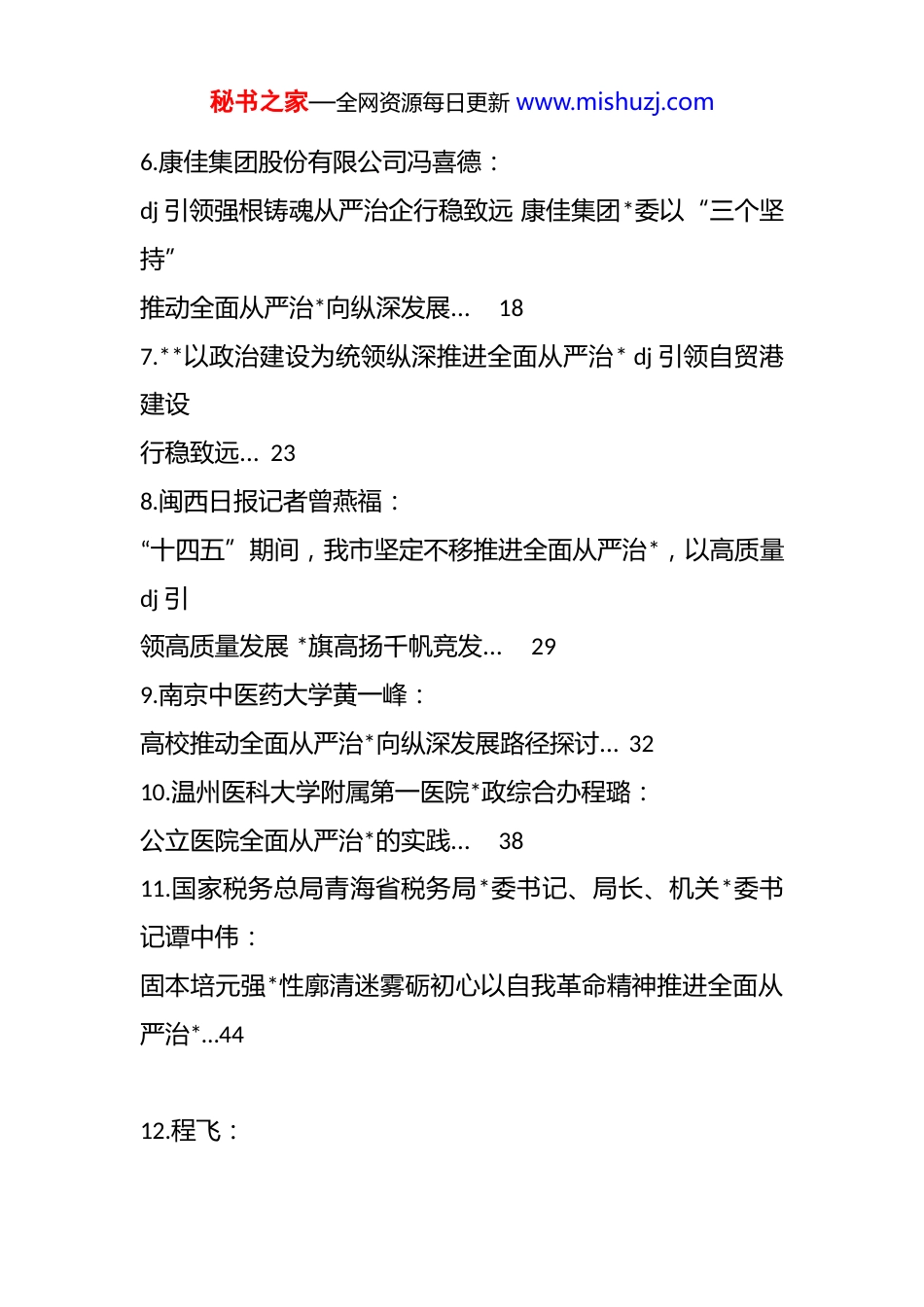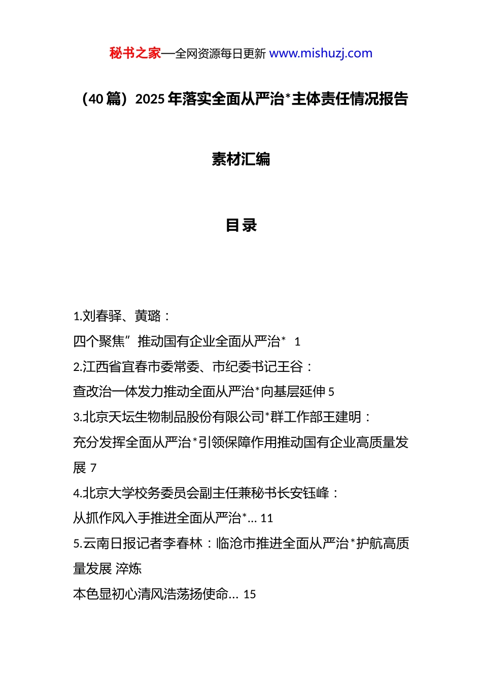 秘书之家—全网资源每日更新 www.mishuzj.com(40 篇)2025 年落实全面从严治*主体责任情况报告素材汇编目 录 1.刘春驿、黄璐: 四个聚焦”推动国有企业全面从严治* 1 2.江西省宜春市委常委、市纪委书记王谷: 查改治一体发力推动全面从严治*向基层延伸 5 3.北京天坛生物制品股份有限公司*群工作部王建明: 充分发挥全面从严治*引领保障作用推动国有企业高质量发展 7 4.北京大学校务委员会副主任兼秘书长安钰峰: 从抓作风入手推进全面从严治*… 11 5.云南日报记者李春林:临沧市推进全面从严治*护航高质量发展 淬炼 本色显初心清风浩荡扬使命… 15 秘书之家—全网资源每日更新 www.mishuzj.com6.康佳集团股份有限公司冯喜德: dj 引领强根铸魂从严治企行稳致远 康佳集团*委以“三个坚持” 推动全面从严治*向纵深发展…18 7.**以政治建设为统领纵深推进全面从严治* dj 引领自贸港建设 行稳致远… 23 8.闽西日报记者曾燕福: “十四五”期间,我市坚定不移推进全面从严治*,以高质量dj 引 领高质量发展 *旗高扬千帆竞发…29 9.南京中医药大学黄一峰: 高校推动全面从严治*向纵深发展路径探讨… 32 10.温州医科大学附属第一医院*政综合办程璐: 公立医院全面从严治*的实践…38 11.国家税务总局青海省税务局*委书记、局长、机关*委书记谭中伟: 固本培元强*性廓清迷雾砺初心以自我革命精神推进全面从严治*…44 12.程飞: 秘书之家—全网资源每日更新 www.mishuzj.com关于全面从严治*下国企纪检监察工作“三转”的思考… 4713.内蒙古送变电有限责任公司谢超: 国有企业落实全面从严治*要求的途径与措施… 53 14.南方电网贵州电网有限责任公司贵阳供电局袁文芳、田野: 基于健全全面从严治*体系的监督质效提升实践探索… 59 15.北京市**************思想研究中心: 坚持落实全面从严治*政治责任…62 16.大兴安岭地区*的建设研究会: 坚定不移推动全面从严治*政治责任落实落地 65 17.镇海“威远清风”品牌建设赋能全面从严治* 69 18.生态环境部南京环境科学研究所郭伟波: 聚焦“四力提升”深化全面从严治*主体责任落实 以生态环境部南 京环境科学研究所为例…73 19.中国纪检监察报记者王雅婧: 坚持严的基调、拧紧责任链条 强化全面从严治*政治责任…78 20.“十四五”期间烟草行业坚持以**************思想 为指导纵深推进全面从严治*述评… 81 21.国能长源荆州热电有限公司任佳佳: 秘书之家—全网资源每日更新 www.mishuzj.com全面从严治*背景下基层 dj 工作模式优化…85 22.徐天宝: 日照农发激活全面从严治*“红色引擎”… 90 23.中国纪检监察杂志社社长贾文儒: 深耕主责主业,讲好新时代全面从严治*故事… 93 24.承德市水务局多措并举推进全面从严治*… 100 25.山东科技大学刘鹏宇、张笑: 推动高校全面从严治*向纵深发展的实践进路… 105 26.河海大学体育系刘江: 新时代高校*委深化落实全面从严治*战略的思考… 108 27.陕西职业技术学院马克思主义学院申雯: 新时代高校全面从严治*“两个责任”贯通协同研究…112 28.山东大学马克思主义学院,刘凯: 新时代加强*的干部队伍建设的实践路径探析… 115 29.中海石油炼化有限责任公司采办共享中心吕云江: 新形势下如何做好炼化企业全面从严治*工作… 125 30.中国能源建设集团有限公司高绮: 学习贯彻全面从严治*思想构建企业*管体系…131 31.西藏自治区纵深推进全面从严治*工作综述… 137 32.马萌、高腾: 秘书之家—全网资源每日更新 www.mishuzj.com以“3313”模式促全面从严治*主体责任落地…140 33.广西马克思主义理论研究和建设工程自治区*校基地种项谭: 以全面从严治*新成效保障“十五五”战略擘画落地… 144 34.吉林省委常委、省纪委书记、省监委主任史文斌: 以全面从严治*新成效 为谱写中国式现代化吉林篇章提供坚强保障…146 35.杨智淋: 以全面从严治*新成效 为“十五五”保驾护航… 150 36.国家管网集团北京管道有限公司刘树云: 以“四个加强”推动全面从严治*向基层延伸… 152 37.吕桂东:...