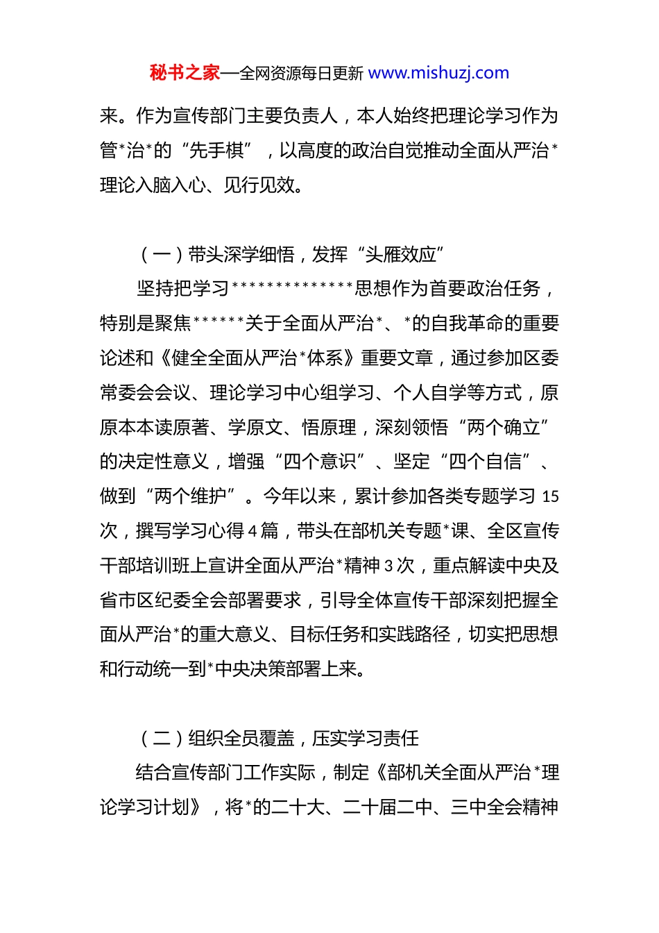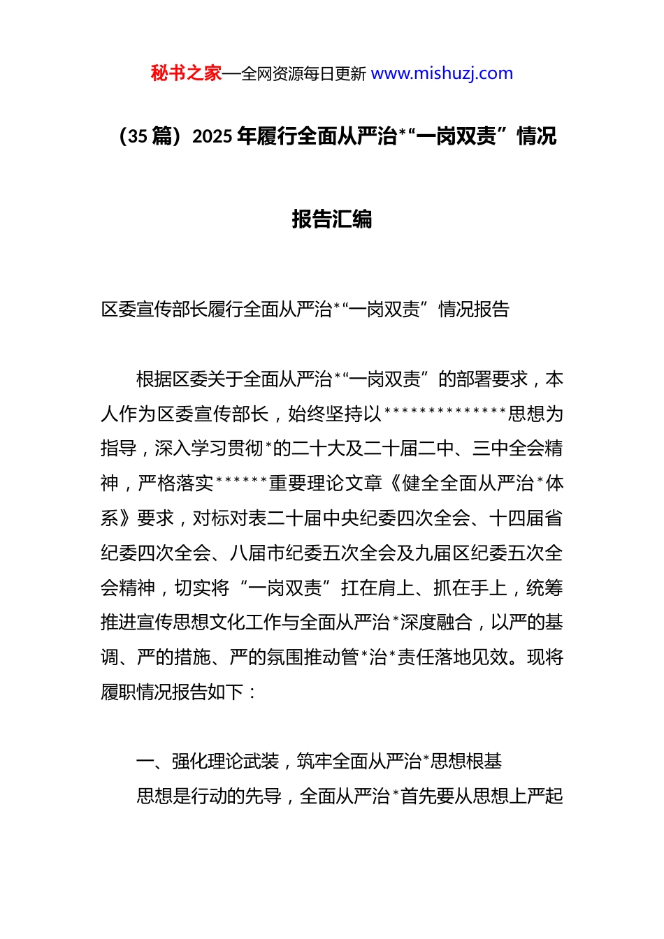 秘书之家—全网资源每日更新 www.mishuzj.com(35 篇)2025 年履行全面从严治*“一岗双责”情况报告汇编区委宣传部长履行全面从严治*“一岗双责”情况报告 根据区委关于全面从严治*“一岗双责”的部署要求,本人作为区委宣传部长,始终坚持以**************思想为指导,深入学习贯彻*的二十大及二十届二中、三中全会精神,严格落实******重要理论文章《健全全面从严治*体系》要求,对标对表二十届中央纪委四次全会、十四届省纪委四次全会、八届市纪委五次全会及九届区纪委五次全会精神,切实将“一岗双责”扛在肩上、抓在手上,统筹推进宣传思想文化工作与全面从严治*深度融合,以严的基调、严的措施、严的氛围推动管*治*责任落地见效。现将履职情况报告如下: 一、强化理论武装,筑牢全面从严治*思想根基 思想是行动的先导,全面从严治*首先要从思想上严起秘书之家—全网资源每日更新 www.mishuzj.com来。作为宣传部门主要负责人,本人始终把理论学习作为管*治*的“先手棋”,以高度的政治自觉推动全面从严治*理论入脑入心、见行见效。 (一)带头深学细悟,发挥“头雁效应” 坚持把学习**************思想作为首要政治任务,特别是聚焦******关于全面从严治*、*的自我革命的重要论述和《健全全面从严治*体系》重要文章,通过参加区委常委会会议、理论学习中心组学习、个人自学等方式,原原本本读原著、学原文、悟原理,深刻领悟“两个确立”的决定性意义,增强“四个意识”、坚定“四个自信”、做到“两个维护”。今年以来,累计参加各类专题学习 15次,撰写学习心得 4 篇,带头在部机关专题*课、全区宣传干部培训班上宣讲全面从严治*精神 3 次,重点解读中央及省市区纪委全会部署要求,引导全体宣传干部深刻把握全面从严治*的重大意义、目标任务和实践路径,切实把思想和行动统一到*中央决策部署上来。 (二)组织全员覆盖,压实学习责任 结合宣传部门工作实际,制定《部机关全面从严治*理论学习计划》,将*的二十大、二十届二中、三中全会精神秘书之家—全网资源每日更新 www.mishuzj.com及中央、省、市、区纪委全会精神纳入部机关每周学习例会、青年干部理论学习小组核心内容,创新采用“集中学习+研讨交流+线上测试+实地研学”的“四维学习法”,确保学习全覆盖、无死角。今年以来,组织部机关集中学习28 次,开展“全面从严治*大家谈”“廉洁从政我先行”等研讨活动 5 次,组织线上知识测试 4 次,参与率、合格率均达 100%;组织部机关干部赴区廉政教育基地开展实地研学1 次,通过沉浸式学习强化纪律意识,推动全面从严治*理论从“纸上”落到“心上”。 (三)融入宣传主业,扩大学习影响 立足宣传部门职责,将全面从严治*宣传纳入全区理论宣讲、新闻宣传、文化传播重点任务。组织区委宣讲团、“百姓名嘴”宣讲队深入机关、社区、企业、学校,开展全面从严治*专题宣讲 62 场,覆盖群众 2.3 万余人次;指导区融媒体中心开设“全面从严治*进行时”“清风满区”等专栏,制作系列短视频、h5、图解、漫画等新媒体产品 45件,在“两微一端”等平台推送相关稿件 210 余篇,其中《一图读懂九届区纪委五次全会精神》《廉洁自律承诺书“划重点”》等作品阅读量突破 15 万+,推动全面从严治*精神家喻户晓、深入人心,为全区管*治*工作营造浓厚舆秘书之家—全网资源每日更新 www.mishuzj.com论氛围。 二、扛起政治责任,构建全面从严治*责任体系 “一岗双责”的核心是责任落实,本人始终坚持把全面从严治*作为重要政治任务,以“清单化管理、项目化推进”构建“横向到边、纵向到底”的责任体系,确保管*治*各项任务不悬空、不落空。 (一)健全责任机制,明确任务清单 根据区委《关于落实全面从严治*主体责任的实施意见》,结合宣传部门实际,牵头制定《区委宣传部全面从严治*主体责任清单》,明确本人作为第一责任人、部领导班子成员作为分管责任人、各科室及下属单位负责人作为直接责任人的职责边界,将全面从严治*任务分解为理论学习、作风建设、监督执纪、廉洁教育、意识形态管理等 8 个方面 32 项具体任务,明确完成时限、责任科室及...