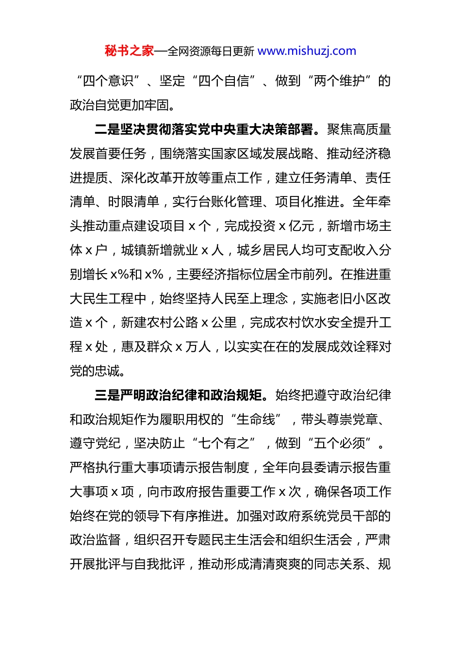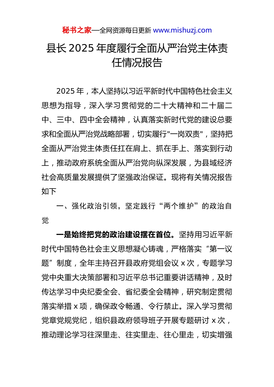 秘书之家—全网资源每日更新 www.mishuzj.com县长 2025 年度履行全面从严治党主体责任情况报告2025 年,本人坚持以习近平新时代中国特色社会主义思想为指导,深入学习贯彻党的二十大精神和二十届二中、三中、四中全会精神,认真落实新时代党的建设总要求和全面从严治党战略部署,切实履行"一岗双责",坚持把全面从严治党主体责任扛在肩上、抓在手上、落实到行动上,推动政府系统全面从严治党向纵深发展,为县域经济社会高质量发展提供了坚强政治保证。现将有关情况报告如下一、强化政治引领,坚定践行“两个维护”的政治自觉一是始终把党的政治建设摆在首位。坚持用习近平新时代中国特色社会主义思想凝心铸魂,严格落实“第一议题”制度,全年主持召开县政府党组会议 x 次,专题学习党中央重大决策部署和习近平总书记重要讲话精神,及时传达学习中央纪委全会、省纪委全会精神,研究制定贯彻落实举措 x 项,确保政令畅通、令行禁止。深入学习贯彻党章党规党纪,组织县政府领导班子开展专题研讨 x 次,推动理论学习往深里走、往实里走、往心里走,切实增强秘书之家—全网资源每日更新 www.mishuzj.com“四个意识”、坚定“四个自信”、做到“两个维护”的政治自觉更加牢固。二是坚决贯彻落实党中央重大决策部署。聚焦高质量发展首要任务,围绕落实国家区域发展战略、推动经济稳进提质、深化改革开放等重点工作,建立任务清单、责任清单、时限清单,实行台账化管理、项目化推进。全年牵头推动重点建设项目 x 个,完成投资 x 亿元,新增市场主体 x 户,城镇新增就业 x 人,城乡居民人均可支配收入分别增长 x%和 x%,主要经济指标位居全市前列。在推进重大民生工程中,始终坚持人民至上理念,实施老旧小区改造 x 个,新建农村公路 x 公里,完成农村饮水安全提升工程 x 处,惠及群众 x 万人,以实实在在的发展成效诠释对党的忠诚。三是严明政治纪律和政治规矩。始终把遵守政治纪律和政治规矩作为履职用权的“生命线”,带头尊崇党章、遵守党纪,坚决防止“七个有之”,做到“五个必须”。严格执行重大事项请示报告制度,全年向县委请示报告重大事项 x 项,向市政府报告重要工作 x 次,确保各项工作始终在党的领导下有序推进。加强对政府系统党员干部的政治监督,组织召开专题民主生活会和组织生活会,严肃开展批评与自我批评,推动形成清清爽爽的同志关系、规秘书之家—全网资源每日更新 www.mishuzj.com规矩矩的上下级关系、亲清统一的新型政商关系。二、压实主体责任,构建齐抓共管的工作格局(一)切实履行“第一责任人”职责。一是坚持亲自部署、亲自推动。年初主持召开全县政府系统廉政工作会议,全面部署年度党风廉政建设和反腐败工作,制定《县政府领导班子成员全面从严治党责任清单》,明确任务分工,细化工作举措。全年专题研究党风廉政工作 x 次,听取班子成员履行“一岗双责”情况汇报 x 次,对苗头性、倾向性问题及时提醒纠正。建立“月调度、季通报、年考核”工作机制,将全面从严治党纳入年度综合考评体系,权重提升至 x%,实现与业务工作同部署、同落实、同检查、同考核。二是坚持以上率下、示范带动。严格遵守中央八项规定及其实施细则精神,带头改进文风会风,全年主持召开会议同比减少 x%,文件印发数量下降 x%。严格执行公务接待、公务用车、办公用房等管理规定,坚决杜绝铺张浪费。带头深入基层调研,全年下基层走访调研 x天,覆盖所有乡镇和重点企业,协调解决企业发展难题 x个、群众急难愁盼问题 x 件,以实际行动践行“一线工作法”。在干部选拔任用中坚持正确导向,严格执行民主集中制,凡属“三重一大”事项均经集体研究决定,确保权力运行公开透明。三是坚持严管厚爱结合、激励约束并秘书之家—全网资源每日更新 www.mishuzj.com重。加强对政府系统干部的日常教育管理和监督,全年开展廉政谈话 x 人次,其中对新提拔干部任前廉政谈话 x 人次,对关键岗位干部提醒谈话 x 人次。注重正向激励,评选表彰勤廉典型 x 名,通报曝光违纪违法案例 x 起,形成鲜明导向。推动建立容错纠错机制,明确 x 类可容...