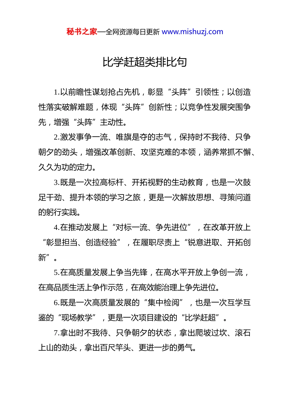 秘书之家—全网资源每日更新 www.mishuzj.com比学赶超类排比句 1.以前瞻性谋划抢占先机,彰显“头阵”引领性;以创造性落实破解难题,体现“头阵”创新性;以竞争性发展突围争先,增强“头阵”主动性。2.激发事争一流、唯旗是夺的志气,保持时不我待、只争朝夕的劲头,增强改革创新、攻坚克难的本领,涵养常抓不懈、久久为功的定力。3.既是一次拉高标杆、开拓视野的生动教育,也是一次鼓足干劲、提升本领的学习之旅,更是一次解放思想、寻策问道的躬行实践。4.在推动发展上“对标一流、争先进位”,在改革开放上“彰显担当、创造经验”,在履职尽责上“锐意进取、开拓创新”。5.在高质量发展上争当先锋,在高水平开放上争创一流,在高品质生活上争作示范,在高效能治理上争先进位。6.既是一次高质量发展的“集中检阅”,也是一次互学互鉴的“现场教学”,更是一次项目建设的“比学赶超”。7.拿出时不我待、只争朝夕的状态,拿出爬坡过坎、滚石上山的劲头,拿出百尺竿头、更进一步的勇气。秘书之家—全网资源每日更新 www.mishuzj.com8.激扬时不我待、舍我其谁的锐气,拿出迎难而上、敢打必胜的气魄,点燃勇争一流、追求极致的激情。9.在示范引领上走在前列,在创新发展上当好先锋,在产业培育上多作贡献,在创优环境上勇创一流。10.既要在回看走过的路中增添信心,也要在比较别人的路中拉高标杆,更要在远眺前行的路中创造机遇。11.只争第“一”拼抢上游,“马”上就办提升效率,担“当”作为勇挑重担,敢为人“先”争做先锋。12.对标先进“坐不住”的责任感,发展机遇“等不起”的紧迫感,追赶超越“慢不得”的危机感。13.这是一次开阔视野的学习之行,也是一次对照先进的醒脑之行,更是一次拉高标杆的奋进之行。14.百尺竿头更进一步的目标追求,抢抓机遇快人一拍的奋斗姿态,绵绵发力冰心一片的工作定力。15.增强争先进位的信心,提高争先进位的本领,汇聚争先进位的合力,夯实争先进位的作风。16.在“比”中找准差距,在“学”中补齐短板,在“赶”中干出实效,在“超”中实现目标。17.思想“破冰”的魄力,赶超“一流”的追求,加速“进位”的姿态,争当“闯将”的激情。秘书之家—全网资源每日更新 www.mishuzj.com18.铆足“比”的劲头,增强“学”的主动,激发“赶”的动力,强化“超”的追求。19.比精神状态、抓对标争先,比创新举措、破发展瓶颈,比担当作为、促任务落实。20.点燃“争”的激情,坚定“闯”的意志,保持“快”的状态,增强“创”的能力。21.增强“对标跨越”的雄心,树立“提质提速”的壮志,激扬“赶超进位”的豪情。22.一马当先的闯劲提速进位,一往无前的拼劲争先进位,一抓到底的狠劲赶超进位。23.在“比”中增动力,在“学”中强本领,在“赶”中争一流,在“超”中创品牌。24.激扬争先创先的精气神,砥砺苦干实干的硬作风,锤炼善作善成的真本领。25.在群浪簇拥中挺立潮头,在栉风沐雨中砥砺前行,在竞相角逐中赶超跨越。26.汲取赛龙舟的动力源泉,激发赛龙舟的昂扬斗志,凝聚赛龙舟的奋进力量。27.在拉高标杆中争先进位,在加压奋进中跨越赶超,在攻坚克难中开创新局。秘书之家—全网资源每日更新 www.mishuzj.com28.开拓创新的“排头兵”,探索实践的“先行军”,拼搏肯干的“攻坚队”。29.对标先进找差距,拓宽思路谋发展,全力以赴拼经济,奋力跑出加速度。30.以“学”拓视野,以“比”激活力,以“赶”破瓶颈,以“超”建新功。31.“永远不满足”的心态,“永远在路上”的状态,“永远创一流”的姿态。32.势在必行的战略举措,抢抓机遇的迫切需要,跨越赶超的关键赛道。33.向“优等生”取真经,跟“领跑者”找差距,向“弄潮儿”学本领。34.提振赶超的“冲劲”,提振创新的“闯劲”,提振争先的“干劲”。35.在目标上争先进位,在工作上比学赶超,在效率上全面提速。36.学赶先进中拼一流,紧盯目标中拼进度,协同发力中拼贡献。37.不争首位就是末位,不拿先进就是落后,不在上游就是下游。秘书之家—全网资源每日更新 www.mishuzj.com38.比武打擂的现场会,比赛冲锋的运动会,比学赶超的誓师会。39.率先领先的志气,攀高比强的勇气,团结奋进的士气。40.比的是环境,看的是作风,拼的是服务,讲的是效率。