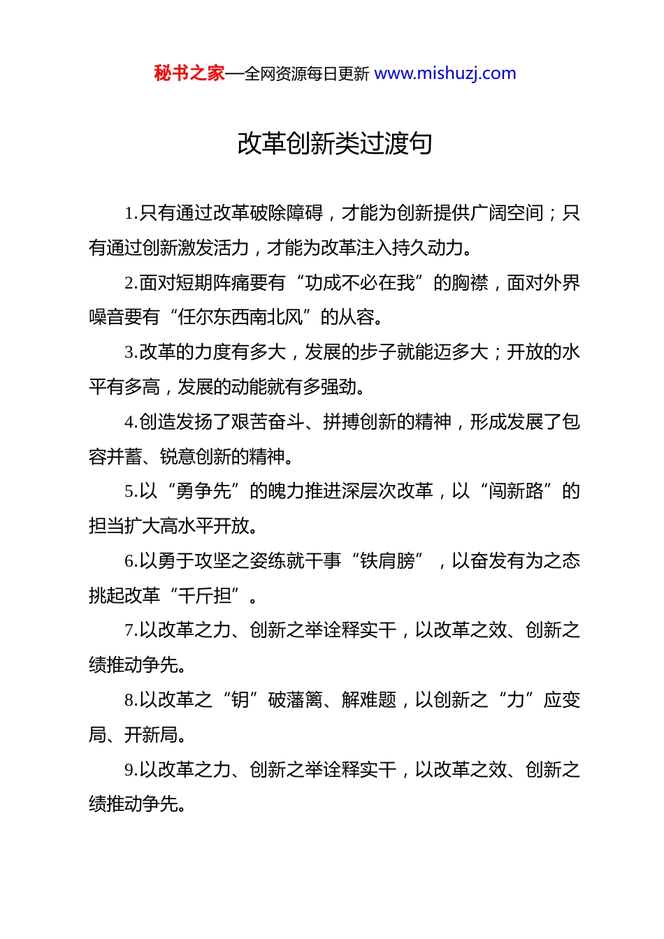 秘书之家—全网资源每日更新 www.mishuzj.com改革创新类过渡句 1.只有通过改革破除障碍,才能为创新提供广阔空间;只有通过创新激发活力,才能为改革注入持久动力。2.面对短期阵痛要有“功成不必在我”的胸襟,面对外界噪音要有“任尔东西南北风”的从容。3.改革的力度有多大,发展的步子就能迈多大;开放的水平有多高,发展的动能就有多强劲。4.创造发扬了艰苦奋斗、拼搏创新的精神,形成发展了包容并蓄、锐意创新的精神。5.以“勇争先”的魄力推进深层次改革,以“闯新路”的担当扩大高水平开放。6.以勇于攻坚之姿练就干事“铁肩膀”,以奋发有为之态挑起改革“千斤担”。7.以改革之力、创新之举诠释实干,以改革之效、创新之绩推动争先。8.以改革之“钥”破藩篱、解难题,以创新之“力”应变局、开新局。9.以改革之力、创新之举诠释实干,以改革之效、创新之绩推动争先。秘书之家—全网资源每日更新 www.mishuzj.com10.催生牵引性改革的“乘数效益”,撬动小切口改革的“杠杆效益”。11.服务大局勇扛使命、勇挑大梁,改革开放挺立潮头、引领潮流。12.以“奋进之姿”深化改革创新、以“挺膺之态”争取发展主动。13.用改革的思维谋思路、做决策,用创新的精神大胆闯、勇敢干。14.在攻坚克难中展现出强劲韧性,在改革创新中激发澎湃活力。15.创新链是产业链的“发动机”,产业链是创新链的“落脚点”。16.在深化改革上下好“先手棋”,在对外开放上落好“关键子”。17.让每一个创新构想落地生根,让每一份创业激情绽放光芒。18.创新是引领发展的第一动力,改革是破解难题的关键一招。19.用改革的办法破解发展难题,以创新的思路拓展发展空间。秘书之家—全网资源每日更新 www.mishuzj.com20.将地理坐标转化为开放优势,将区位潜力转化为发展动能。21.找到了高质量发展的原动力,赢得了高质量发展的主动权。22.让改革奋进的步伐更加有力,让担当实干的共识更加凝聚。23.用好改革这个“关键一招”,走好开放这个“必由之路”。24.以良好作风做好“改革题”,以竞进姿态答好“发展卷”。25.坚定勇闯新路的信心决心,鼓足改革攻坚的干劲拼劲。26.以系统思维统筹发展全局,用创新举措激活内生动力。27.用改革的手段来化解矛盾,用改革的办法来推动发展。28.在深化改革中培育新优势,在扩大开放中集聚新动能。29.在法治的轨道上推进改革,在改革的过程中完善法治。30.“破”是革故鼎新的勇气,“立”是建章立制的担当。31.蹚出改革创新最优路径,寻求主动求变的最佳方案。32.聚焦改革发展“大主题”,瞄准群众关切“小话题”。33.在深化改革中大胆地干,在扩大开放中坚决地干。34.在改革发展上一马当先,在战风斗雨中立马阵前。秘书之家—全网资源每日更新 www.mishuzj.com35.在传承中守正夯实根基,在创新中突破开创新局。36.围绕产业链部署创新链,围绕创新链布局产业链。37.以科技创新赋能为引擎,以重点领域改革为抓手。38.改革发展的“白名单”,创新探索的“安全区”。39.同题共答“创新之问”,同思共谋“发展之招”。40.以改革思维破解难题,以创新方法实现突围。41.干事创业的风雨兼程,改革发展的风生水起。42.勇于弯道取直走新路,善于创新发展谋跨越。43.抓住创新“不松劲”,瞄准“赛道”不偏航。44.跨过改革的“险滩”,抵达发展的“彼岸”。45.在困难面前敢碰硬,在改革创新上敢破界。46.有困难的不敢干,没先例的不肯干。47.发展中必有喧嚣,改革中必有阻力。48.守旧者困局难破,革新者气象万千。49.勇于先行抢先机,敢于先试闯新路。50.改革是发展之径,实干是发展之要。
