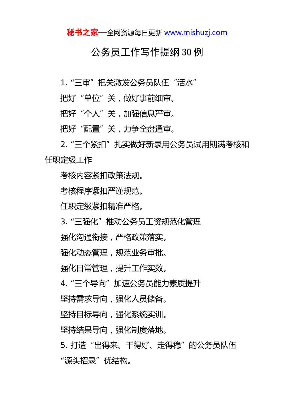 秘书之家—全网资源每日更新 www.mishuzj.com公务员工作写作提纲 30 例 1. “三审”把关激发公务员队伍“活水”把好“单位”关,做好事前细审。把好“个人”关,加强信息严审。把好“配置”关,力争全盘通审。2. “三个紧扣”扎实做好新录用公务员试用期满考核和任职定级工作考核内容紧扣政策法规。考核程序紧扣严谨规范。任职定级紧扣精准严格。3. “三强化”推动公务员工资规范化管理强化沟通衔接,严格政策落实。强化动态管理,规范业务审批。强化日常管理,提升工作实效。4. “三个导向”加速公务员能力素质提升坚持需求导向,强化人员储备。坚持目标导向,强化系统实训。坚持结果导向,强化制度落地。5. 打造“出得来、干得好、走得稳”的公务员队伍“源头招录”优结构。秘书之家—全网资源每日更新 www.mishuzj.com“内外兼修”练真功。“鼓励激励”促担当。6. “三道工序”规范公务员退休审批工作方案再优化。档案审核再严格。服务质量再提升。7. 巧用“望闻问切”做实新录用公务员转正定级望表及里,考出“干货”。闻声识人,评出“等次”。问准实情,画出“真像”。切准薄弱,补足“短板”。8. “三个务求”扎实推进青年公务员培训工作走深走实锚定政治站位务求“高”。锤炼业务本领务求“精”。拓展岗位锻炼务求“广”。9. “三聚焦” 助推公务员年度考核提质增效聚焦“精准考评”,注重科学性。聚焦“考核机制”,注重规范性。聚焦“以考促干”,注重实效性。10. 稳妥有序推进公务员录用考察工作加强领导,精心谋划部署。秘书之家—全网资源每日更新 www.mishuzj.com突出重点,扎实组织实施。严肃纪律,确保公平公正。11. “三个注重”强化公务员队伍政治建设注重政治标准,加强源头把关。注重政治武装,强化思想淬炼。注重政治尺度,严格考评导向。12. 三个强化助推新录用公务员成长成才强化教育培训,提升素质能力。强化实践锻炼,锻造过硬本领。强化严管厚爱,激励担当作为。13. 三个“精准” 落细公务员工资管理精准沟通,严格政策落实。精准部署,规范业务审批。精准联动,高效动态管理。14. “三步走”扎实做好公务员录用考察工作统筹部署,有序推进。规范流程,严格实施。严肃纪律,压实责任。15. “四个坚持”激励公务员建功立业坚持“五湖四海引才”,让公务员“来干事”。坚持“千方百计育才”,让公务员“会干事”。秘书之家—全网资源每日更新 www.mishuzj.com坚持“多措并举管才”,让公务员“能干事”。坚持“考核引领励才”,让公务员“想干事”。16. “一定三选”选优配强公务员队伍选人计划优先定,强化未雨绸缪。公开招考精准选,优化源头活水。优秀人才竞争选,督促比追赶超。用好存量合理选,激活一池春水。17. “持续发力”加强公务员队伍建设在多渠道招引方面持续发力,积蓄“源头活水”。在多渠道培养方面持续发力,铸就“强健筋骨”。在多渠道激励方面持续发力,激发“内生动力”。18. “三字诀”助力新录用公务员工资审批“严”字当头,审准个人档案。“快”字从先,优化审批程序。“实”字打底,落实待遇保障。19. “三个突出”扎实推进公务员职级工作突出“基层基础”,夯实干部信息。突出“严格严谨”,推动程序规范。突出“实干实绩”,树牢择优导向。20. “三个坚持”抓好公务员政务诚信管理坚持政务诚信教育“应讲必讲”。秘书之家—全网资源每日更新 www.mishuzj.com坚持社会信用记录“凡进必查”。坚持评优信用查询“人人过关”。21. “123”工作法推动公务员招录提质增效突出中心,始终坚持“一个”政治原则。用好编制,精准聚焦“二个”科学导向。主动谋划,着力强化“三个”责任意识。22. “三个注重”打造高素质专业化公务员队伍注重发展需求,抓源头,拓渠道,持续推动公务员队伍结构优化。注重教育培训,练内功、强素质,全面提升公务员队伍治理能力。注重严管厚爱,增活力,优选用,不断激励公务员队伍担当作为。23. 多方入手打造新入职公务员成长快车道政治培训增定力。实践历练强能力。严管厚爱添动力。24. “三聚焦三突出”做实做细平时考核聚焦指标“精细化”,突出考核内容全面性。聚...