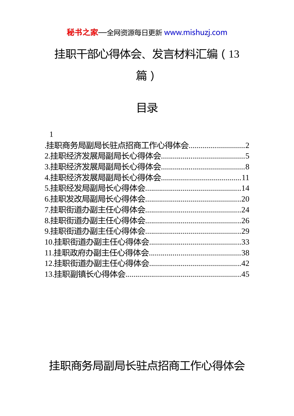 秘书之家—全网资源每日更新 www.mishuzj.com挂职干部心得体会、发言材料汇编(13篇)目录1.挂职商务局副局长驻点招商工作心得体会............................22.挂职经济发展局副局长心得体会..........................................53.挂职经济发展局副局长心得体会..........................................84.挂职经济发展局副局长心得体会........................................115.挂职经发局副局长心得体会................................................146.挂职发改局副局长心得体会................................................207.挂职街道办副主任心得体会................................................248.挂职街道办副主任心得体会................................................269.挂职街道办副主任心得体会................................................2910.挂职街道办副主任心得体会..............................................3311.挂职政府办副主任心得体会..............................................3812.挂职街道办副主任心得体会..............................................4213.挂职副镇长心得体会..........................................................45挂职商务局副局长驻点招商工作心得体会秘书之家—全网资源每日更新 www.mishuzj.com挂职以来,我随 xx 驻外招商分局开展驻点招商,这是一次充满挑战与收获的历练,不仅让我跳出了“等项目、靠政策”的传统思维,更让我在直面市场、深耕产业过程中,对招商工作本质有了更深刻的认知,也在企业拜促、资源整合、产业研判等方面有了新的思考。一、“圈层化”渗透:从“单点接触”到“生态融入”在深圳开展工作时,我们发现直接上门拜访企业往往会被拒之门外,企业更信任“圈内人”的推荐,于是开始转变思路,从直接找企业转向融入产业圈层,通过拜访驻点区域行业协会、参与企业沙龙和闭门研讨会等,成为当地产业园区的常客,逐步从“外来者”转变为“圈内人”此外,密切联合本地商会,联系驻点区域异地商会,借助商会“熟人网络”接触在当地发展的乡贤企业家,开展“以商招商”,邀请在驻点区域发展的本地企业家分享经验,借助他们的口碑传播,吸引更多企业关注本地投资机会。在得知深圳将举办电池行业产业论坛后,我们提前与主办方沟通,争取到提前与 x 位头部企业负责人一对一交流时间,宣传推广 xx 新能源产业布局,这种提前准备的资源储备方式,让我们避免了异地无方向、无人脉的被动情况。二、“精准化”对接:从“泛泛而谈”到“解决问题”通过前期拜访工作,在获取企业投资意向或线索后,我们避免了“拉横幅、讲政策”的传统推介模式,而是以“解决企业实际问题”为核心开展对接。每次与企业洽谈前,都会提前通过行业报告、企业官网、新闻报道等渠道深入了解企业的发展痛点:是土地需求、供应链配套,还是人才短缺、市场拓展难题,并针对这些痛点准备相应的对接措施,这种带着解决方案谈合作的方式,让企业感受到我们的专业度和诚意,甚至原本投资意向不太高的企业秘书之家—全网资源每日更新 www.mishuzj.com最终主动提出了想要实地考察。此外,在邀请企业负责人到 xx 实地考察时,不仅安排参观厂房和园区,还组织企业与本地上下游供应商、金融机构等对接,让企业直观看到产业链配套能力,对于不便实地考察的企业,我们通过宣传片及招商手册,让企业足不出户就能了解本地情况。三、“长期化”跟进:从“签约为王”到“陪伴成长”驻点招商过程中,很多项目并非一次对接就能成功,需要长期跟进、持续服务。我们建立了项目跟进台账,将企业分为“签约项目”“意向项目”“储备项目”三类,针对不同类型企业制定差异化跟进策略。对于“签约项目”,每周更新项目进展,为进一步解决项目建设中的痛点、堵点,保障项目快速推进,推行“标准地”改革,在土地挂牌前完成各项准备工作,由原来的项目等土地变成土地等项目,大幅缩短项目落地时间、降低制度性交易成本。实施“容缺办理”机制,提升审批部门办理效能,减少项目单位的办事成本,...