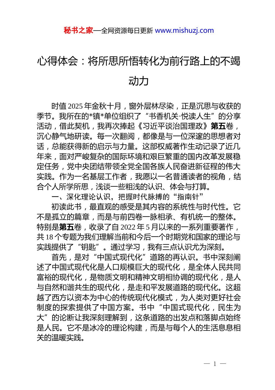 秘书之家—全网资源每日更新 www.mishuzj.com心得体会:将所思所悟转化为前行路上的不竭动力时值 2025 年金秋十月,窗外层林尽染,正是沉思与收获的季节。我所在的*镇*单位组织了“书香机关·悦读人生”的分享活动,借此契机,我再次捧起《习近平谈治国理政》第五卷,沉心静气地研读。每一次翻阅,都像是与一位深邃的思想者对话,总能获得新的启示与力量。这部权威著作生动记录了近几年来,面对严峻复杂的国际环境和艰巨繁重的国内改革发展稳定任务,党中央团结带领全党全国各族人民奋进新征程的伟大实践。作为一名基层工作者,我愿以一名普通读者的视角,结合个人所学所思,浅谈一些粗浅的认识、体会与打算。一、深化理论认识,把握时代脉搏的“指南针”初读此书,最直观的感受是其内容的系统性与时代性。它不是孤立的篇章,而是与前四卷一脉相承、有机统一的整体。特别是第五卷,收录了自 2022 年 5 月以来的一系列重要著作,共 18 个专题为我们理解当前和今后一个时期党和国家的理论与实践提供了“钥匙”。通过学习,我有三点认识尤为深刻。首先,是对“中国式现代化”道路的再认识。书中深刻阐述了中国式现代化是人口规模巨大的现代化,是全体人民共同富裕的现代化,是物质文明和精神文明相协调的现代化,是人与自然和谐共生的现代化,是走和平发展道路的现代化。这超越了西方以资本为中心的传统现代化模式,为人类对更好社会制度的探索提供了中国方案。书中“中国式现代化,民生为大”的论断让我深刻理解到,这条道路的出发点和落脚点始终是人民。它不是冰冷的理论构建,而是与每个人的生活息息相关的温暖实践。— 1 —秘书之家—全网资源每日更新 www.mishuzj.com其次,是对“以人民为中心”发展思想的再认识。这一思想如一条红线,贯穿全书始终。从“人民对美好生活的向往就是我们的奋斗目标”的庄严承诺,到具体政策的落地实施,无不彰显着深厚的为民情怀。这让我认识到,治国理政的根本逻辑,就是让人民过上好日子。这并非一句口号,而是体现在一系列扎实的民生保障举措中。国家财政支出持续向民生领域倾斜构建起世界上规模最大的社会保障体系在教育、医疗、住房等领域持续发力。近一亿农村贫困人口实现脱贫的历史性成就更是这一思想的伟大实践。这些事实让我明白,无论身处何种岗位,都必须将人民的利益放在最高位置,用心用情去解决群众关心的实际问题。最后,是对“高质量发展”与“文化自信”的再认识。高质量发展是全面建设社会主义现代化国家的首要任务。书中关于贯彻新发展理念、构建新发展格局、推动高质量发展的论述,特别是创造性地提出新质生产力等概念,为经济社会发展指明了方向。这意味着发展的核心逻辑已从追求速度和规模,转向更加注重质量和效益的提升。与此同时,书中强调在新的起点上继续推动文化繁荣、建设文化强国、建设中华民族现代文明的新时代文化使命,让我深刻感悟到文化是一个国家、一个民族的灵魂。坚定文化自信,不仅是传承历史,更是开创未来的精神动力。二、结合身边体会,感受思想伟力的“温度”理论的光辉,最终要照进现实。学习《习近平谈治国理政》第五卷,我不仅在思想上受到洗礼,更在情感上产生了强烈的共鸣。因为书中所擘画的宏伟蓝图,正以肉眼可见的速度,悄然改变着我们身边的世界,让我真切地感受到了思想的“温度”。我体会到的是民生改善的“获得感”。书中的民生篇章,并非遥不可及的宏大叙事,而是与我及家人、朋友生活紧密相— 2 —秘书之家—全网资源每日更新 www.mishuzj.com连的日常。例如,书中强调的就业优先政策,在 2025 年政府工作报告中具体化为“城镇新增就业 1200 万人以上”的目标这背后是无数个家庭的安稳与希望。医疗方面,持续加大的医保谈判力度,以及 2025 年新药不断被纳入医保目录,让身边患病的朋友减轻了经济负担;基本医疗保险参保率超过 95%,人均预期寿命提升至 79 岁,这些数据是我能从社区卫生服务中心的宣传栏和邻里交谈中直接感受到的变化。教育方面,学前教育毛入园率超过 90%,意味着更多的孩子能在家门口享受到普惠的学前教育。住房方面,政府强调“房住不炒”...
