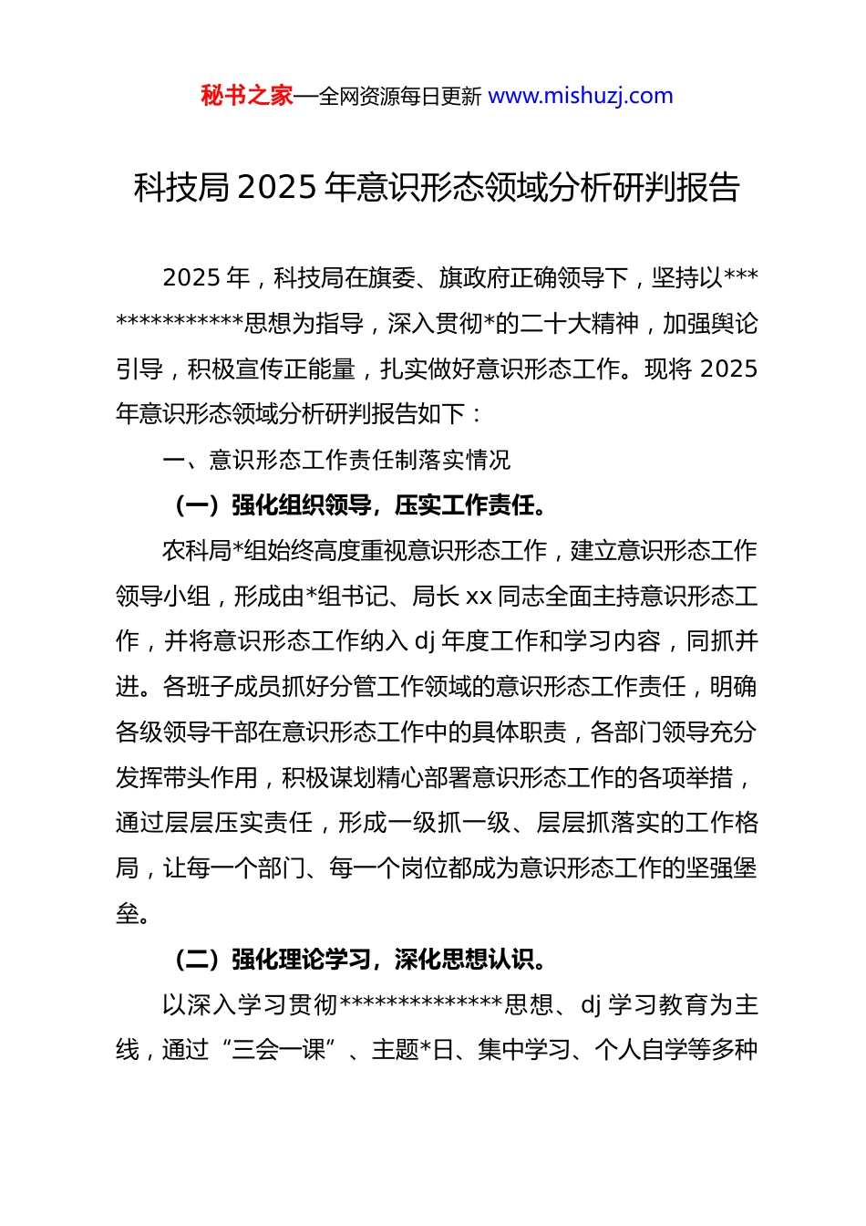 秘书之家—全网资源每日更新 www.mishuzj.com科技局 2025 年意识形态领域分析研判报告2025 年,科技局在旗委、旗政府正确领导下,坚持以**************思想为指导,深入贯彻*的二十大精神,加强舆论引导,积极宣传正能量,扎实做好意识形态工作。现将 2025年意识形态领域分析研判报告如下:一、意识形态工作责任制落实情况(一)强化组织领导,压实工作责任。农科局*组始终高度重视意识形态工作,建立意识形态工作领导小组,形成由*组书记、局长 xx 同志全面主持意识形态工作,并将意识形态工作纳入 dj 年度工作和学习内容,同抓并进。各班子成员抓好分管工作领域的意识形态工作责任,明确各级领导干部在意识形态工作中的具体职责,各部门领导充分发挥带头作用,积极谋划精心部署意识形态工作的各项举措,通过层层压实责任,形成一级抓一级、层层抓落实的工作格局,让每一个部门、每一个岗位都成为意识形态工作的坚强堡垒。(二)强化理论学习,深化思想认识。以深入学习贯彻**************思想、dj 学习教育为主线,通过“三会一课”、主题*日、集中学习、个人自学等多种秘书之家—全网资源每日更新 www.mishuzj.com形式,组织*员干部认真学习*的理论方针政策,不断提高*员干部的政治理论水平和思想认识。一是进一步落实“三会一课”制度,建立集中学习和个人自学的政治理论学习制度,开展好专题民主生活会和专题讨论,不断提高*员政治素质和理论水平,打牢意识形态政治基石,从严从实着力完善*员教育管理的长效机制。二是以“学习强国”app 为抓手,扎实推进“学习强国”平台的管理、学习工作,对学习不积极的*员及时进行督促,学员日人均积分 45 分以上。三是以*支部主题*日为契机,扎实开展 dj 学习教育,注重整体政治思想觉悟和意识形态的提高,把意识形态工作纳入学习内容,切实抓好全体*员思想教育和理论学习工作。从意识理念推进学习教育常态化制度化,强化*员干部意识形态思想建设。(三)注重舆论引导,营造良好氛围。充分利用“xx 左旗政务网”、“xx 左旗正能量”、“魅力 xx 左旗”等自媒体网站、微信公众号等宣传阵地,及时宣传*的路线方针政策及上级*委的决策部署和本单位的工作动态,积极传播正能量。加强对网络舆情的监测和应对,及时发现和处理负面舆情,维护网络意识形态安全。2025 年,共发布各秘书之家—全网资源每日更新 www.mishuzj.com类信息 125 条,处理网络舆情 0 起。(四)加强阵地建设,夯实工作基础。加强对本单位各类阵地的管理,明确专人负责,确保阵地安全。严格落实信息发布审核制度,规范信息发布流程,确保信息发布准确、及时、有效加强对*员干部的教育管理,引导*员干部自觉抵制不良思想和言论,坚决维护意识形态安全。同时,积极探索创新意识形态工作方式方法,结合本单位实际,开展具有特色的意识形态工作活动,提高意识形态工作的针对性和实效性。二、存在的主要问题和风险隐患及原因分析通过召开意识形态工作分析研判会议,对意识形态工作中存在的风险进行了分析研判,并对风险点进行逐一排查,主要存在以下几点问题和风险隐患:1.对意识形态工作的重要性认识不足。个别*员干部对意识形态工作的极端重要性认识不够深刻,存在重业务工作、轻意识形态工作的现象。2.意识形态工作方式方法不够创新。在开展意识形态工作中,存在方式方法单一、缺乏创新的问题,不能很好地适应新形势下意识形态工作的要求。3.意识形态工作宣传队伍建设存在短板,有待加强。意识秘书之家—全网资源每日更新 www.mishuzj.com形态工作队伍的整体素质和业务能力还有待提高。4.意识形态工作缺乏监督机制。目前对意识形态宣传队伍的监督机制不够完善,导致工作中存在不规范的现象。三、自查整改情况1、学习理论知识,通过系统学习马克思主义理论、哲学、社会学等相关知识,加深对意识形态的理论认识,包括其内涵、形成机制、作用等方面的内容。2、强化创新意识,全面推进意识形态领域工作。进一步解放思想,转变观念,牢固树立创新意识,把创新作为工作的灵魂,突破传统思维模式,创新思想、创新观念、创新内容、创新方法,本着“有所为,...