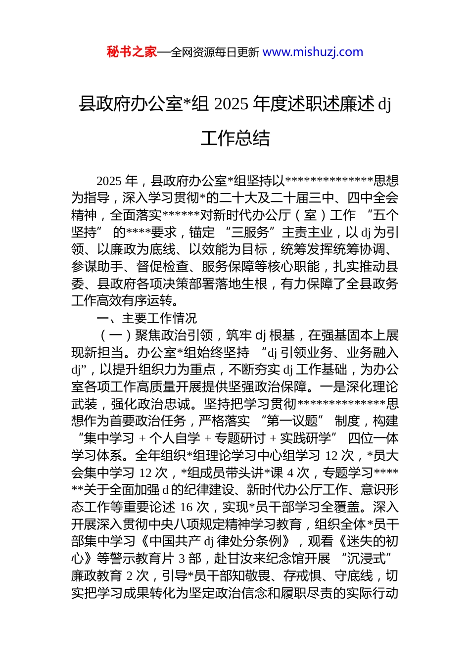 秘书之家—全网资源每日更新 www.mishuzj.com县政府办公室*组 2025 年度述职述廉述 dj工作总结2025 年,县政府办公室*组坚持以**************思想为指导,深入学习贯彻*的二十大及二十届三中、四中全会精神,全面落实******对新时代办公厅(室)工作 “五个坚持” 的****要求,锚定 “三服务”主责主业,以 dj 为引领、以廉政为底线、以效能为目标,统筹发挥统筹协调、参谋助手、督促检查、服务保障等核心职能,扎实推动县委、县政府各项决策部署落地生根,有力保障了全县政务工作高效有序运转。一、主要工作情况(一)聚焦政治引领,筑牢 dj 根基,在强基固本上展现新担当。办公室*组始终坚持 “dj 引领业务、业务融入dj”,以提升组织力为重点,不断夯实 dj 工作基础,为办公室各项工作高质量开展提供坚强政治保障。一是深化理论武装,强化政治忠诚。坚持把学习贯彻**************思想作为首要政治任务,严格落实 “第一议题” 制度,构建“集中学习 + 个人自学 + 专题研讨 + 实践研学” 四位一体学习体系。全年组织*组理论学习中心组学习 12 次,*员大会集中学习 12 次,*组成员带头讲*课 4 次,专题学习******关于全面加强 d 的纪律建设、新时代办公厅工作、意识形态工作等重要论述 16 次,实现*员干部学习全覆盖。深入开展深入贯彻中央八项规定精神学习教育,组织全体*员干部集中学习《中国共产 dj 律处分条例》,观看《迷失的初心》等警示教育片 3 部,赴甘汝来纪念馆开展 “沉浸式”廉政教育 2 次,引导*员干部知敬畏、存戒惧、守底线,切实把学习成果转化为坚定政治信念和履职尽责的实际行动秘书之家—全网资源每日更新 www.mishuzj.com二是压实 dj 责任,规范组织建设。严格执行《中国共产**组工作条例》,完善*组议事规则和决策程序,全年召开*组会议 16 次,研究部署 dj、*风廉政建设、意识形态等重点工作 32 项,确保各项工作方向不偏、力度不减。规范*支部标准化建设,严格落实 “三会一课”、组织生活会、民主评议*员等制度,开展主题*日活动 12 次,其中结合“我为群众办实事” 实践活动,组织*员干部深入基层开展政策宣传、调研走访等活动 8 次,进一步增强*组织的凝聚力和战斗力。建立*组书记负总责、班子成员 “一岗双责”、*支部具体落实的 dj 工作责任体系,层层签订 dj 工作责任书,将 dj 工作与业务工作同部署、同落实、同考核,形成 “一级抓一级、层层抓落实” 的工作格局。三是狠抓意识形态,守牢思想阵地。深刻认识意识形态工作的极端重要性,将其纳入*组重要议事日程,全年组织意识形态专题学习 2 次,研究部署意识形态工作 2 次,开展意识形态领域风险隐患排查 4 次,及时化解苗头性、倾向性问题。严格落实网络意识形态工作责任制,加强政府网站、微信公众号等政务新媒体管理,全年发布权威信息 350 条,无不良信息传播情况。加强干部思想动态分析,通过个别谈话、座谈交流等方式,全面掌握*员干部思想状况,针对性开展思想引导工作,确保全办上下思想统一、步调一致。四是建强人才队伍,激发干事活力。坚持把人才队伍建设作为基础性工程,实施 “人才强办” 战略,着力打造一支政治过硬、业务精湛、作风优良的复合型干部队伍。优化干部培养机制采取 “轮岗交流、跟班学习、专题培训” 等方式,安排 12名干部进行跨科室轮岗,组织 30 余人次参加省、市政务业务培训,提升干部 “办文、办会、办事” 综合能力。加大干部选拔任用和输送力度,全年为全县培养输送优秀干部 8名,提拔重用 2 名,通过公开招录、人才引进、选拔调用等方式补充工作人员 4 名,有效缓解了 “人才缺失、后继无人” 的问题。建立健全激励机制,制定《政务信息及调秘书之家—全网资源每日更新 www.mishuzj.com研工作目标管理考核办法》,明确工作任务、考核标准和奖惩措施,充分调动干部职工干事创业的积极性和主动性。(二)聚焦主责主业,提升服务效能,在担当作为上实现新突破。办公室*组始终围绕全县中心工作,精准定位办公室职能,以 “精益求精、务实高效” 的工作作风,扎实...