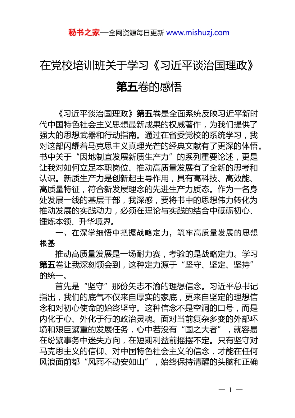 秘书之家—全网资源每日更新 www.mishuzj.com在党校培训班关于学习《习近平谈治国理政》第五卷的感悟《习近平谈治国理政》第五卷是全面系统反映习近平新时代中国特色社会主义思想最新成果的权威著作,为我们提供了强大的思想武器和行动指南。通过在省委党校的系统学习,我对这部闪耀着马克思主义真理光芒的经典文献有了更深的体悟。书中关于“因地制宜发展新质生产力”的系列重要论述,更是让我对如何立足本职岗位、推动高质量发展有了全新的思考和认识。新质生产力是创新起主导作用,具有高科技、高效能、高质量特征,符合新发展理念的先进生产力质态。作为一名身处发展一线的基层干部,我深感,要将书中的思想伟力转化为推动发展的实践动力,必须在理论与实践的结合中砥砺初心、锤炼本领、升华境界。一、在深学细悟中把握战略定力,筑牢高质量发展的思想根基推动高质量发展是一场耐力赛,考验的是战略定力。学习第五卷让我深刻领会到,这种定力源于“坚守、坚定、坚持”的统一。首先是“坚守”那份矢志不渝的理想信念。习近平总书记指出,我们的底气不仅来自厚实的家底,更来自坚定的理想信念和对初心使命的始终坚守。这种信念不是空洞的口号,而是内化于心、外化于行的政治灵魂。面对当前复杂多变的外部环境和艰巨繁重的发展任务,心中若没有“国之大者”,就容易在纷繁事务中迷失方向,在短期利益前摇摆不定。只有坚守对马克思主义的信仰、对中国特色社会主义的信念,才能在任何风浪面前都“风雨不动安如山”,始终保持清醒的头脑和正确— 1 —秘书之家—全网资源每日更新 www.mishuzj.com的方向。这正是我作为一名党员干部必须时刻自省、终身修习的根本课题。其次是“坚定”那份一脉相承的使命传承。习近平总书记强调要发扬“功成不必在我、功成必定有我”的精神,坚持一张蓝图绘到底。这使我联想到自己所在的区。自撤县设区以来,历届班子都将铜和铜基新材料产业作为首位产业和产业地标,十年如一日,一任接着一任干,最终使其成长为全省乃至全国重要的新材料产业基地之一。这正是对“一张蓝图绘到底”的生动实践。当前,发展新质生产力已成为国家战略,2025 年的政府工作报告也将其列为首要任务之一。在这一背景下,我更加深刻地理解到,推动发展不能急功近利,必须正确处理“显绩”与“潜绩”的关系。既要追求看得见的成果,更要甘做铺垫性的工作,为长远发展夯实基础,在求真务务实中追求真正可持续的高质量发展。最后是“坚持”那份久久为功的奋斗精神。习近平总书记指出:“一旦确定目标,就咬定青山不放松,接续奋斗、艰苦奋斗、不懈奋斗”。小镇就是一个很好的例子。一位农民企业家,和多届地方政府一起,用二十余年的光阴,将一片废弃的矿山打造成了网红文旅景点。这种“一辈子只做一件事”的执着,正是“坚持”的最好诠释。发展新质生产力,不可能一蹴而就,尤其是在攻克“卡脖子”技术难题、培育未来产业等方面,更需要这种历史耐心和战略定力。在当前全国上下大力发展战略性新兴产业和未来产业,力争到 2025 年战略性新兴产业增加值占 GDP 比重达到 17%的目标下,我认识到,必须在前行路上不断积蓄“新”的动能,厚植“质”的土壤,才能最终写好高质量发展这篇大文章。二、在知行合一中强化职责使命,争做新质生产力的培育先锋发展新质生产力,关键在人,关键在干部的担当作为。第— 2 —秘书之家—全网资源每日更新 www.mishuzj.com五卷中的论述让我明白,培育新质生产力,基层干部必须具备“敢想、敢干、敢当”的魄力。“敢想”是点燃创新驱动的火种。习近平总书记要求领导干部加快转变不适应创新发展要求的思想观念和思维方式,成为创新的引领者。新质生产力的核心就在于“新”,在于“创新”。没有“无中生有”的想象力,就很难有“从 0 到 1”的原创性突破。过去,我区的山因资源枯竭而面临严峻生态挑战,正是因为创新性地提出并实施“生态修复+”模式,才成功实现了从“生态疮疤”到“绿水青山”的华丽转身。作为一名干部,我深切体会到,必须带头打破思维定式和路径依赖,不仅要鼓励创新,更要建立包容“异想天开”的容错机制,为那些看似...