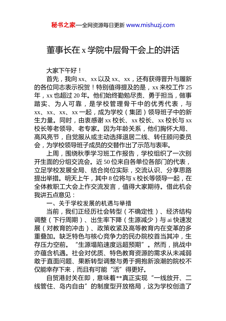 秘书之家—全网资源每日更新 www.mishuzj.com董事长在 x 学院中层骨干会上的讲话大家下午好!首先,我向 xx、xx 以及 xx、xx,还有获得晋升与履新的各位同志表示祝贺!特别值得提及的是,xx 来校工作 25年,xx 也超过 20 年。他们始终勤勉尽责、勇于担当,做事踏实、为人可靠,是学校管理骨干中的优秀代表,与xx、xx、xx、xx 一起,成为学校(集团)领导班子中的新生力量。同时,由衷感谢 xx 校长、xx 校长、xx 校长与 xx校长等老领导、老专家。因为年龄关系,他们胸怀大局、高风亮节,自觉服从或主动选择退居二线、转任顾问委员会,为学校领导班子成员的交替作出了示范与表率。上周,围绕秋季学习班工作报告,学校组织了一次别开生面的分组交流会。近 50 位来自各单位各部门的代表,立足学校发展全局、结合岗位实际,交流认识、分享思路提出举措。明天上午,其中 8 位将与 x 校长等领导一起,在全体教职工大会上作交流发言,值得大家期待。借此机会我讲五点意见:一、关于学校发展的机遇与举措当前,我们正经历社会转型(不确定性)、经济结构调整(下行周期)、出生率下降(生源减少)与 ai 快速发展(对教育的冲击)、政策收紧及高等教育内在变革的多重叠加。缺乏特色与核心竞争力的民办院校首当其冲,生存压力空前。“生源塌陷速度远超预期”。然而,挑战中亦蕴含机遇。社会对优质、特色教育资源的需求从未减弱敢于直面问题、果断转型调整与勇于拥抱新浪潮的院校不仅能幸存下来,而且有可能“活”得更好。自贸港封关在即,意味着**真正实现“一线放开、二线管住、岛内自由”的制度型开放格局,这为学校创造了秘书之家—全网资源每日更新 www.mishuzj.com前所未有的战略机遇:人才汇聚的“强磁场”:自贸港高端、紧缺人才的加速集聚,为学校吸引国际化师资、优化生源结构提供了得天独厚的条件产教融合的“加速器”:随着大量新兴产业和标杆性项目落地**,有利于高校人才培养与前沿产业需求对接,也为毕业生就业创业开辟了直达通道。社会服务的“新高地”:作为本地高校,学校在封关运作相关的政策研究、法律咨询、跨境电商、旅游管理、金融创新等领域,其人才库作用愈发凸显,服务社会能力与社会影响力将同步跃升。除开自贸港建设这一历史性机遇外,历经联办改制二十六年的快速发展,学校有较厚实的基础、有相应的品牌号召力与一定的社会影响力,这也是我们面对挑战的优势与底气。人才队伍的优化与内部管理的精细化:开学以来,相关职能部门与各二级单位,根据学校的工作部署,做了大量且卓有成效的工作,这令人欣喜、值得肯定,但还仅仅是开始,希望大家不畏艰难、创新开拓、砥砺前行。教育的国际化与办学多元化。国际化:教育领域扩大开放,引进意大利米兰理工大学来琼合作办学,省教育厅已同意列入**省“十五五”教育发展规划。该项目落地,对海经影响极为深远。多元化:大学向下沉:设置高职院附属艺校向上走:引进中芭等高端资源实施联合办学…要成就一项事业,要保持事业经久不衰,天时、地利、人和都非常重要。“天时”不尽如意,但我们有“地利”我们更要通过“人和”来弥补“天时”的遗憾与欠缺。通过体制机制优势的充分发挥,对战略方向的适时调整、对内部治理的适度强化、对市场的快速反应、对变革的快速响应…以形成强大的内部合力,突破瓶颈、补齐短板、穿越周期。秘书之家—全网资源每日更新 www.mishuzj.com二、关于学校顾问委员会成立为适应不断变化的新形势,推动学校新时期健康稳定与高质量发展,董事会研究决定:聘请一批工作年限长、学术地位高、管理经验丰富,且在学校发展过程中做出过突出贡献的老领导、老专家组成学校顾问委员会,在学校战略规划、内部管理、学科(专业)建设、人才培养等方面发挥应有作用,为学校改革与稳定、创新与发展作出积极贡献。担任顾问的老领导、老专家都是学校乃至社会的宝贵财富,成立顾问委员会不仅在于让这些老领导、老专家“发挥余热”,更在于实现制度化的“经验传承”与“智慧赋能”。三、关于校企合作与后勤投资新的补充规定开学初的讲话中,我说过这样一段话:“政策在变、市场在变、社会...