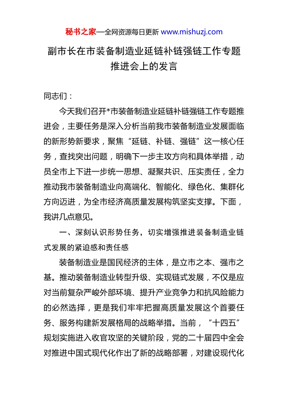 秘书之家—全网资源每日更新 www.mishuzj.com副市长在市装备制造业延链补链强链工作专题推进会上的发言 同志们:今天我们召开*市装备制造业延链补链强链工作专题推进会,主要任务是深入分析当前我市装备制造业发展面临的新形势新要求,聚焦“延链、补链、强链”这一核心任务,查找突出问题,明确下一步主攻方向和具体举措,动员全市上下进一步统一思想、凝聚共识、压实责任,全力推动我市装备制造业向高端化、智能化、绿色化、集群化方向迈进,为全市经济高质量发展构筑坚实支撑。下面,我讲几点意见。一、深刻认识形势任务,切实增强推进装备制造业链式发展的紧迫感和责任感装备制造业是国民经济的主体,是立市之本、强市之基。推动装备制造业转型升级、实现链式发展,不仅是应对当前复杂严峻外部环境、提升产业竞争力和抗风险能力的必然选择,更是我们牢牢把握高质量发展这个首要任务、服务构建新发展格局的战略举措。当前,“十四五”规划实施进入收官攻坚的关键阶段,党的二十届四中全会对推进中国式现代化作出了新的战略部署,对建设现代化秘书之家—全网资源每日更新 www.mishuzj.com产业体系提出了更高要求。我们必须清醒地看到,我市装备制造业经过多年发展,虽然形成了一定基础和特色,但产业链整体水平不高、关键环节存在短板、协同配套能力不强、创新能力有待提升等问题依然突出,与高质量发展的要求相比,与先进地区的发展水平相比,还存在明显差距。具体而言,一是产业链条完整性不足。部分核心零部件和关键材料依赖外部输入,本地配套率偏低,产业链存在“断点”。二是产业价值链层级不高。多数产品仍处于价值链中低端,高端装备供给能力不足,品牌影响力有限。三是产业集群效应不显。企业间协同创新和配套协作不够紧密,未能形成有机联系的产业集群生态。四是要素保障支撑乏力。在高端人才、技术创新、资金支持等方面尚不能满足产业链升级的需要。面对这些深层次矛盾和问题,全市各级各部门必须从战略和全局的高度,深刻认识到推进装备制造业延链补链强链工作的极端重要性和现实紧迫性,切实将思想和行动统一到市委、市政府的决策部署上来,以更大的决心、更实的举措,全力以赴抓紧抓好这项事关长远的发展工程。二、精准把握主攻方向,全面落实延链补链强链各项重点任务秘书之家—全网资源每日更新 www.mishuzj.com推进装备制造业延链补链强链,必须坚持问题导向、目标导向和结果导向相统一,找准发力点,打出组合拳。下一步,要重点在以下几个方面攻坚突破:(一)聚焦短板弱项,在精准“补链”上实现新突破。补链的核心在于打通堵点、连接断点,提升产业链的稳定性和安全性。一是全面梳理产业链图谱。组织专门力量,对全市装备制造业细分领域进行深入摸排,精准识别在基础材料、核心零部件、关键工艺、工业软件等方面的缺失环节和薄弱之处,建立动态更新的产业链短板清单。二是实施精准招商引链。围绕产业链短板清单,制定针对性强的招商目录和方案,重点瞄准国内外行业龙头企业、隐形冠军企业和“专精特新”企业,开展定向招商、以商招商、平台招商,着力引进一批能够填补本地空白、强化关键环节的优质项目。三是支持本地配套发展。鼓励引导本地企业围绕主导产品和龙头企业需求,开展技术攻关和产品升级,进入其供应链体系,提高本地化配套率和协同水平。(二)拓展增值空间,在高效“延链”上开拓新路径。延链的重点在于向前后端延伸价值链,提升产业附加值和综合效益。一是向前端研发设计延伸。鼓励企业加大研发投入,建立完善研发机构,加强与高校、科研院所的秘书之家—全网资源每日更新 www.mishuzj.com合作,积极发展工业设计、技术咨询、研发服务等生产性服务业,提升产业创新策源能力。二是向后端服务增值延伸。大力发展总集成总承包、全生命周期管理、供应链管理、融资租赁等新模式新业态,推动企业由单一产品供应商向提供整体解决方案和服务转型。三是向上下游关联领域延伸。支持装备制造企业向上下游关联产业拓展,如发展再制造、智能运维、检验检测等服务,构建更为完整的产业生态体系。(三)提升核心竞争力,在全面“强链”上构筑新优势。强...