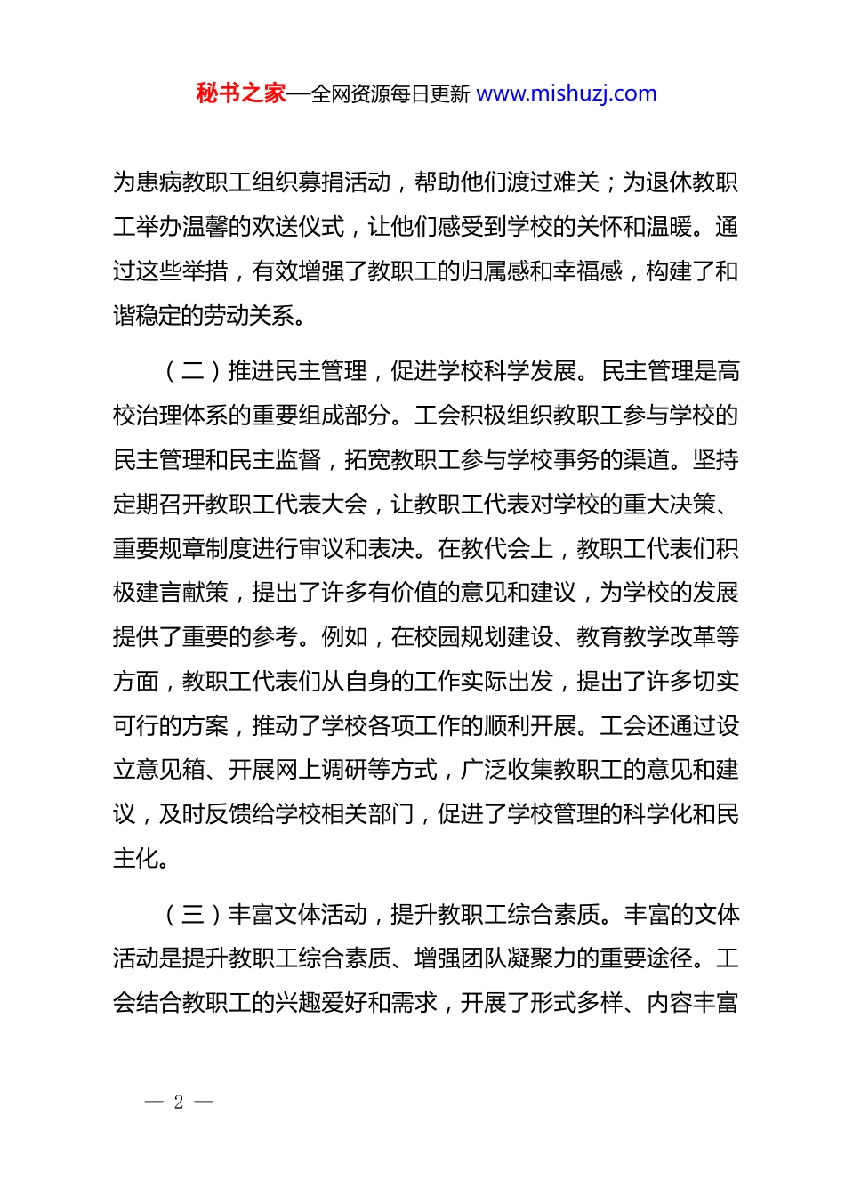 秘书之家—全网资源每日更新 www.mishuzj.com高校工会主席在高校工会工作会议上的讲话同志们:今天,我们召开这次高校工会工作会议,旨在总结过去一段时间工会的工作情况,分析当前面临的形势与问题,明确未来的工作方向和重点任务。工会作为学校*委联系教职工群众的桥梁和纽带,承担着维护教职工合法权益、组织教职工参与学校民主管理、丰富教职工精神文化生活等重要职责。在过去的工作中,我们共同努力,取得了一定的成绩,但也存在着一些不足。下面,我代表学校工会,就相关工作讲几点意见。一、回顾过往工作,总结经验与成果(一)维护教职工权益,构建和谐劳动关系。维护教职工的合法权益是工会的基本职责。过去一段时间,积极关注教职工的工作和生活需求,在涉及教职工切身利益的重大问题上,充分发挥工会的作用。在学校薪酬调整方案制定过程中,工会深入调研教职工的意见和建议,组织教职工代表与学校行政方进行多次协商沟通,确保方案既符合学校的整体发展利益,又能充分保障教职工的合理收入水平。积极推动学校完善教职工福利体系,在节日慰问、困难帮扶等方面做了大量细致的工作。— 1 —秘书之家—全网资源每日更新 www.mishuzj.com为患病教职工组织募捐活动,帮助他们渡过难关;为退休教职工举办温馨的欢送仪式,让他们感受到学校的关怀和温暖。通过这些举措,有效增强了教职工的归属感和幸福感,构建了和谐稳定的劳动关系。(二)推进民主管理,促进学校科学发展。民主管理是高校治理体系的重要组成部分。工会积极组织教职工参与学校的民主管理和民主监督,拓宽教职工参与学校事务的渠道。坚持定期召开教职工代表大会,让教职工代表对学校的重大决策、重要规章制度进行审议和表决。在教代会上,教职工代表们积极建言献策,提出了许多有价值的意见和建议,为学校的发展提供了重要的参考。例如,在校园规划建设、教育教学改革等方面,教职工代表们从自身的工作实际出发,提出了许多切实可行的方案,推动了学校各项工作的顺利开展。工会还通过设立意见箱、开展网上调研等方式,广泛收集教职工的意见和建议,及时反馈给学校相关部门,促进了学校管理的科学化和民主化。(三)丰富文体活动,提升教职工综合素质。丰富的文体活动是提升教职工综合素质、增强团队凝聚力的重要途径。工会结合教职工的兴趣爱好和需求,开展了形式多样、内容丰富— 2 —秘书之家—全网资源每日更新 www.mishuzj.com的文体活动。在体育方面,组织了教职工运动会、篮球赛、羽毛球赛等各类体育赛事,吸引了广大教职工的积极参与。通过这些赛事,不仅锻炼了教职工的身体素质,还培养了他们的团队合作精神和竞争意识。在文化方面,我们举办了教职工书法绘画展览、文艺晚会、读书分享会等活动,为教职工提供了展示才华的平台,丰富了他们的精神文化生活。工会还积极组织教职工参加各类培训和学习交流活动,鼓励他们不断提升自己的专业技能和综合素质,为学校的发展贡献更多的智慧和力量。二、正视当前问题,剖析挑战与不足(一)工作创新力度不够。随着时代的发展和社会的进步,教职工的需求日益多样化、个性化。然而,我们的工会工作在创新方面还存在一定的不足。工作方式和活动形式相对单一,缺乏吸引力和感染力。在组织文体活动时,往往局限于传统的体育比赛和文化展览,缺乏新颖性和趣味性,导致部分教职工参与积极性不高。在工作方法上,还习惯于采用传统的行政手段,缺乏运用现代信息技术和新媒体开展工作的能力,不能及时、准确地了解教职工的需求和意见,影响了工作的针对性和实效性。(二)服务教职工的能力有待提高。工会是教职工的“娘— 3 —秘书之家—全网资源每日更新 www.mishuzj.com家人”,为教职工服务是工会的根本宗旨。但在实际工作中,我们服务教职工的能力还不能完全满足教职工的需求。一方面,工会工作人员的专业素质和业务能力有待进一步提升。部分工作人员对工会工作的相关法律法规和政策理解不够深入,在处理教职工权益维护等问题时,缺乏专业知识和技能,不能为教职工提供有效的帮助和支持。另一方面,工会的服务资源相对有限,在为教职工提供个性化、精准化服务...