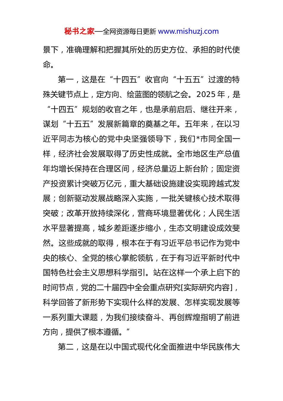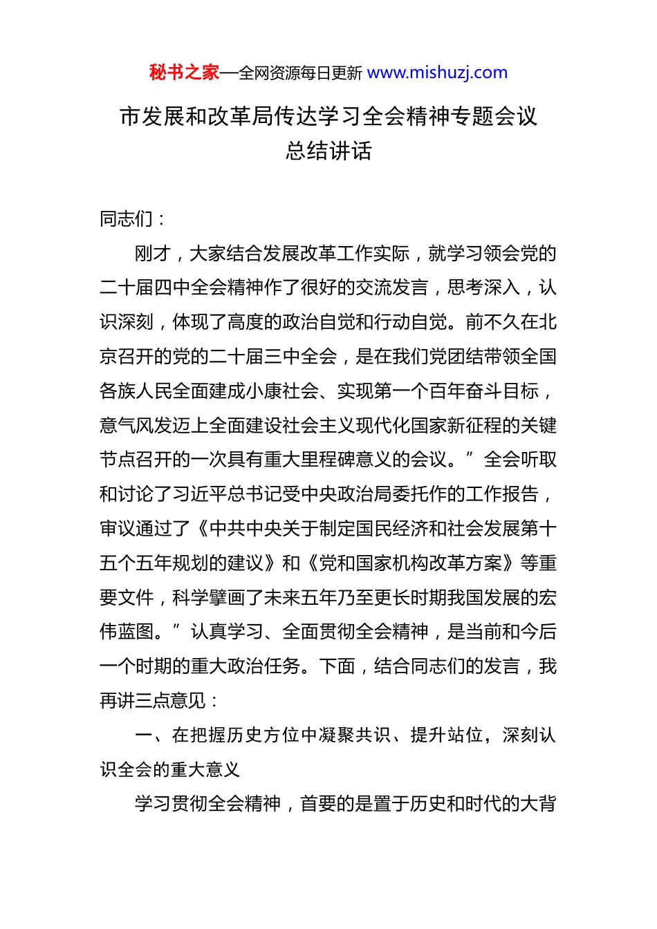 秘书之家—全网资源每日更新 www.mishuzj.com市发展和改革局传达学习全会精神专题会议总结讲话 同志们:刚才,大家结合发展改革工作实际,就学习领会党的二十届四中全会精神作了很好的交流发言,思考深入,认识深刻,体现了高度的政治自觉和行动自觉。前不久在北京召开的党的二十届三中全会,是在我们党团结带领全国各族人民全面建成小康社会、实现第一个百年奋斗目标,意气风发迈上全面建设社会主义现代化国家新征程的关键节点召开的一次具有重大里程碑意义的会议。”全会听取和讨论了习近平总书记受中央政治局委托作的工作报告,审议通过了《中共中央关于制定国民经济和社会发展第十五个五年规划的建议》和《党和国家机构改革方案》等重要文件,科学擘画了未来五年乃至更长时期我国发展的宏伟蓝图。”认真学习、全面贯彻全会精神,是当前和今后一个时期的重大政治任务。下面,结合同志们的发言,我再讲三点意见:一、在把握历史方位中凝聚共识、提升站位,深刻认识全会的重大意义学习贯彻全会精神,首要的是置于历史和时代的大背秘书之家—全网资源每日更新 www.mishuzj.com景下,准确理解和把握其所处的历史方位、承担的时代使命。第一,这是在“十四五”收官向“十五五”过渡的特殊关键节点上,定方向、绘蓝图的领航之会。2025 年,是“十四五”规划的收官之年,也是承前启后、继往开来,谋划“十五五”发展新篇章的奠基之年。五年来,在以习近平同志为核心的党中央坚强领导下,我们*市同全国一样,经济社会发展取得了历史性成就。全市地区生产总值年均增长保持在合理区间,经济总量迈上新台阶;固定资产投资累计突破万亿元,重大基础设施建设实现跨越式发展;创新驱动发展战略深入实施,一批关键核心技术取得突破;改革开放持续深化,营商环境显著优化;人民生活水平显著提高,城乡差距逐步缩小,生态文明建设成效斐然。这些成就的取得,根本在于有习近平总书记作为党中央的核心、全党的核心掌舵领航,在于有习近平新时代中国特色社会主义思想科学指引。站在这样一个承上启下的时间节点,党的二十届四中全会重点研究[实际研究内容],科学回答了新形势下实现什么样的发展、怎样实现发展等一系列重大课题,为我们接续奋斗、再创辉煌指明了前进方向,提供了根本遵循。”第二,这是在以中国式现代化全面推进中华民族伟大秘书之家—全网资源每日更新 www.mishuzj.com复兴的征程上,谋战略、促发展的奋进之会。推进中国式现代化,是新时代新征程我们党的中心任务。全会公报通篇贯穿着以中国式现代化全面推进中华民族伟大复兴的使命担当。全会强调,要坚持以高质量发展为主题,以改革创新为根本动力,以满足人民日益增长的美好生活需要为根本目的,加快构建新发展格局。这一系列战略部署,深刻体现了对中国式现代化内涵规律的精准把握。从加快发展新质生产力,建设现代化产业体系,到推进高水平科技自立自强;从促进城乡融合发展,全面推进乡村振兴,到推动区域协调发展;从繁荣发展文化事业和文化产业,到推动绿色发展,促进人与自然和谐共生,每一项部署都紧密围绕中国式现代化的本质要求,是对强国建设、民族复兴伟业的战略擘画。我们必须站在强国复兴的全局高度,深刻领会全会精神的核心要义,自觉把本市的发展放到全省、全国的大局中去谋划和推进。第三,这是在向第二个百年奋斗目标迈进的关键时期,明路径、强支撑的战略之会。当前,我国已经实现第一个百年奋斗目标,正在向着全面建成社会主义现代化强国的第二个百年奋斗目标迈进。到 2035 年基本实现社会主义现代化,是这一进程中的重要里程碑,而“十五五”时期是实现这一目标的关键阶段。全会着眼长远、立足当秘书之家—全网资源每日更新 www.mishuzj.com下,系统部署了未来五年经济社会发展的重点任务和战略举措。从完善宏观经济治理体系,到深化重点领域和关键环节改革;从扩大高水平对外开放,到推进国家安全体系和能力现代化,每一项部署都着眼于破解制约发展的深层次矛盾和问题,为实现现代化目标提供坚实保障。对我们而言,必须把全会确定的战略部署与本市实际紧密结合,既要补齐短板弱项,又要巩固拓展优势...