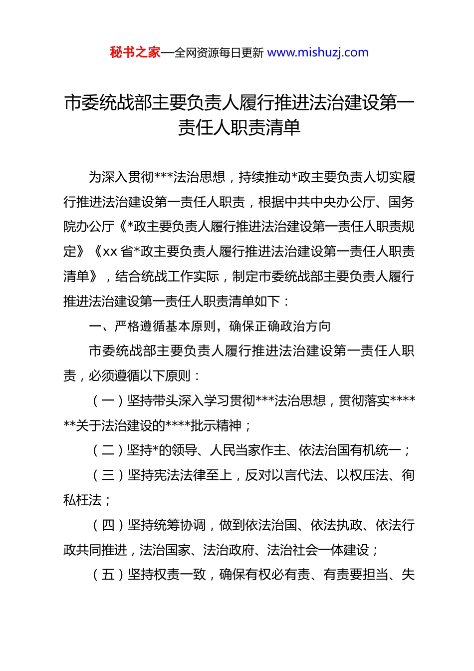 秘书之家—全网资源每日更新 www.mishuzj.com市委统战部主要负责人履行推进法治建设第一责任人职责清单为深入贯彻***法治思想,持续推动*政主要负责人切实履行推进法治建设第一责任人职责,根据中共中央办公厅、国务院办公厅《*政主要负责人履行推进法治建设第一责任人职责规定》《xx 省*政主要负责人履行推进法治建设第一责任人职责清单》,结合统战工作实际,制定市委统战部主要负责人履行推进法治建设第一责任人职责清单如下:一、严格遵循基本原则,确保正确政治方向市委统战部主要负责人履行推进法治建设第一责任人职责,必须遵循以下原则:(一)坚持带头深入学习贯彻***法治思想,贯彻落实******关于法治建设的****批示精神;(二)坚持*的领导、人民当家作主、依法治国有机统一;(三)坚持宪法法律至上,反对以言代法、以权压法、徇私枉法;(四)坚持统筹协调,做到依法治国、依法执政、依法行政共同推进,法治国家、法治政府、法治社会一体建设;(五)坚持权责一致,确保有权必有责、有责要担当、失秘书之家—全网资源每日更新 www.mishuzj.com责必追究;(六)坚持以身作则、以上率下,带头尊法学法守法用法。二、严抓责任落实,坚决做到以上率下市委统战部主要负责人作为推进法治建设第一责任人,应当做到:(一)切实履行依法治国重要组织者、推动者和实践者的职责,推动本单位贯彻落实*中央、国务院关于法治建设的重大决策部署;(二)统筹推进严格执法、公正司法、全民守法;(三)自觉运用法治思维和法治方式深化改革、推动发展、化解矛盾、维护稳定、应对风险;(四)对法治建设重要工作亲自部署、重大问题亲自过问、重点环节亲自协调、重要任务亲自督办,把本单位各项工作纳入法治化轨道。三、严格对标对表,确保实现高质量推进市委统战部主要负责人在推进法治建设中应当履行以下主要职责:1.坚持在*委领导下统筹谋划和推动法治建设工作各项任务,定期听取有关工作汇报,及时研究解决有关重大问题,将秘书之家—全网资源每日更新 www.mishuzj.com法治建设纳入年度工作计划,与统战工作同部署、同推进、同督促、同奖惩。(1)市委统战部部务会议每年至少听取一次法治建设工作汇报,及时研究解决有关重大问题。(2)推动法治建设纳入统战工作年度重点任务,列入重要议事日程。研究确定年度法治建设工作目标、主要任务和具体举措。加强法治建设工作调度,强化责任落实,严肃追责。2.坚持全面从严治*、依规治*,加强*内法规制度建设,提高*内法规制度执行力。(3)适时调整本单位守法普法协调小组成员,充实配强法治建设工作力量。统筹推进《中国共产*统一战线工作条例》《社会主义学院工作条例》等*内法规贯彻落实。(4)加强*内规范性文件备案审查,严格落实规范性文件备案审查制度,动态开展规范性文件清理调整工作,提高规范性文件制定质量。(5)加大对中共中央和 xx 省委相继印发的关于加强新时代统一战线工作相关文件的宣讲解读力度,推动将其作为理论中心组学习的重要内容。3.严格依法依规决策,加强合法合规性审查。(6)带头执行民主集中制,要求部领导班子成员所有“三秘书之家—全网资源每日更新 www.mishuzj.com重一大”事项均提请部务会议集体研究决定。(7)严格执行“一把手”末位表态,推动驻部纪检组参加会议制度并得到有效落实。4.督促领导班子其他成员依法办事,不得干预司法活动、插手具体案件处理。(8)定期听取部领导班子成员工作汇报,带头遵守法律,经常性提醒督促部领导班子其他成员强化法治意识,牢固树立法律红线不能触碰、法律底线不能逾越的观念,依法依规办事。(9)严格落实领导干部干预司法活动、插手具体案件处理的记录、通报和责任追究规定,支持司法、保证执法,确保司法机关依法独立公正行使职权。5.加强法治工作队伍建设,不断提升执法人员能力水平。(10)强化行政执法人员培训。规范民族、**执法行为,提高执法效率,避免执法过程的随意性和人为干预,提升行政执法水平。6.深入推进法治宣传教育,推动形成浓厚法治氛围。(11)坚持带头讲法治课,做深入学习宣传***法治思想的表率。(12)认真组织开展法治宣传教...