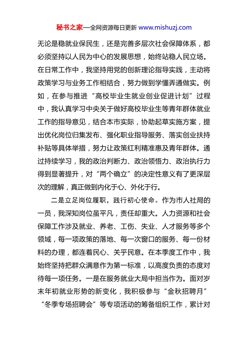秘书之家—全网资源每日更新 www.mishuzj.com预备党员(入党积极分子)第四季度思想汇报 2025 年第四季度,本人始终坚持以习近平新时代中国特色社会主义思想为指导,深入学习贯彻党的二十大和二十届四中全会精神,牢牢把握新时代党的建设总要求,在组织的培养教育和领导同事的帮助支持下,不断锤炼党性修养、提升政治能力、强化宗旨意识,努力将思想进步转化为服务民生的实际行动。在这一季度的工作与学习中,我深切感受到理论武装的强大力量、群众工作的深厚温度和岗位职责的时代分量,进一步坚定了听党话、跟党走的政治自觉,增强了立足人社岗位建功新时代的责任感与使命感。一是深化理论武装,筑牢信仰之基。思想是行动的先导,理论是实践的指南。作为一名青年党员干部,我始终坚持把加强政治理论学习作为首要任务,积极参加党支部组织的集中学习、专题研讨和主题党日活动,系统研读《习近平谈治国理政》第四卷、《论党的自我革命》等重要著作,认真领会党中央关于民生保障、就业优先、社会保障体系建设等方面的重大决策部署。通过学习,我更加深刻认识到,人社工作直接关系千家万户的切身利益,是党和政府联系群众最紧密、服务群众最直接的重要窗口。秘书之家—全网资源每日更新 www.mishuzj.com无论是稳就业保民生,还是完善多层次社会保障体系,都必须坚持以人民为中心的发展思想,始终站稳人民立场。在日常工作中,我坚持用党的创新理论指导实践,主动将政策学习与业务工作相结合,努力做到学懂弄通做实。例如,在参与推进“高校毕业生就业创业促进计划”过程中,我认真学习中央关于做好高校毕业生等青年群体就业工作的指导意见,结合本市实际,协助起草实施方案,提出优化岗位归集发布、强化职业指导服务、落实创业扶持补贴等具体举措,努力让政策红利精准惠及青年群体。通过持续学习,我的政治判断力、政治领悟力、政治执行力得到显著提升,对“两个确立”的决定性意义有了更深层次的理解,真正做到内化于心、外化于行。二是立足岗位履职,践行初心使命。作为市人社局的一员,我深知岗位虽平凡,责任却重大。人力资源和社会保障工作涉及就业、养老、工伤、失业、人才服务等多个领域,每一项政策的落地、每一次窗口的服务、每一份材料的办理,都连着民心、关乎民意。在本季度工作中,我始终坚持把群众满意作为第一标准,以高度负责的态度对待每一项任务。一是在服务就业大局中担当作为。面对岁末年初就业形势的新变化,我积极参与“金秋招聘月”“冬季专场招聘会”等专项活动的筹备组织工作,累计对秘书之家—全网资源每日更新 www.mishuzj.com接用工企业*家,归集就业岗位*余个,协助举办线上线下招聘活动*场,服务求职者*人次。同时,聚焦重点群体就业帮扶,参与建立“离校未就业高校毕业生实名制台账”,逐一对接了解就业意愿和培训需求,推送岗位信息*条,帮助*名毕业生实现稳定就业。二是在社保经办服务中提升效能。按照“放管服”改革要求,我积极参与推进社保业务“网上办”“掌上办”“就近办”,配合技术部门优化系统功能,梳理高频事项办事指南,推动实现失业保险金申领、养老保险关系转移接续等*项业务全流程线上办理。针对老年人、残疾人等特殊群体,倡导“温情服务”,协助设置绿色通道、提供帮办代办服务,确保政策红利不因技术门槛而打折扣。三是在政策宣传解读中贴近群众。为提高群众对人社政策的知晓率和获得感,我主动参与“政策进社区、服务到身边”宣讲活动,走进街道、乡镇、企业开展面对面宣讲*次,发放宣传资料*份,现场解答群众关于养老保险缴费、工伤认定流程、劳动权益维护等方面的疑问*余个。通过深入基层,我更加体会到群众对公平正义的期待、对美好生活的向往,也进一步增强了做好本职工作的动力与信心。三是锤炼党性修养,严守纪律规矩。成为一名预备党员,不仅是一种荣誉,更是一份沉甸甸的责任。在思想上秘书之家—全网资源每日更新 www.mishuzj.com入党是一辈子的事,必须时时对照党章党规检视言行,不断净化思想、校准行为。本季度,我认真参加支部组织的党纪学习教育,深入学习新修订的《中国共产党纪律处分条例》,逐条研读政治...