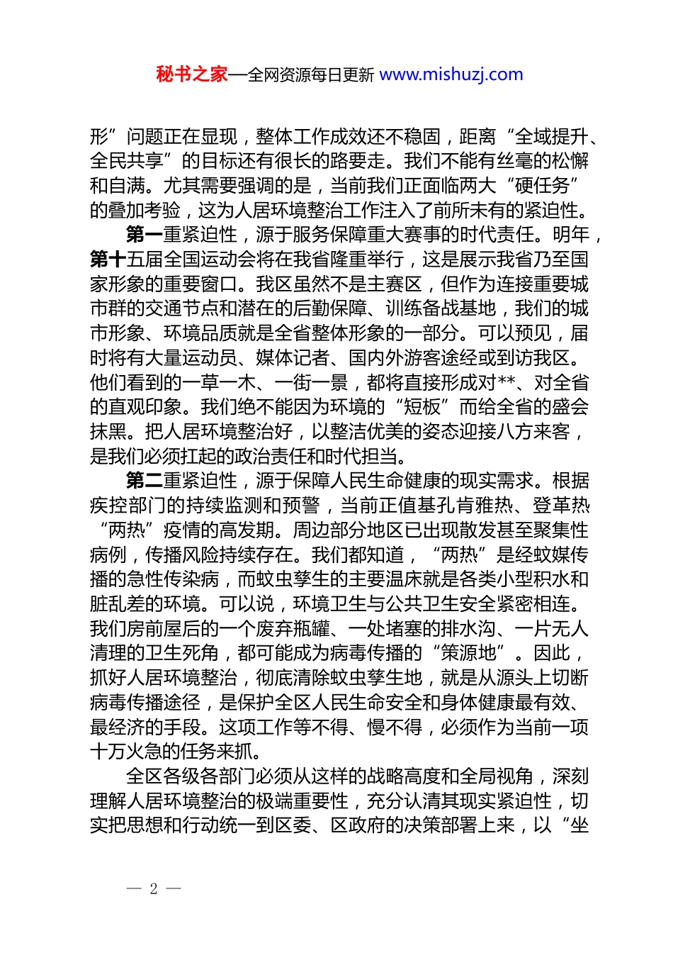 秘书之家—全网资源每日更新 www.mishuzj.com在 2025 年区“百千万工程”人居环境整治工作推进会上的讲话同志们:今天,我们在这里召开全区“百千万工程”人居环境整治工作推进会,主要任务是深入贯彻落实关于区域协调发展的重要指示重要论述精神,按照省委、市委的统一部署,聚焦“百千万工程”三年初见成效的核心目标,对当前我区人居环境存在的突出问题进行再梳理、再动员、再部署,动员全区上下以决战决胜的姿态,集中攻坚,彻底整改,确保全域人居环境品质实现根本性、全局性的焕新提升。刚才,相关部门已经通报了前一阶段的工作进展和督查情况,指出的问题客观实在,提出的建议也很有针对性。下面,我讲三点意见。一、提高站位,深刻认识人居环境整治的极端重要性和现实紧迫性优良的人居环境,是人民群众幸福生活的基本需求,是区域竞争力的核心体现,更是推动高质量发展的坚实基础。“百千万工程”作为省委推动区域协调发展的头号工程,其根本落脚点就是要让广大人民群众共享高质量发展的成果。而一个干净、整洁、有序、安全的人居环境,正是这项成果最直接、最普惠的体现。可以说,人居环境整治抓得好不好,直接关系到“百千万工程”的成色与底色,直接决定了我们在三年大考中能否交出一份合格的答卷。当前,我区的人居环境整治工作已经取得了一定成效,城乡面貌有了一定改观。但我们必须清醒地认识到,对照“三年初见成效”的高标准严要求,对照人民群众对美好生活的新期待,我们的工作还存在巨大的差距。一些长期存在的“老大难”问题尚未根除,一些新出现的“隐— 1 —秘书之家—全网资源每日更新 www.mishuzj.com形”问题正在显现,整体工作成效还不稳固,距离“全域提升、全民共享”的目标还有很长的路要走。我们不能有丝毫的松懈和自满。尤其需要强调的是,当前我们正面临两大“硬任务”的叠加考验,这为人居环境整治工作注入了前所未有的紧迫性。第一重紧迫性,源于服务保障重大赛事的时代责任。明年,第十五届全国运动会将在我省隆重举行,这是展示我省乃至国家形象的重要窗口。我区虽然不是主赛区,但作为连接重要城市群的交通节点和潜在的后勤保障、训练备战基地,我们的城市形象、环境品质就是全省整体形象的一部分。可以预见,届时将有大量运动员、媒体记者、国内外游客途经或到访我区。他们看到的一草一木、一街一景,都将直接形成对**、对全省的直观印象。我们绝不能因为环境的“短板”而给全省的盛会抹黑。把人居环境整治好,以整洁优美的姿态迎接八方来客,是我们必须扛起的政治责任和时代担当。第二重紧迫性,源于保障人民生命健康的现实需求。根据疾控部门的持续监测和预警,当前正值基孔肯雅热、登革热“两热”疫情的高发期。周边部分地区已出现散发甚至聚集性病例,传播风险持续存在。我们都知道,“两热”是经蚊媒传播的急性传染病,而蚊虫孳生的主要温床就是各类小型积水和脏乱差的环境。可以说,环境卫生与公共卫生安全紧密相连。我们房前屋后的一个废弃瓶罐、一处堵塞的排水沟、一片无人清理的卫生死角,都可能成为病毒传播的“策源地”。因此,抓好人居环境整治,彻底清除蚊虫孳生地,就是从源头上切断病毒传播途径,是保护全区人民生命安全和身体健康最有效、最经济的手段。这项工作等不得、慢不得,必须作为当前一项十万火急的任务来抓。全区各级各部门必须从这样的战略高度和全局视角,深刻理解人居环境整治的极端重要性,充分认清其现实紧迫性,切实把思想和行动统一到区委、区政府的决策部署上来,以“坐— 2 —秘书之家—全网资源每日更新 www.mishuzj.com不住、等不起、慢不得”的责任感,全力以赴投入到这场攻坚战中。二、聚焦症结,以系统思维和决战姿态推动问题标本兼治问题是时代的声音,也是我们工作的靶向。做好人居环境整治,不能搞“大水漫灌”,必须坚持问题导向,精准发力,靶向治疗。从前期的调研和督查情况看,当前我区人居环境的短板主要集中在六个方面,这六个方面的问题,也正是我们接下来要集中火力、全面攻坚的主战场。(一)聚力攻坚交通秩序,畅通城市“血脉”。交通秩序是城市文明的“第一窗口”。目前,主...