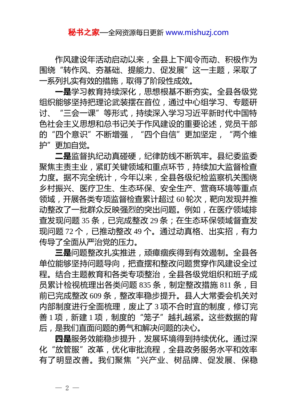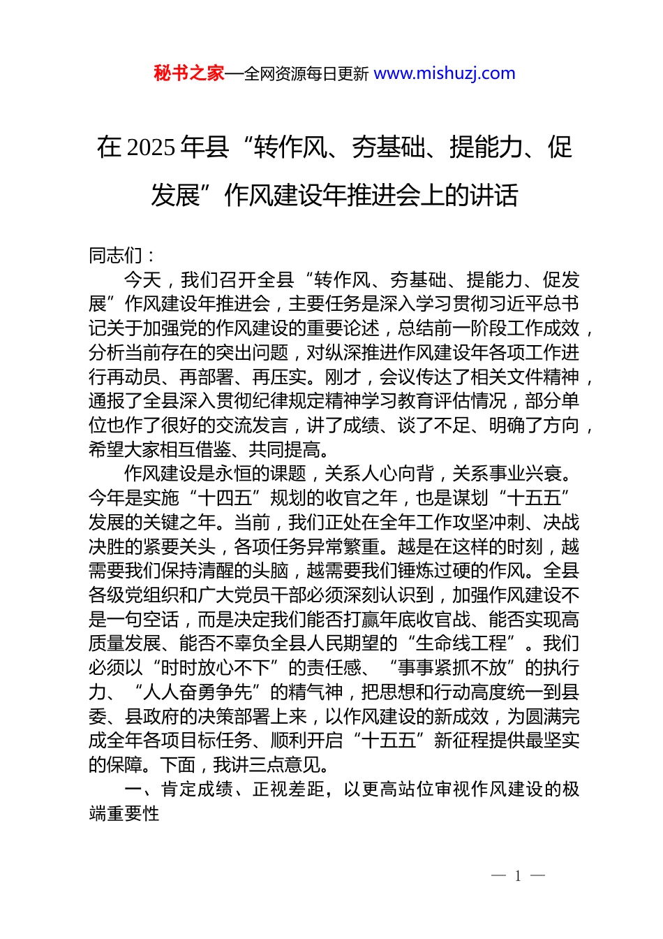 秘书之家—全网资源每日更新 www.mishuzj.com在 2025 年县“转作风、夯基础、提能力、促发展”作风建设年推进会上的讲话同志们:今天,我们召开全县“转作风、夯基础、提能力、促发展”作风建设年推进会,主要任务是深入学习贯彻习近平总书记关于加强党的作风建设的重要论述,总结前一阶段工作成效,分析当前存在的突出问题,对纵深推进作风建设年各项工作进行再动员、再部署、再压实。刚才,会议传达了相关文件精神,通报了全县深入贯彻纪律规定精神学习教育评估情况,部分单位也作了很好的交流发言,讲了成绩、谈了不足、明确了方向,希望大家相互借鉴、共同提高。作风建设是永恒的课题,关系人心向背,关系事业兴衰。今年是实施“十四五”规划的收官之年,也是谋划“十五五”发展的关键之年。当前,我们正处在全年工作攻坚冲刺、决战决胜的紧要关头,各项任务异常繁重。越是在这样的时刻,越需要我们保持清醒的头脑,越需要我们锤炼过硬的作风。全县各级党组织和广大党员干部必须深刻认识到,加强作风建设不是一句空话,而是决定我们能否打赢年底收官战、能否实现高质量发展、能否不辜负全县人民期望的“生命线工程”。我们必须以“时时放心不下”的责任感、“事事紧抓不放”的执行力、“人人奋勇争先”的精气神,把思想和行动高度统一到县委、县政府的决策部署上来,以作风建设的新成效,为圆满完成全年各项目标任务、顺利开启“十五五”新征程提供最坚实的保障。下面,我讲三点意见。一、肯定成绩、正视差距,以更高站位审视作风建设的极端重要性— 1 —秘书之家—全网资源每日更新 www.mishuzj.com作风建设年活动启动以来,全县上下闻令而动、积极作为围绕“转作风、夯基础、提能力、促发展”这一主题,采取了一系列扎实有效的措施,取得了阶段性成效。一是学习教育持续深化,思想根基不断夯实。全县各级党组织能够坚持把理论武装摆在首位,通过中心组学习、专题研讨、“三会一课”等形式,持续深入学习习近平新时代中国特色社会主义思想和总书记关于作风建设的重要论述,党员干部的“四个意识”不断增强,“四个自信”更加坚定,“两个维护”更加自觉。二是监督执纪动真碰硬,纪律防线不断筑牢。县纪委监委聚焦主责主业,紧盯关键领域和重点环节,持续加大监督检查力度。据不完全统计,今年以来,全县各级纪检监察机关围绕乡村振兴、医疗卫生、生态环保、安全生产、营商环境等重点领域,开展各类专项监督检查累计超过 60 轮次,靶向发现并推动整改了一批群众反映强烈的突出问题。例如,在医疗领域排查发现问题 35 条,已完成整改 29 条;在生态环保领域督查发现问题 72 个,已推动整改 49 个。通过动真格、出实招,有力传导了全面从严治党的压力。三是问题整改扎实推进,顽瘴痼疾得到有效遏制。全县各单位能够坚持问题导向,把查摆和整改问题贯穿作风建设全过程。结合主题教育和各类专项整治,全县各级党组织和班子成员累计检视梳理出各类问题 835 条,制定整改措施 811 条,目前已完成整改 609 条,整改率稳步提升。县人大常委会机关对内部制度进行全面梳理,废止了 3 项不合时宜的制度,修订完善 1 项,新建 1 项,制度的“笼子”越扎越紧。这些数据的背后,是我们直面问题的勇气和解决问题的决心。四是服务效能稳步提升,发展环境得到持续优化。通过深化“放管服”改革,优化审批流程,全县政务服务水平和效率有了明显改善。我们聚焦“兴产业、树品牌、促发展、保稳— 2 —秘书之家—全网资源每日更新 www.mishuzj.com定”等中心任务,推动了一批重点项目落地见效,解决了一批企业和群众的急难愁盼问题。作风的转变,正实实在在地转化为发展的动能和群众的满意度。在肯定成绩的同时,我们更要清醒地看到,与新时代新征程的要求相比,与人民群众的期盼相比,我县的作风建设仍然存在不少亟待解决的突出问题。刚才通报的情况,以及我们日常调研掌握的情况,都印证了这一点。这些问题,有些是老问题,有些是新表现,但根子都在于思想认识不到位、党性修养不纯粹、责任担当不强化。具体来看,主要有以下六个方面:第一,执行落实“有温差”。...