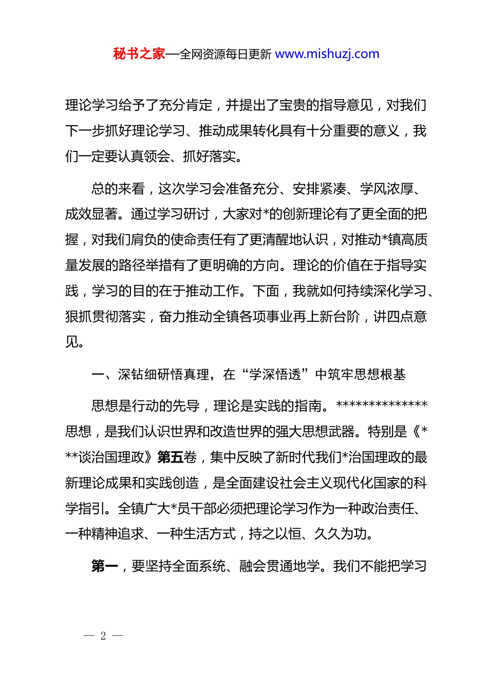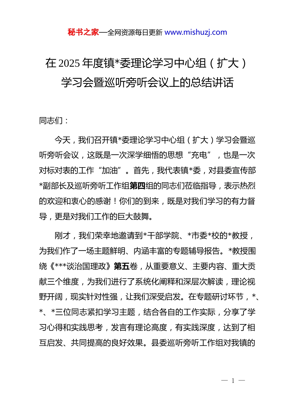 秘书之家—全网资源每日更新 www.mishuzj.com在 2025 年度镇*委理论学习中心组(扩大)学习会暨巡听旁听会议上的总结讲话同志们:今天,我们召开镇*委理论学习中心组(扩大)学习会暨巡听旁听会议,这既是一次深学细悟的思想“充电”,也是一次对标对表的工作“加油”。首先,我代表镇*委,对县委宣传部*副部长及巡听旁听工作组第四组的同志们莅临指导,表示热烈的欢迎和衷心的感谢!你们的到来,既是对我们学习的有力督导,更是对我们工作的巨大鼓舞。刚才,我们荣幸地邀请到*干部学院、*市委*校的*教授,为我们作了一场主题鲜明、内涵丰富的专题辅导报告。*教授围绕《***谈治国理政》第五卷,从重要意义、主要内容、重大贡献三个维度,为我们进行了系统化阐释和深层次解读,理论视野开阔,现实针对性强,让我们深受启发。在专题研讨环节,*、*、*三位同志紧扣学习主题,结合各自的工作实际,分享了学习心得和实践思考,发言有理论高度,有实践深度,达到了相互启发、共同提高的良好效果。县委巡听旁听工作组对我镇的— 1 —秘书之家—全网资源每日更新 www.mishuzj.com理论学习给予了充分肯定,并提出了宝贵的指导意见,对我们下一步抓好理论学习、推动成果转化具有十分重要的意义,我们一定要认真领会、抓好落实。总的来看,这次学习会准备充分、安排紧凑、学风浓厚、成效显著。通过学习研讨,大家对*的创新理论有了更全面的把握,对我们肩负的使命责任有了更清醒地认识,对推动*镇高质量发展的路径举措有了更明确的方向。理论的价值在于指导实践,学习的目的在于推动工作。下面,我就如何持续深化学习、狠抓贯彻落实,奋力推动全镇各项事业再上新台阶,讲四点意见。一、深钻细研悟真理,在“学深悟透”中筑牢思想根基思想是行动的先导,理论是实践的指南。**************思想,是我们认识世界和改造世界的强大思想武器。特别是《***谈治国理政》第五卷,集中反映了新时代我们*治国理政的最新理论成果和实践创造,是全面建设社会主义现代化国家的科学指引。全镇广大*员干部必须把理论学习作为一种政治责任、一种精神追求、一种生活方式,持之以恒、久久为功。第一,要坚持全面系统、融会贯通地学。我们不能把学习— 2 —秘书之家—全网资源每日更新 www.mishuzj.com停留在“一知半解”或“浅尝辄止”的层面。要把《***谈治国理政》第五卷与前四卷作为一个有机整体,贯通起来学习、联系起来思考。要紧密结合*的二十大精神,结合******对我省考察调研时作出的一系列重要讲话和****精神,一体学习、一体领会。通过这种体系化的学习,我们才能深刻理解这一思想的核心要义、精神实质、丰富内涵和实践要求,才能从整体上把握其内在的逻辑结构和理论体系,真正做到知其言更知其义、知其然更知其所以然。第二,要坚持抓住关键、突出重点地学。学习要善于抓“纲”,纲举才能目张。《***谈治国理政》第五卷内容博大精深,我们要在全面学习的基础上,重点领会其中关于“中国式现代化”“高质量发展”“全过程人民民主”“人与自然和谐共生”“全面从严治*”等一系列原创性的新理念新思想新战略。这些都是我们推动*镇发展的“金钥匙”。全镇*员干部,特别是领导班子成员和各村、各单位的“一把手”,要带头学、深入学,深刻领悟“两个确立”的决定性意义,增强“四个意识”、坚定“四个自信”、做到“两个维护”,不断提高政治判断力、政治领悟力、政治执行力,确保在任何时候、任何情况下都同以***同志为核心的*中央保持高度一致。— 3 —秘书之家—全网资源每日更新 www.mishuzj.com第三,要坚持联系实际、带着问题地学。学习不能空对空,必须与我们正在做的事情紧密结合起来。要大力弘扬理论联系实际的马克思主义学风,把自己摆进去、把职责摆进去、把工作摆进去。要带着“*镇的发展瓶颈在哪里”“群众的急难愁盼是什么”“我的岗位职责如何更好地服务大局”这些问题去学,在*的创新理论中寻找答案、寻求方法、汲取智慧。通过学习,切实把蕴含其中的立场、观点、方法,转化为我们分析和解决实际问题的能力,最终将学习成果体现为推动*镇高质量发展的政治自觉、思想自觉和行动...