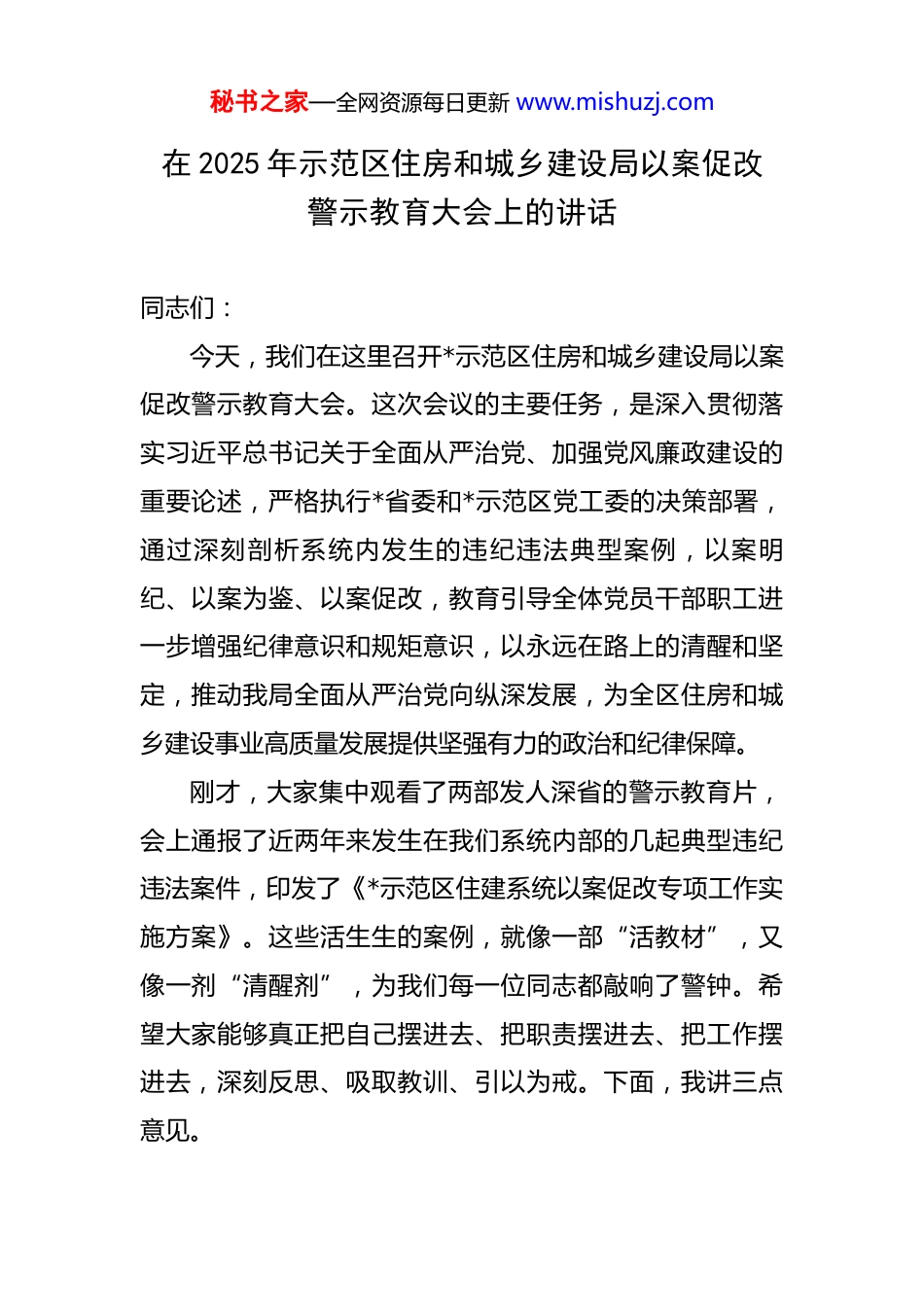 秘书之家—全网资源每日更新 www.mishuzj.com在 2025 年示范区住房和城乡建设局以案促改警示教育大会上的讲话 同志们:今天,我们在这里召开*示范区住房和城乡建设局以案促改警示教育大会。这次会议的主要任务,是深入贯彻落实习近平总书记关于全面从严治党、加强党风廉政建设的重要论述,严格执行*省委和*示范区党工委的决策部署,通过深刻剖析系统内发生的违纪违法典型案例,以案明纪、以案为鉴、以案促改,教育引导全体党员干部职工进一步增强纪律意识和规矩意识,以永远在路上的清醒和坚定,推动我局全面从严治党向纵深发展,为全区住房和城乡建设事业高质量发展提供坚强有力的政治和纪律保障。刚才,大家集中观看了两部发人深省的警示教育片,会上通报了近两年来发生在我们系统内部的几起典型违纪违法案件,印发了《*示范区住建系统以案促改专项工作实施方案》。这些活生生的案例,就像一部“活教材”,又像一剂“清醒剂”,为我们每一位同志都敲响了警钟。希望大家能够真正把自己摆进去、把职责摆进去、把工作摆进去,深刻反思、吸取教训、引以为戒。下面,我讲三点意见。秘书之家—全网资源每日更新 www.mishuzj.com一、认清严峻形势,正视突出问题,深刻领会推进以案促改的极端重要性近年来,在*示范区党工委、管委会的坚强领导下,我局全体干部职工围绕中心、服务大局,攻坚克难、砥砺奋进,在城市更新、民生保障、项目建设、行业管理等方面取得了显著成绩。特别是在过去的一年里,我们统筹推进了一系列重大项目建设,城市面貌日新月异,人居环境持续改善。据统计,仅 2025 年,全区计划实施的房地产领域重点项目就达到 25 个,总投资额高达 164.19 亿元,年度计划投资 30.80 亿元。这些成绩的取得,离不开在座各位的辛勤付出和不懈努力。在肯定成绩的同时,我们也必须清醒地看到,住房和城乡建设领域作为经济社会发展的重要组成部分,始终是资金、资源、权力的集中区,工程项目多、投资体量大、审批环节多,廉政风险点多、面广、线长,社会关注度极高,历来是腐败问题易发多发的“高危地带”。从刚才通报的案件和观看的警示教育片中,我们可以痛心地发现,一些曾经的同事、身边的干部,在各种诱惑面前没有守住底线,一步步滑向了违纪违法的深渊。剖析这些案件,根源触目惊心。其根本原因在于理想信念这个“总开关”出了问题。一些干部在市场经济大潮和形形色色的诱惑考验秘书之家—全网资源每日更新 www.mishuzj.com面前,忘记了入党时的铮铮誓言,忘记了作为人民公仆的初心使命,世界观、人生观、价值观发生严重扭曲,把党和人民赋予的权力异化为谋取私利的工具,最终从“好同志”沦为“阶下囚”。比如,我局下属某单位原主要负责人张*,在长达数年的时间里,利用其在工程项目发包、施工许可、竣工验收等环节的职权,为多家建筑企业在项目承揽、资质升级等方面提供“便利”,先后收受贿赂款物折合人民币数百万元。其行为不仅严重破坏了公平竞争的市场环境,也给我局的政治生态和整体形象造成了极其恶劣的影响,最终身陷囹圄,令人扼腕叹息。这些反面典型就发生在我们身边,教训极其深刻。它警示我们,全面从严治党永远在路上,反腐败斗争的形势依然严峻复杂。它告诫我们,任何时候都不能对自身要求有丝毫放松,任何环节都不能对权力监督有丝毫懈怠。住建系统的每一名党员干部,特别是手握审批权、执法权、管理权的关键岗位人员,必须深刻认识到以案促改工作的重要性和紧迫性,切实把思想和行动统一到党中央和省委、示范区党工委的决策部署上来,以刀刃向内的勇气和自我革命的精神,坚决清除侵蚀我们肌体健康的病毒,营造风清气正的良好政治生态。二、坚持标本兼治,深化系统治理,全面推动以案促秘书之家—全网资源每日更新 www.mishuzj.com改工作向纵深发展开展以案促改,不是简单地查处几个人、通报几个案例就万事大吉,而是要做好查办案件的“后半篇文章”,达到“查处一案、警示一片、治理一域”的效果。必须坚持系统观念,标本兼治,一体推进不敢腐、不能腐、不想腐的长效机制建设。第一,以案为鉴,在思想深处筑牢“不想腐”的堤坝。思想是行动的...