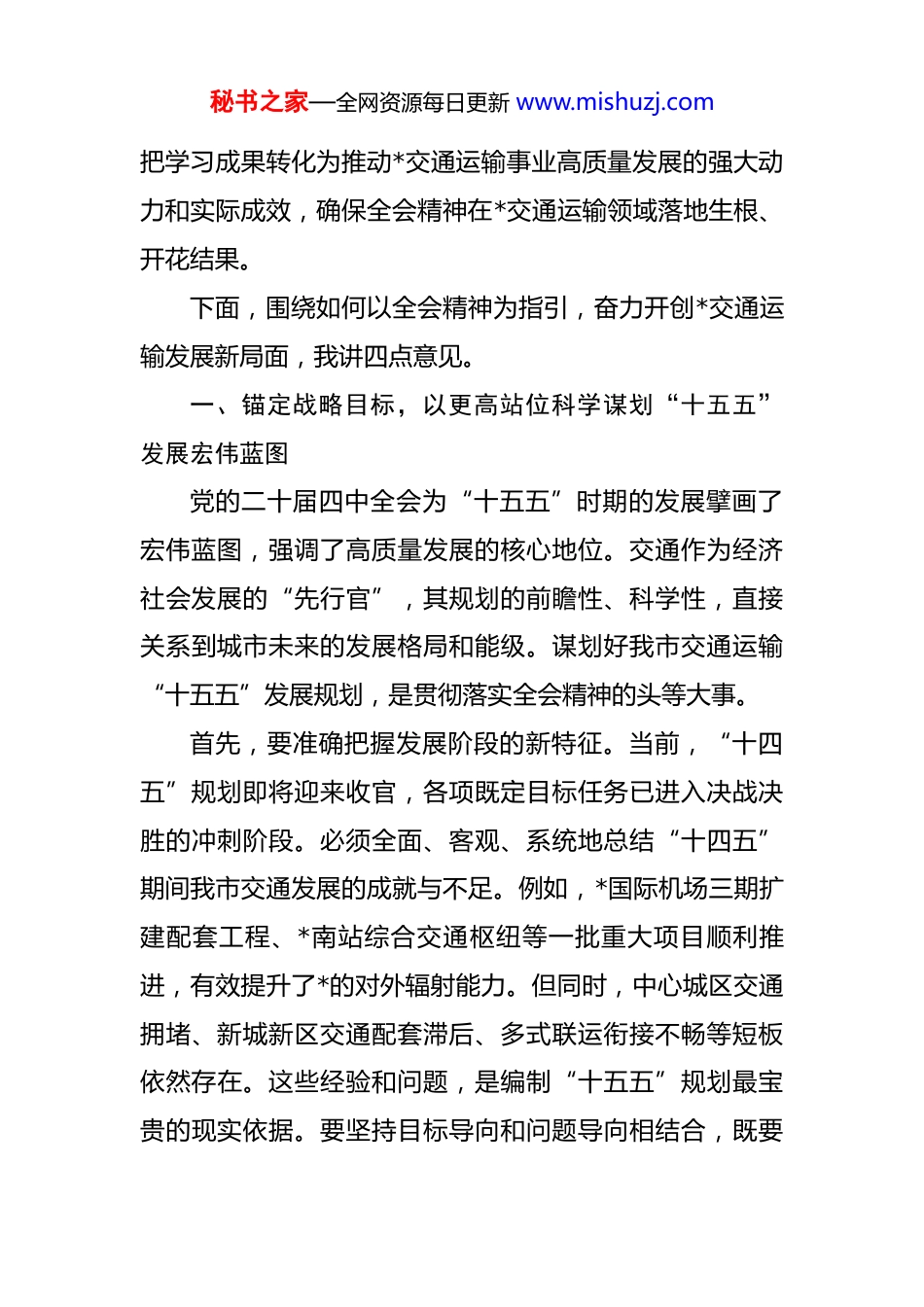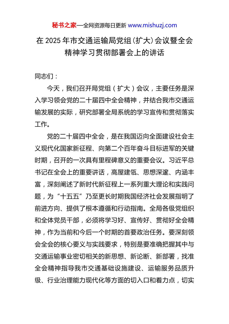 秘书之家—全网资源每日更新 www.mishuzj.com在 2025 年市交通运输局党组(扩大)会议暨全会精神学习贯彻部署会上的讲话 同志们:今天,我们召开局党组(扩大)会议,主要任务是深入学习领会党的二十届四中全会精神,并结合我市交通运输发展的实际,研究部署全局系统的学习宣传和贯彻落实工作。党的二十届四中全会,是在我国迈向全面建设社会主义现代化国家新征程、向第二个百年奋斗目标进军的关键时期,召开的一次具有里程碑意义的重要会议。习近平总书记在全会上的重要讲话,高屋建瓴、思想深邃、内涵丰富,深刻阐述了新时代新征程上一系列重大理论和实践问题,为“十五五”乃至更长时期我国经济社会发展指明了前进方向、提供了根本遵循和行动指南。全局各级党组织和全体党员干部,必须将学习好、宣传好、贯彻好全会精神,作为当前和今后一个时期的首要政治任务。要深刻领会全会的核心要义与实践要求,特别是要准确把握其中与交通运输事业密切相关的新思想、新论断、新部署,找准全会精神指导我市交通基础设施建设、运输服务品质升级、行业治理能力现代化等方面的切入口和着力点,切实秘书之家—全网资源每日更新 www.mishuzj.com把学习成果转化为推动*交通运输事业高质量发展的强大动力和实际成效,确保全会精神在*交通运输领域落地生根、开花结果。下面,围绕如何以全会精神为指引,奋力开创*交通运输发展新局面,我讲四点意见。一、锚定战略目标,以更高站位科学谋划“十五五”发展宏伟蓝图党的二十届四中全会为“十五五”时期的发展擘画了宏伟蓝图,强调了高质量发展的核心地位。交通作为经济社会发展的“先行官”,其规划的前瞻性、科学性,直接关系到城市未来的发展格局和能级。谋划好我市交通运输“十五五”发展规划,是贯彻落实全会精神的头等大事。首先,要准确把握发展阶段的新特征。当前,“十四五”规划即将迎来收官,各项既定目标任务已进入决战决胜的冲刺阶段。必须全面、客观、系统地总结“十四五”期间我市交通发展的成就与不足。例如,*国际机场三期扩建配套工程、*南站综合交通枢纽等一批重大项目顺利推进,有效提升了*的对外辐射能力。但同时,中心城区交通拥堵、新城新区交通配套滞后、多式联运衔接不畅等短板依然存在。这些经验和问题,是编制“十五五”规划最宝贵的现实依据。要坚持目标导向和问题导向相结合,既要秘书之家—全网资源每日更新 www.mishuzj.com对标国内外先进城市,提升发展预期,也要立足*实际,找准症结、精准发力。其次,要主动对接国家战略的新部署。全会精神指引下的“十五五”规划,将更加注重发展的整体性、系统性和协调性。交通运输部明确指出,将持续推进“十四五”规划各项目标任务,并为“十五五”的良好开局打下坚实基础,同时已着手制定“十五五”综合交通运输规划,谋划一批具有战略意义的重大交通项目。放眼全国,2025 年全年预计完成交通固定资产投资 3.8 万亿元,这股强大的投资势头将延续至整个“十五五”时期。我们必须闻风而动、顺势而为,积极向上争取政策、项目和资金支持。要紧紧围绕构建现代化高质量综合立体交通网的总体目标,前瞻性地谋划一批能够支撑*长远发展、提升城市核心竞争力的战略性、枢纽性、网络化重大项目。初步构想,在“十五五”期间,要力争全社会交通固定资产投资累计突破 3000 亿元,重点推动诸如*都市圈环线高速公路、*跨江公铁两用大桥、市内轨道交通第四期建设规划等一批标志性工程的落地实施,在扩大有效投资、服务构建新发展格局中展现交通担当。最后,要强化规划执行的刚性约束。规划一经确定,就要成为全局上下的共同行动纲领。要建立健全规划实施秘书之家—全网资源每日更新 www.mishuzj.com的动态监测、中期评估和总结评估机制,确保“一张蓝图绘到底”。要将规划中的重大项目、重大政策、重大改革任务分解到处室、单位和个人,明确时间表、路线图、责任状,以钉钉子精神推动各项工作落到实处,确保“十五五”开好局、起好步,为全市经济社会持续健康发展提供坚如磐石的交通支撑。二、深化改革创新,以更强决心构建一体化综合交通运输体系党的二十届四中全会强调,要持续深...