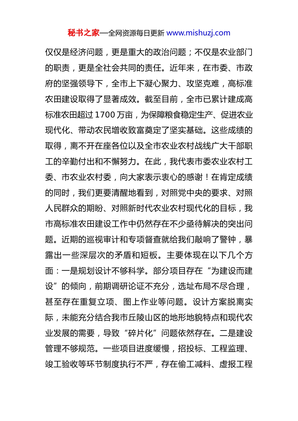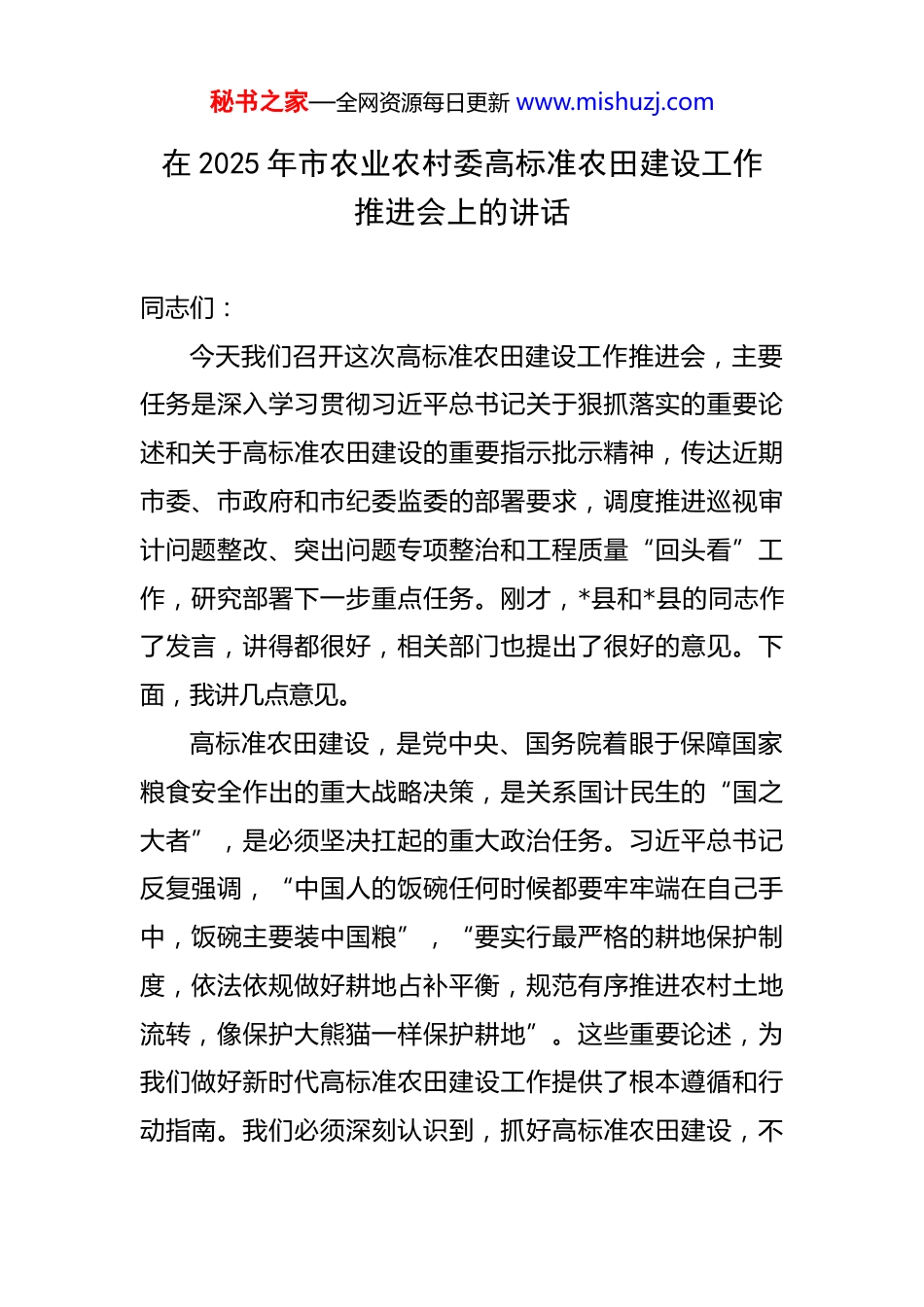 秘书之家—全网资源每日更新 www.mishuzj.com在 2025 年市农业农村委高标准农田建设工作推进会上的讲话 同志们:今天我们召开这次高标准农田建设工作推进会,主要任务是深入学习贯彻习近平总书记关于狠抓落实的重要论述和关于高标准农田建设的重要指示批示精神,传达近期市委、市政府和市纪委监委的部署要求,调度推进巡视审计问题整改、突出问题专项整治和工程质量“回头看”工作,研究部署下一步重点任务。刚才,*县和*县的同志作了发言,讲得都很好,相关部门也提出了很好的意见。下面,我讲几点意见。高标准农田建设,是党中央、国务院着眼于保障国家粮食安全作出的重大战略决策,是关系国计民生的“国之大者”,是必须坚决扛起的重大政治任务。习近平总书记反复强调,“中国人的饭碗任何时候都要牢牢端在自己手中,饭碗主要装中国粮”,“要实行最严格的耕地保护制度,依法依规做好耕地占补平衡,规范有序推进农村土地流转,像保护大熊猫一样保护耕地”。这些重要论述,为我们做好新时代高标准农田建设工作提供了根本遵循和行动指南。我们必须深刻认识到,抓好高标准农田建设,不秘书之家—全网资源每日更新 www.mishuzj.com仅仅是经济问题,更是重大的政治问题;不仅是农业部门的职责,更是全社会共同的责任。近年来,在市委、市政府的坚强领导下,全市上下凝心聚力、攻坚克难,高标准农田建设取得了显著成效。截至目前,全市已累计建成高标准农田超过 1700 万亩,为保障粮食稳定生产、促进农业现代化、带动农民增收致富奠定了坚实基础。这些成绩的取得,离不开在座各位以及全市农业农村战线广大干部职工的辛勤付出和不懈努力。在此,我代表市委农业农村工委、市农业农村委,向大家表示衷心的感谢!在肯定成绩的同时,我们更要清醒地看到,对照党中央的要求、对照人民群众的期盼、对照新时代农业农村现代化的目标,我市高标准农田建设工作中仍然存在不少亟待解决的突出问题。近期的巡视审计和专项督查就给我们敲响了警钟,暴露出一些深层次的矛盾和短板。主要体现在以下几个方面:一是规划设计不够科学。部分项目存在“为建设而建设”的倾向,前期调研论证不充分,选址布局不尽合理,甚至存在重复立项、图上作业等问题。设计方案脱离实际,未能充分结合我市丘陵山区的地形地貌特点和现代农业发展的需要,导致“碎片化”问题依然存在。二是建设管理不够规范。一些项目进度缓慢,招投标、工程监理、竣工验收等环节制度执行不严,存在偷工减料、虚报工程秘书之家—全网资源每日更新 www.mishuzj.com量、违规转包分包等现象,工程质量堪忧。三是资金使用不够到位。少数地区存在专项资金拨付不及时、挤占挪用等问题,资金使用效益未能充分发挥。四是建后管护不够有力。“重建轻管”现象普遍存在,管护主体责任不明确、管护经费不落实、管护机制不健全,导致部分建成项目设施损毁、功能衰减,甚至出现撂荒和“非粮化”、“非农化”现象,没有真正实现“建成一亩、管好一亩、见效一亩”的目标。这些问题,不仅影响了高标准农田建设的成效,也损害了党和政府的形象,挫伤了农民群众的积极性。我们必须以“零容忍”的态度正视这些问题,以刮骨疗毒的勇气加以解决。一分部署,九分落实。面对新形势、新任务、新挑战,我们必须进一步统一思想,提高站位,以“马上就办、办就办好”的过硬作风,发扬钉钉子精神,全力推动高标准农田建设工作再上新台阶。下面,我强调五点工作要求。第一,以雷霆之势抓好问题整改,确保存量问题清仓见底。问题是时代的声音,整改是政治的担当。针对巡视、审计、督查发现的各类问题,各区县、各部门必须坚决扛起整改主体责任,决不能有任何含糊和懈怠。要立即行动起来,建立详尽的问题台账、责任清单和整改时限表,实行挂图作战、对账销号。要明确责任主体,将整改秘书之家—全网资源每日更新 www.mishuzj.com责任落实到具体单位、具体岗位、具体个人,确保事事有人管、件件有着落。整改措施要实,要深入分析问题根源,从制度机制上找原因、堵漏洞,确保整改一个问题、完善一套制度、规范一个领域。整改结果要真,要坚持实事求是,严禁虚假整改、表...