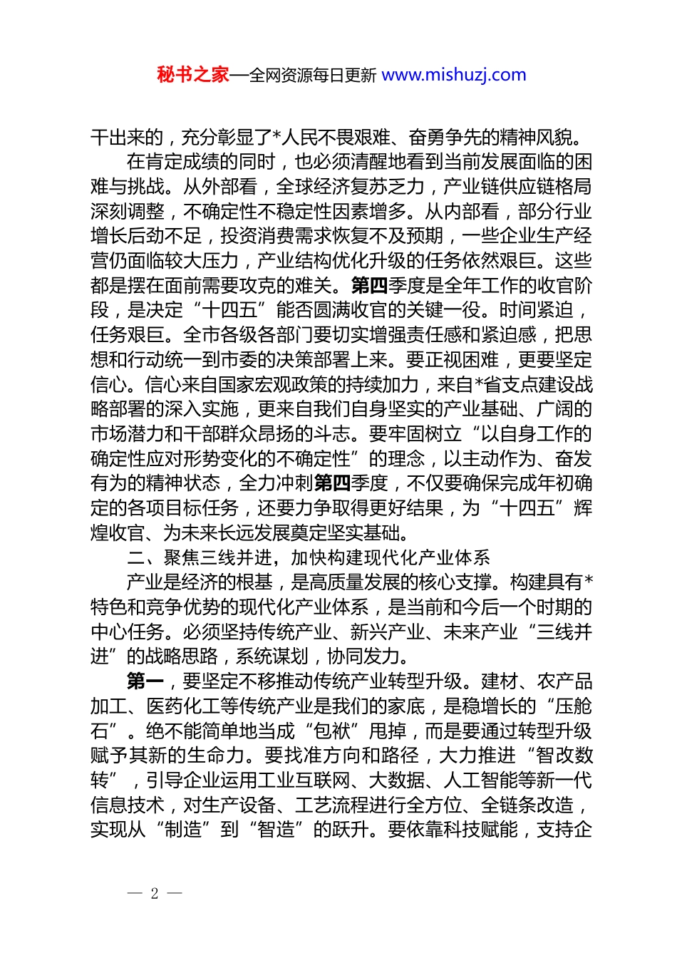 秘书之家—全网资源每日更新 www.mishuzj.com在 2025 年市委常委会(扩大)会议暨三季度县市区委书记座谈会上的讲话同志们:今天召开市委常委会会议(扩大)会议暨三季度县市区委书记座谈会,主要任务是深入学习贯彻习近平总书记考察*省重要讲话精神,全面落实省委常委会(扩大)会议暨三季度市州党委书记座谈会的部署要求,总结分析前三季度全市的经济运行情况,研究部署第四季度的重点工作,动员全市上下进一步坚定信心、咬定目标,以决战姿态全力冲刺,确保完成全年经济社会发展目标任务,为“十四五”规划画上一个圆满的句号。刚才,*同志对前三季度的经济工作做了全面总结,并对第四季度经济运行的具体工作进行了细致安排,我都同意,请大家务必结合各自实际,认真抓好贯彻落实。下面,我再讲几点意见。一、坚定信心决战决胜,确保全年目标圆满收官今年以来,面对复杂严峻的外部环境和艰巨繁重的改革发展稳定任务,全市上下坚持以习近平新时代中国特色社会主义思想为指导,坚决贯彻落实党中央、国务院决策部署和省委、省政府工作要求,奋力推进稳增长、强科技、壮产业、防风险、惠民生等各项工作,取得了来之不易的成绩。从前三季度的数据看,全市经济运行保持了总体平稳、稳中有进的良好态势。前三季度,全市地区生产总值同比增长了 6.2%,规模以上工业增加值增长 7.1%,固定资产投资完成了**亿元,同比增长7.5%,社会消费品零售总额、地方一般公共预算收入等关键指标均实现了稳定增长,城镇居民人均可支配收入达到 38500 元,同比增长 6.8%。这些成绩的取得,是全市干部群众一道拼出来、— 1 —秘书之家—全网资源每日更新 www.mishuzj.com干出来的,充分彰显了*人民不畏艰难、奋勇争先的精神风貌。在肯定成绩的同时,也必须清醒地看到当前发展面临的困难与挑战。从外部看,全球经济复苏乏力,产业链供应链格局深刻调整,不确定性不稳定性因素增多。从内部看,部分行业增长后劲不足,投资消费需求恢复不及预期,一些企业生产经营仍面临较大压力,产业结构优化升级的任务依然艰巨。这些都是摆在面前需要攻克的难关。第四季度是全年工作的收官阶段,是决定“十四五”能否圆满收官的关键一役。时间紧迫,任务艰巨。全市各级各部门要切实增强责任感和紧迫感,把思想和行动统一到市委的决策部署上来。要正视困难,更要坚定信心。信心来自国家宏观政策的持续加力,来自*省支点建设战略部署的深入实施,更来自我们自身坚实的产业基础、广阔的市场潜力和干部群众昂扬的斗志。要牢固树立“以自身工作的确定性应对形势变化的不确定性”的理念,以主动作为、奋发有为的精神状态,全力冲刺第四季度,不仅要确保完成年初确定的各项目标任务,还要力争取得更好结果,为“十四五”辉煌收官、为未来长远发展奠定坚实基础。二、聚焦三线并进,加快构建现代化产业体系产业是经济的根基,是高质量发展的核心支撑。构建具有*特色和竞争优势的现代化产业体系,是当前和今后一个时期的中心任务。必须坚持传统产业、新兴产业、未来产业“三线并进”的战略思路,系统谋划,协同发力。第一,要坚定不移推动传统产业转型升级。建材、农产品加工、医药化工等传统产业是我们的家底,是稳增长的“压舱石”。绝不能简单地当成“包袱”甩掉,而是要通过转型升级赋予其新的生命力。要找准方向和路径,大力推进“智改数转”,引导企业运用工业互联网、大数据、人工智能等新一代信息技术,对生产设备、工艺流程进行全方位、全链条改造,实现从“制造”到“智造”的跃升。要依靠科技赋能,支持企— 2 —秘书之家—全网资源每日更新 www.mishuzj.com业建立研发中心,与高校院所开展产学研合作,攻克一批关键核心技术。要着力延长产业链条,推动产品创新,下大力气改变长期以来“卖原料”“卖初级产品”的局面,向精深加工、品牌塑造、高端应用等价值链高端环节延伸,不断提升产品附加值和市场竞争力。第二,要集中资源推动新兴产业做强做大。光电子信息、高端装备制造、再生资源利用、新能源等新兴产业是*实现换道超车、培育新动能的主攻方向。要突出优势领域,进一步明确各产业集群的主导方向和发...