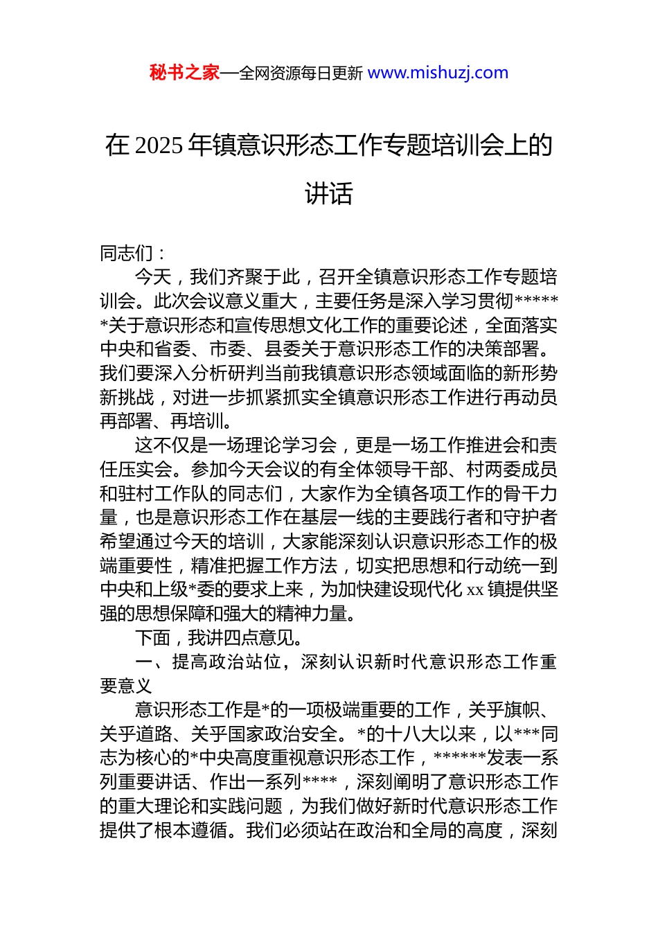 秘书之家—全网资源每日更新 www.mishuzj.com在 2025 年镇意识形态工作专题培训会上的讲话同志们:今天,我们齐聚于此,召开全镇意识形态工作专题培训会。此次会议意义重大,主要任务是深入学习贯彻******关于意识形态和宣传思想文化工作的重要论述,全面落实中央和省委、市委、县委关于意识形态工作的决策部署。我们要深入分析研判当前我镇意识形态领域面临的新形势新挑战,对进一步抓紧抓实全镇意识形态工作进行再动员再部署、再培训。这不仅是一场理论学习会,更是一场工作推进会和责任压实会。参加今天会议的有全体领导干部、村两委成员和驻村工作队的同志们,大家作为全镇各项工作的骨干力量,也是意识形态工作在基层一线的主要践行者和守护者希望通过今天的培训,大家能深刻认识意识形态工作的极端重要性,精准把握工作方法,切实把思想和行动统一到中央和上级*委的要求上来,为加快建设现代化 xx 镇提供坚强的思想保障和强大的精神力量。下面,我讲四点意见。一、提高政治站位,深刻认识新时代意识形态工作重要意义意识形态工作是*的一项极端重要的工作,关乎旗帜、关乎道路、关乎国家政治安全。*的十八大以来,以***同志为核心的*中央高度重视意识形态工作,******发表一系列重要讲话、作出一系列****,深刻阐明了意识形态工作的重大理论和实践问题,为我们做好新时代意识形态工作提供了根本遵循。我们必须站在政治和全局的高度,深刻秘书之家—全网资源每日更新 www.mishuzj.com领会其核心要义和实践要求。(一)意识形态工作是巩固*的执政根基的必要之举。人心是最大的政治,意识形态决定文化前进方向和发展道路,对一个政*、一个国家、一个民族的生存和发展至关重要。历史和现实反复证明,能否做好意识形态工作,事关*的前途命运,事关国家长治久安,事关民族凝聚力和向心力。当前,我们正处在实现中华民族伟大复兴的关键时期内外环境复杂多变,思想文化领域交流交融交锋更加频繁我镇作为基层乡镇,处于各种思潮和观念的交汇点,各种思想观念相互碰撞。在这样的背景下,我们必须始终坚持马克思主义在意识形态领域的指导地位,牢牢掌握意识形态工作的领导权、管理权、话语权,不断巩固全*全国各族人民团结奋斗的共同思想基础,才能确保我们的事业始终沿着正确方向前进,*的执政根基在基层得以稳固。(二)意识形态工作是推动 xx 镇高质量发展的现实之需。当前,我镇正处于经济结构调整、社会转型的关键阶段,全镇上下面临着巩固拓展脱贫攻坚成果同乡村振兴有效衔接、推动产业结构优化升级、深化基层治理创新等多重任务。越是发展的关键时期,越需要强大的精神动力和良好的舆论环境。统一的思想、坚定的信心、昂扬的斗志是克服一切艰难险阻、推动事业发展的力量源泉。在乡村振兴的征程中,我们需要通过意识形态工作,让全镇干部群众深刻理解乡村振兴的重大意义和目标任务,激发他们的积极性和创造性。反之,如果思想混乱、杂音噪音不断就会干扰发展大局,甚至迟滞我们的发展步伐。我们必须通过扎实有效的意识形态工作,唱响主旋律,弘扬正能量把全镇上下的思想和行动统一到镇*委、政府的决策部署上来,凝聚起心往一处想、劲往一处使的磅礴力量。(三)意识形态工作是应对风险挑战的紧迫之务。当今世界正经历百年未有之大变局,我们面对的意识形态领域斗争比以往任何时候都更加复杂、更加尖锐。特别是随秘书之家—全网资源每日更新 www.mishuzj.com着互联网技术和新媒体的迅猛发展,信息传播格局发生了深刻变革,人人都有麦克风,人人都是信息源。网络空间已经成为意识形态斗争的主战场、最前沿。一些错误思潮有害信息通过网络快速传播、发酵,对主流价值观造成冲击,对社会稳定构成潜在威胁。对我镇而言,一些涉及征地拆迁、项目建设、环境治理、民生保障等方面的矛盾和问题,如果处置不当,极易被放大炒作,演变为网络舆情事件,损害政府公信力和地区形象。例如,在一些涉及民生的项目建设中,如果群众对政策不理解,再加上别有用心的人在网络上恶意炒作,就可能引发不必要的社会不稳定因素。因此,我们必须保持清醒头脑,增强忧患意识,下好先手棋、打好主动仗...